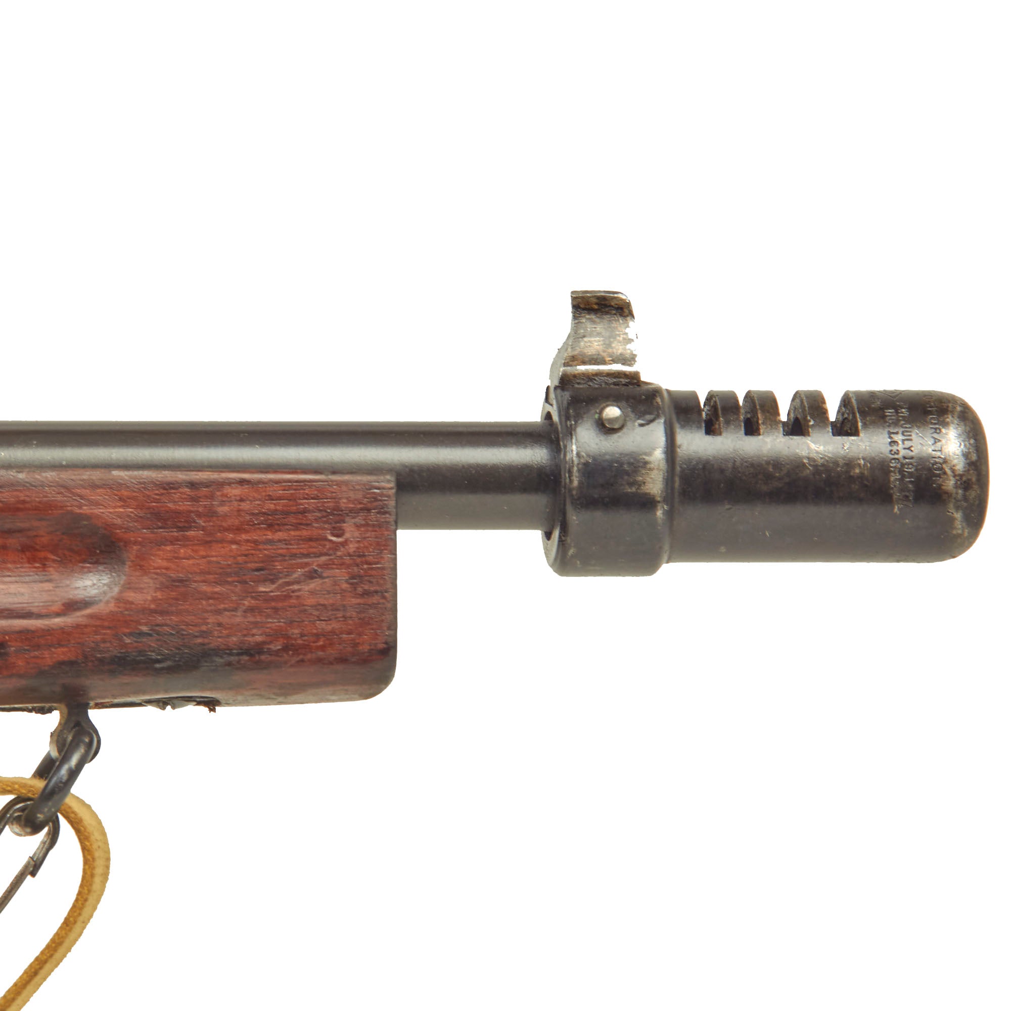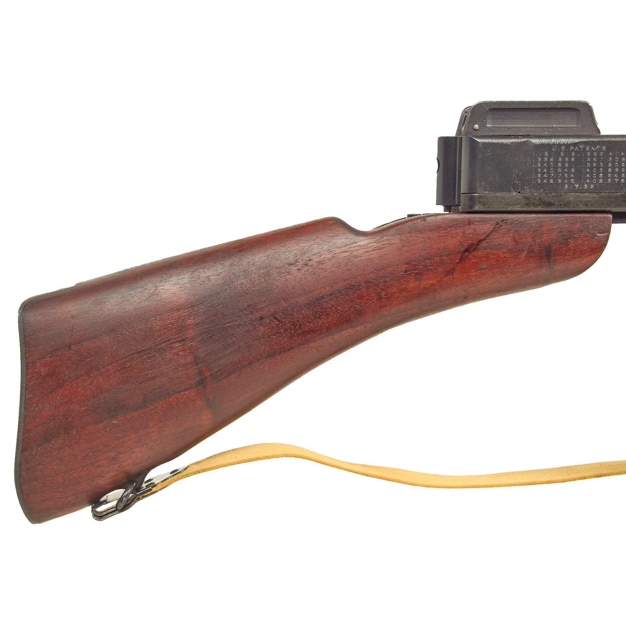 This example is typical of the early ear issue Thompson M1928A1, with the more delicate adjustable Lyman Sight, and 20 round magazine. It also has the early style buttstock, without the reinforcement bolt, and correct machined sling swivel mount. It has beautifully finished walnut furniture that has that red brown color only achieved after years of age. Tt is fitted with a reproduction Kerr Extension Gun Sling to complete the look.