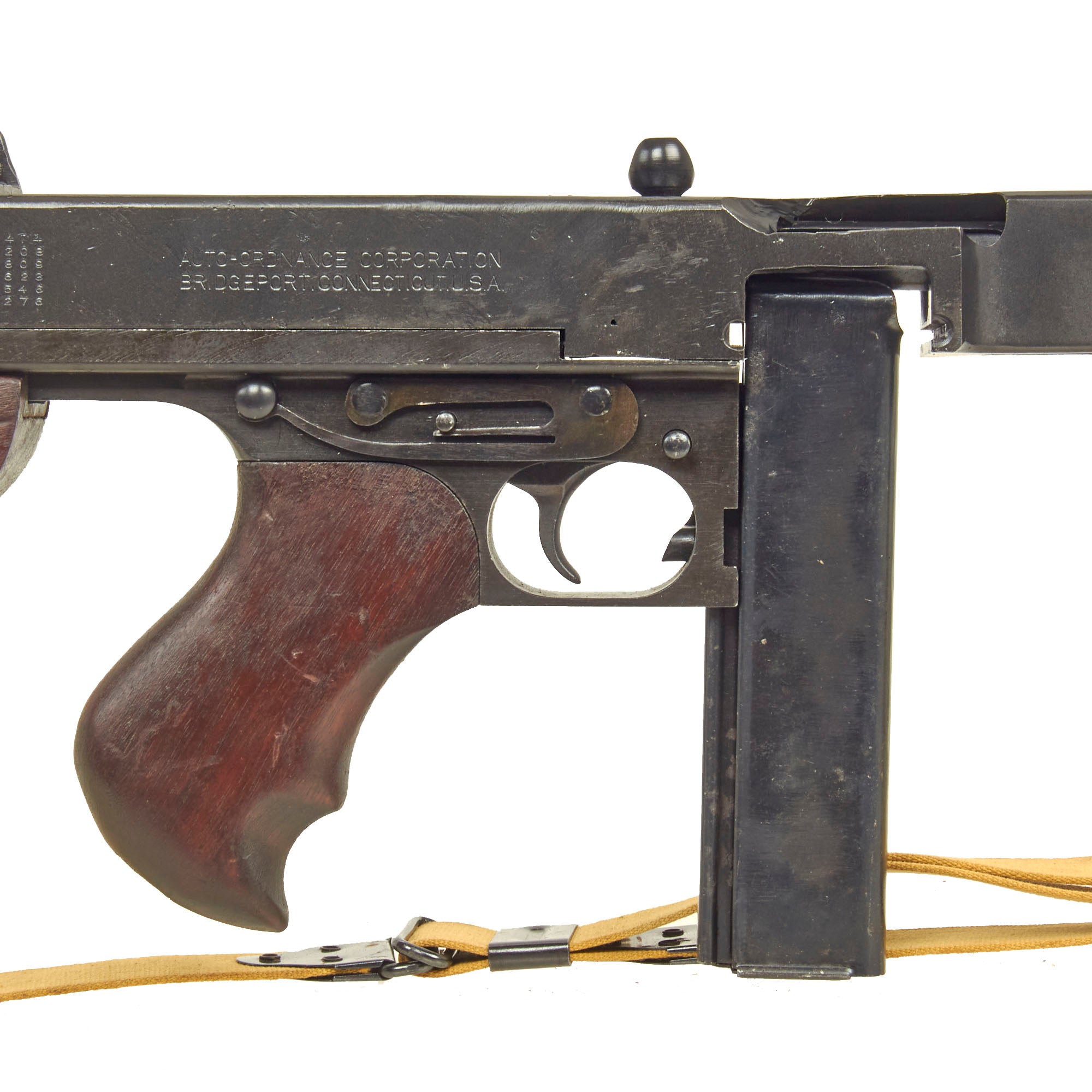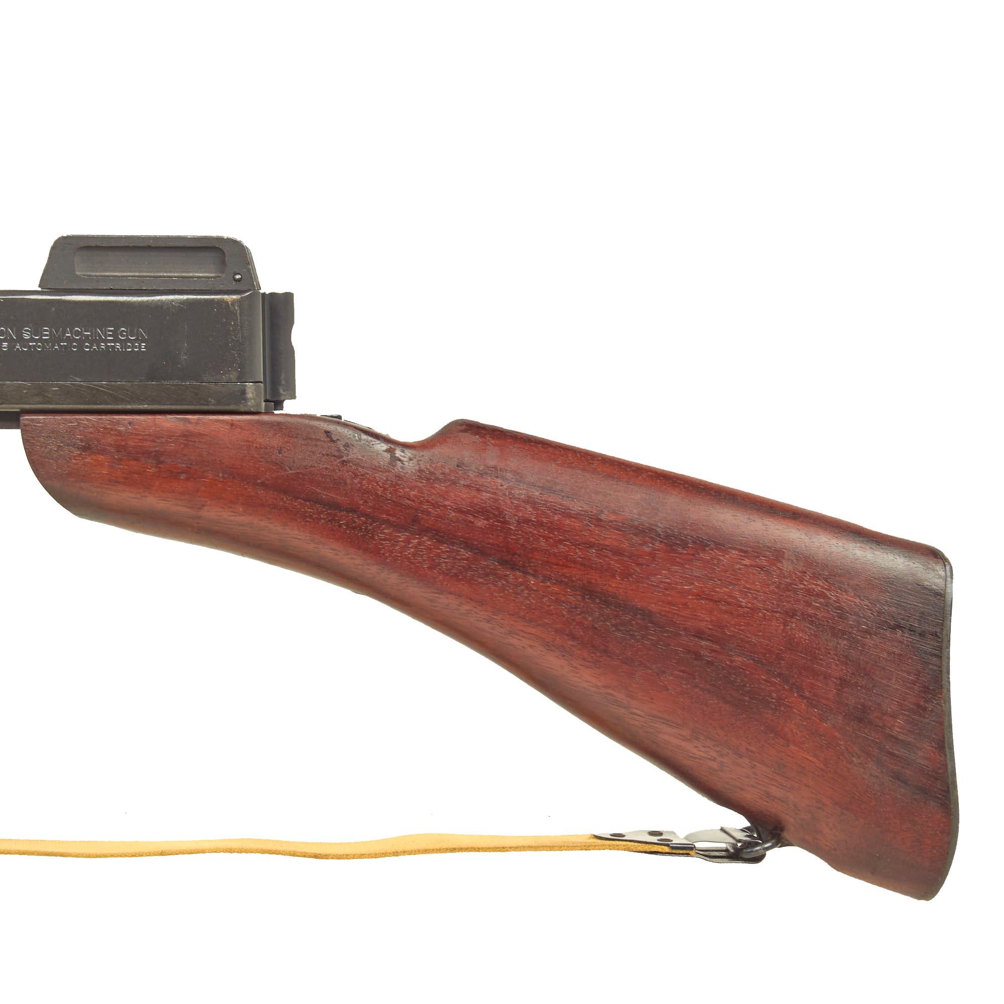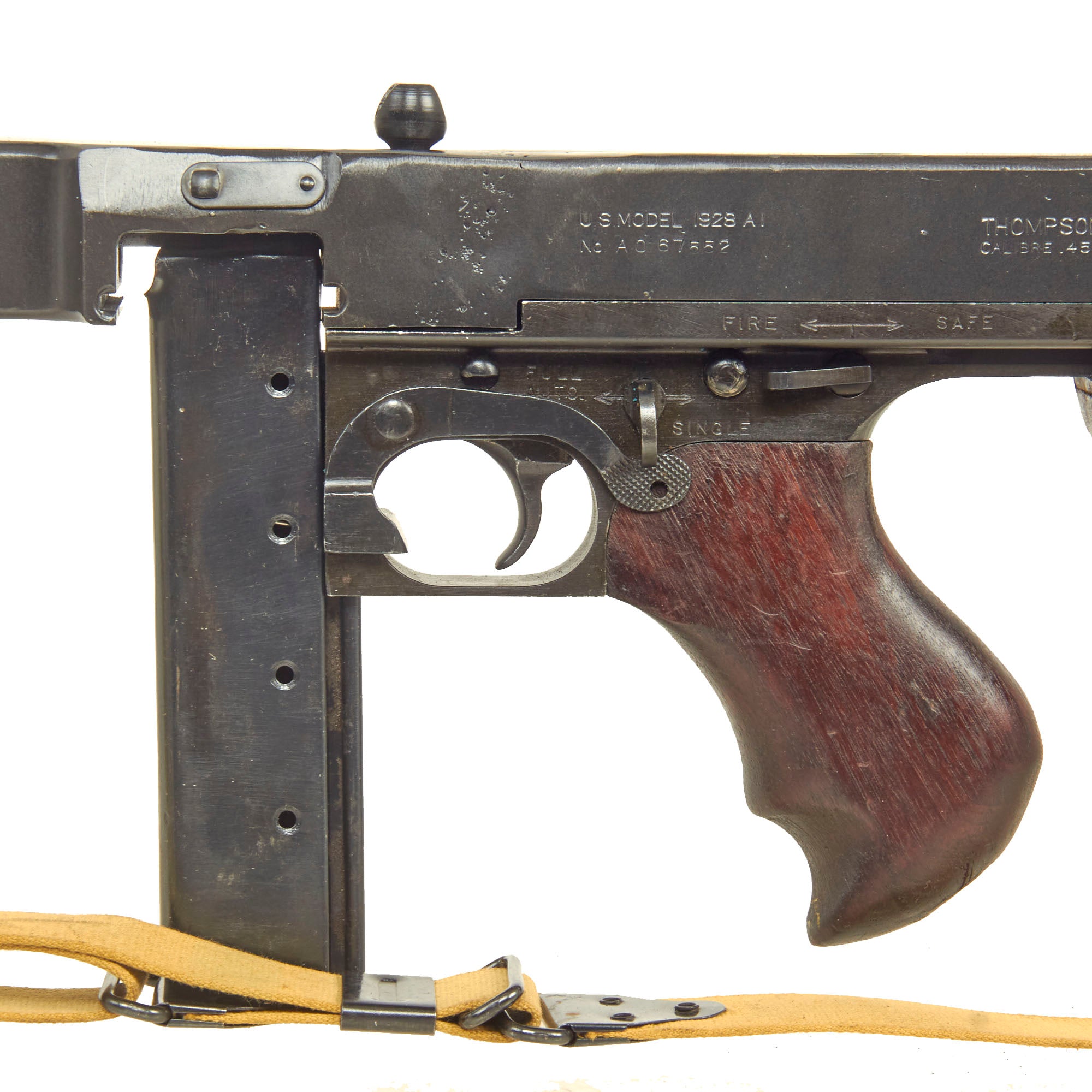 Original Item: Only One Available. This is a magnificent display gun built from excellent genuine WWII Thompson M-1928 parts and reassembled with a beautiful non-firing BATF approved original reassembled WWII issue Thompson receiver. Every part on this display gun is original WWII manufacture other than 20% of the receiver replaced by solid steel (as required by BATF).