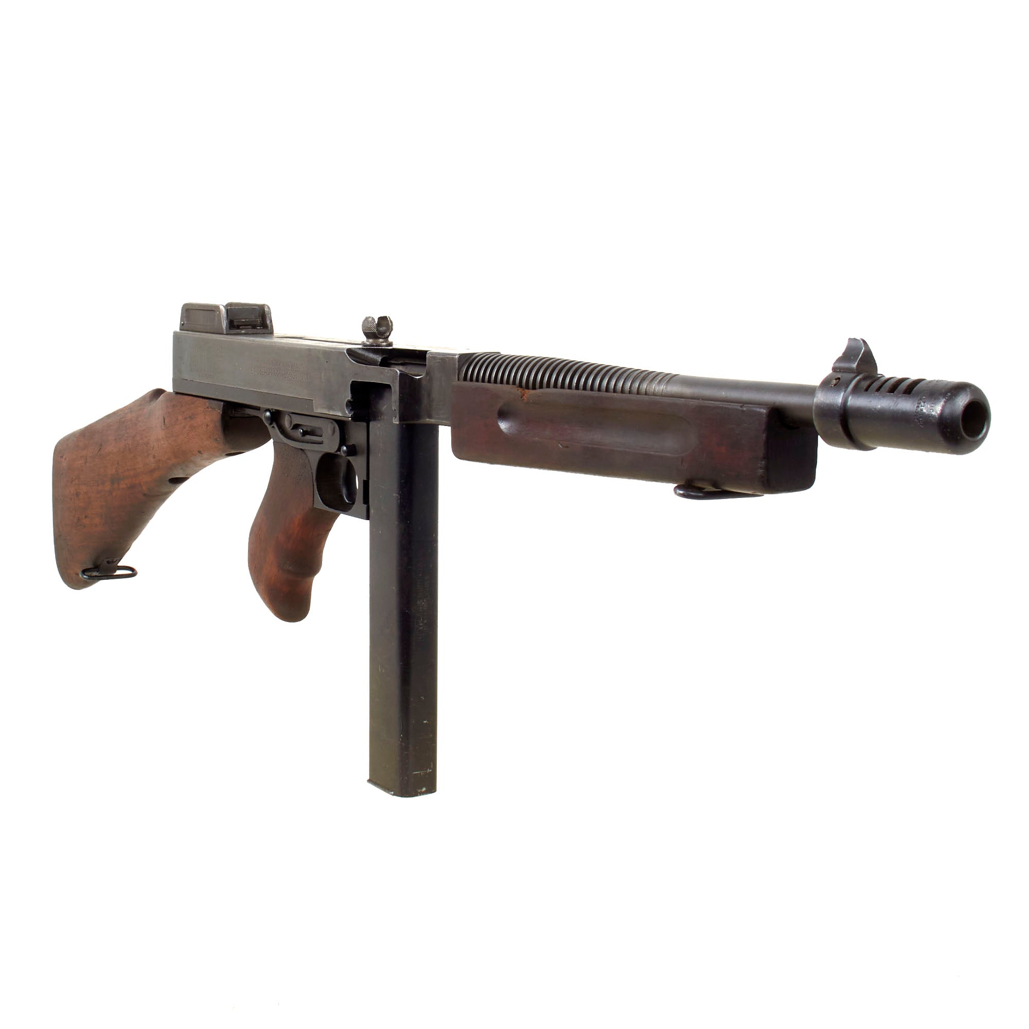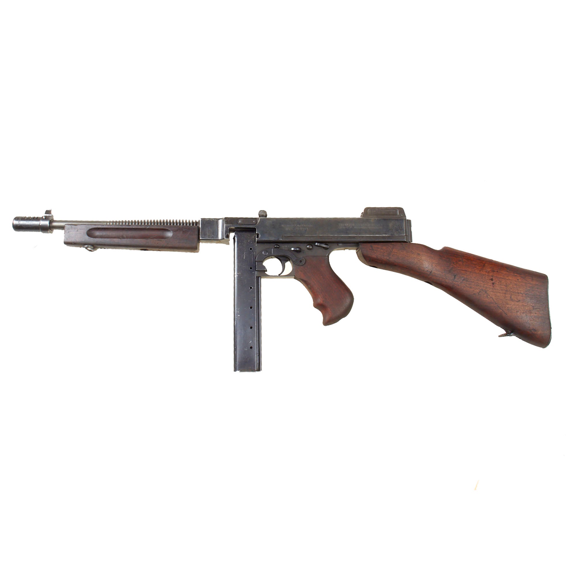 The Thompson 1928 sub machine gun is perhaps the most recognizable firearm of World War II, made famous by the Airborne Troops of the 101st and 82nd Airborne Divisions. This military model differs from the original commercial model in its 20 round magazine and its horizontal foregrip. Though heavy by today's standards, the weight helped control the .45 caliber bursts when operated on full automatic.