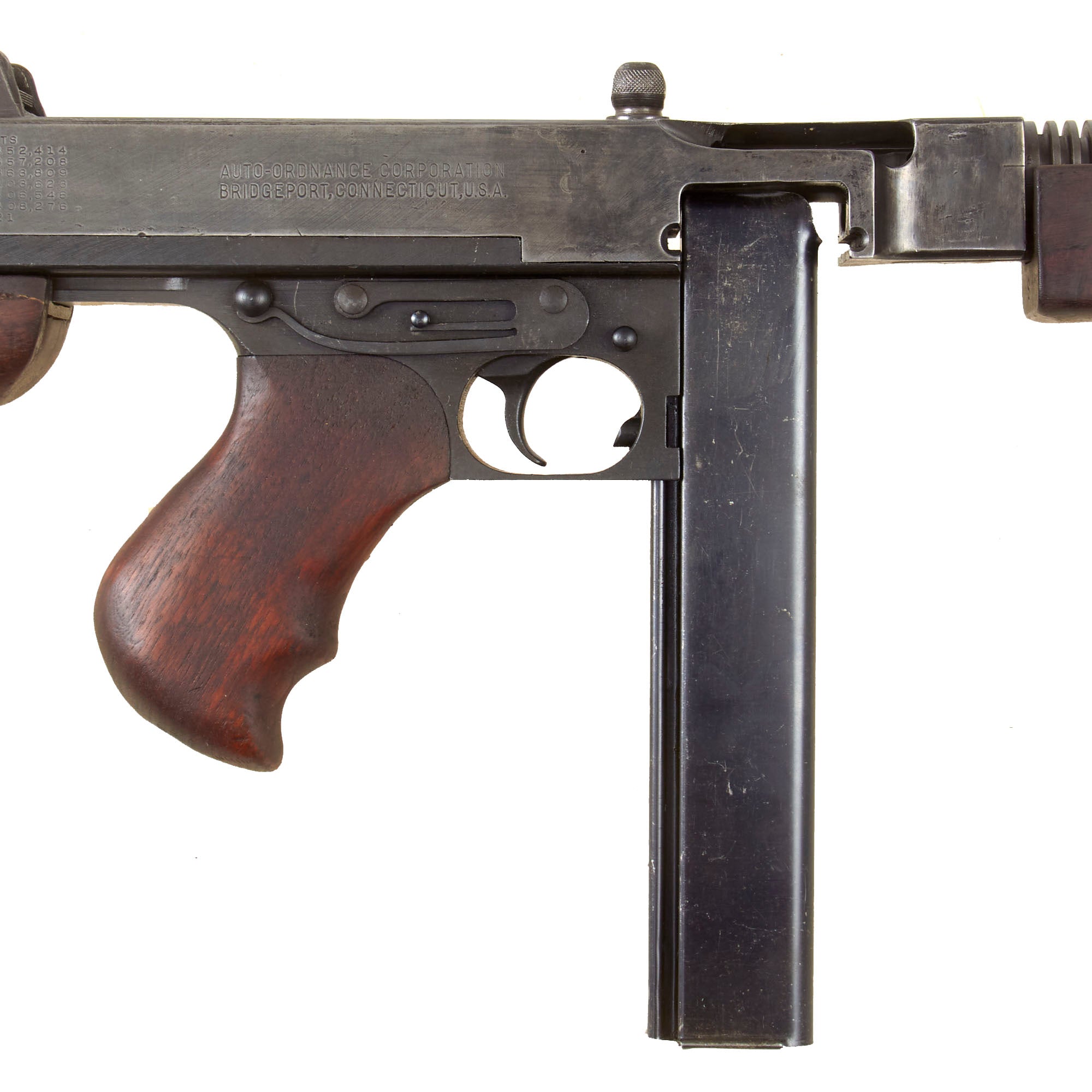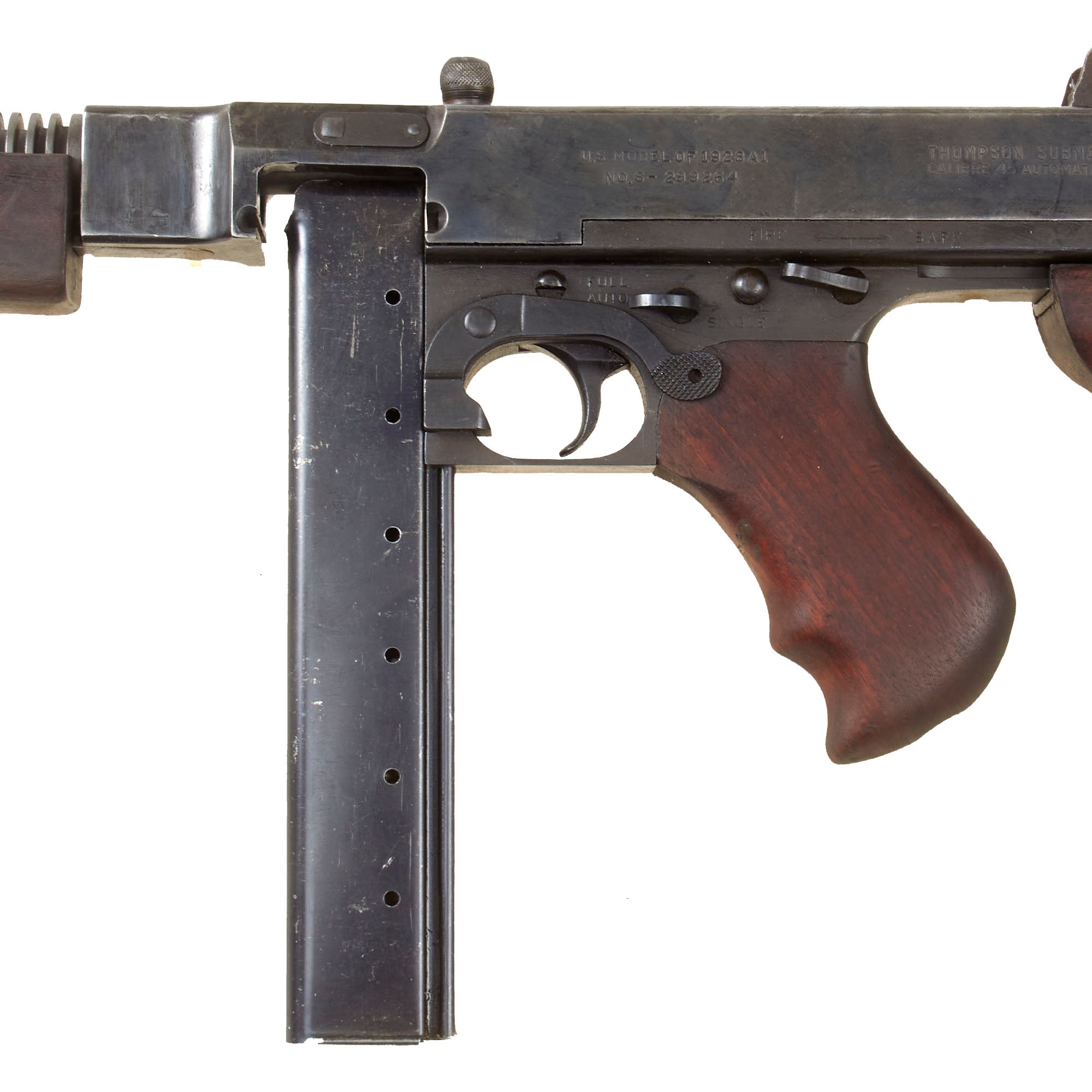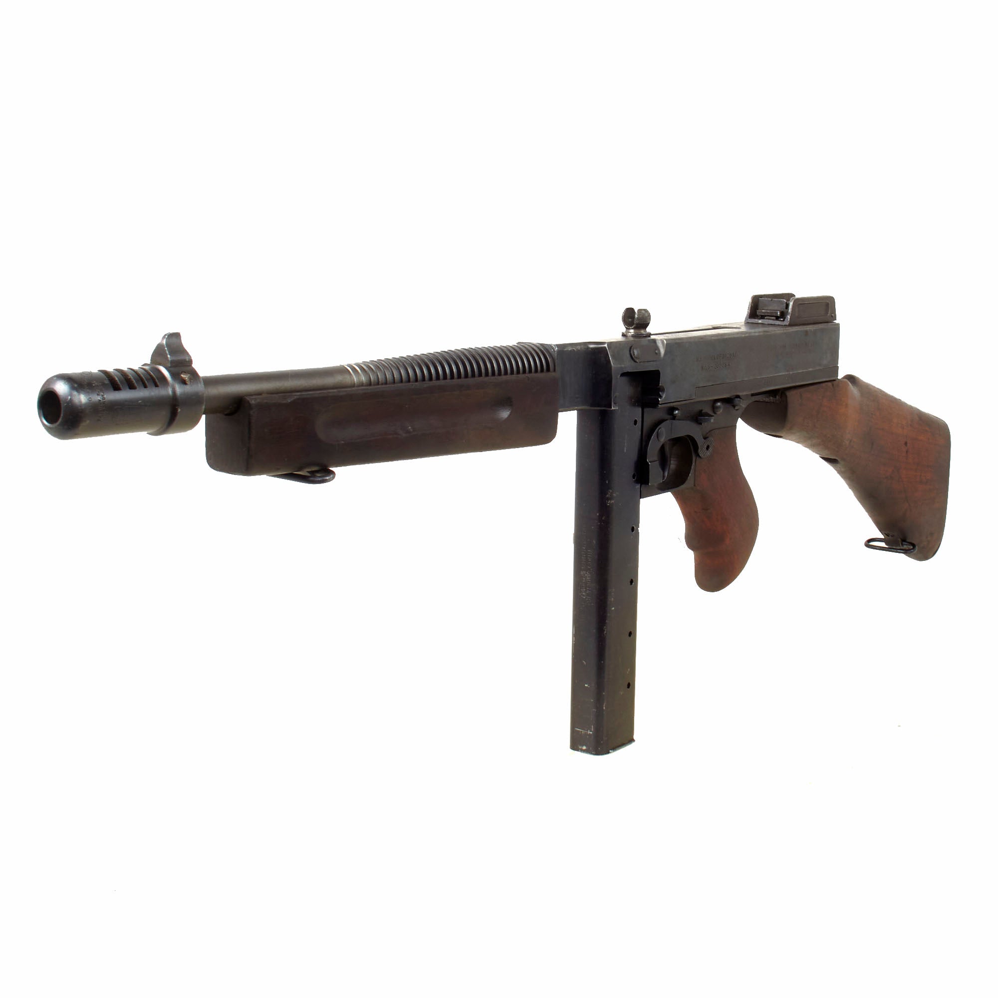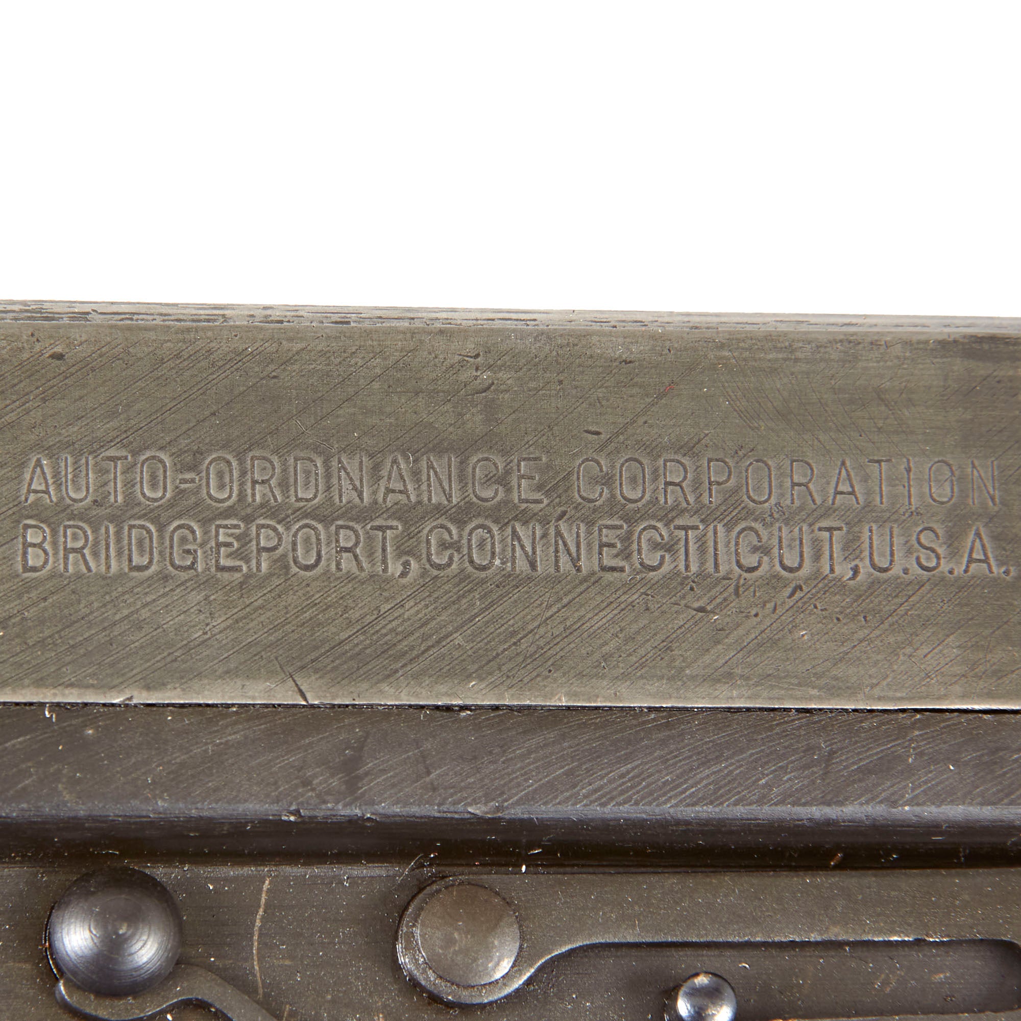 Original Item: Only One Available. This is a magnificent WWII Thompson M1928A1 Display Gun, built from all original WWII issue Thompson parts on an original BATF compliant non-firing display receiver, making this a 100% legal display Sub-Machine gun. This receiver was created by using portions of the original torch cut demilitarized receiver, which had at least 1/4" material removed per each cut, as required. These portions, including the front barrel bushing, were combined with some new made solid steel portions.