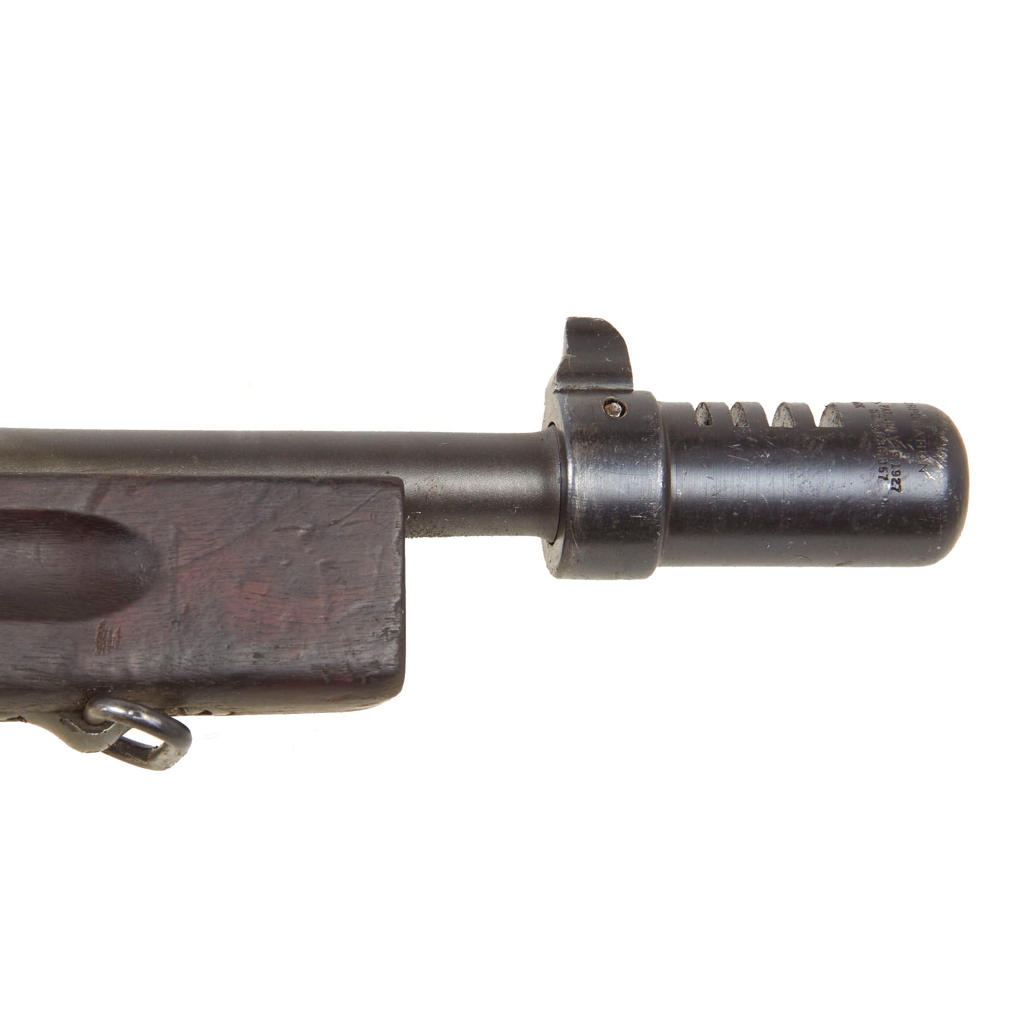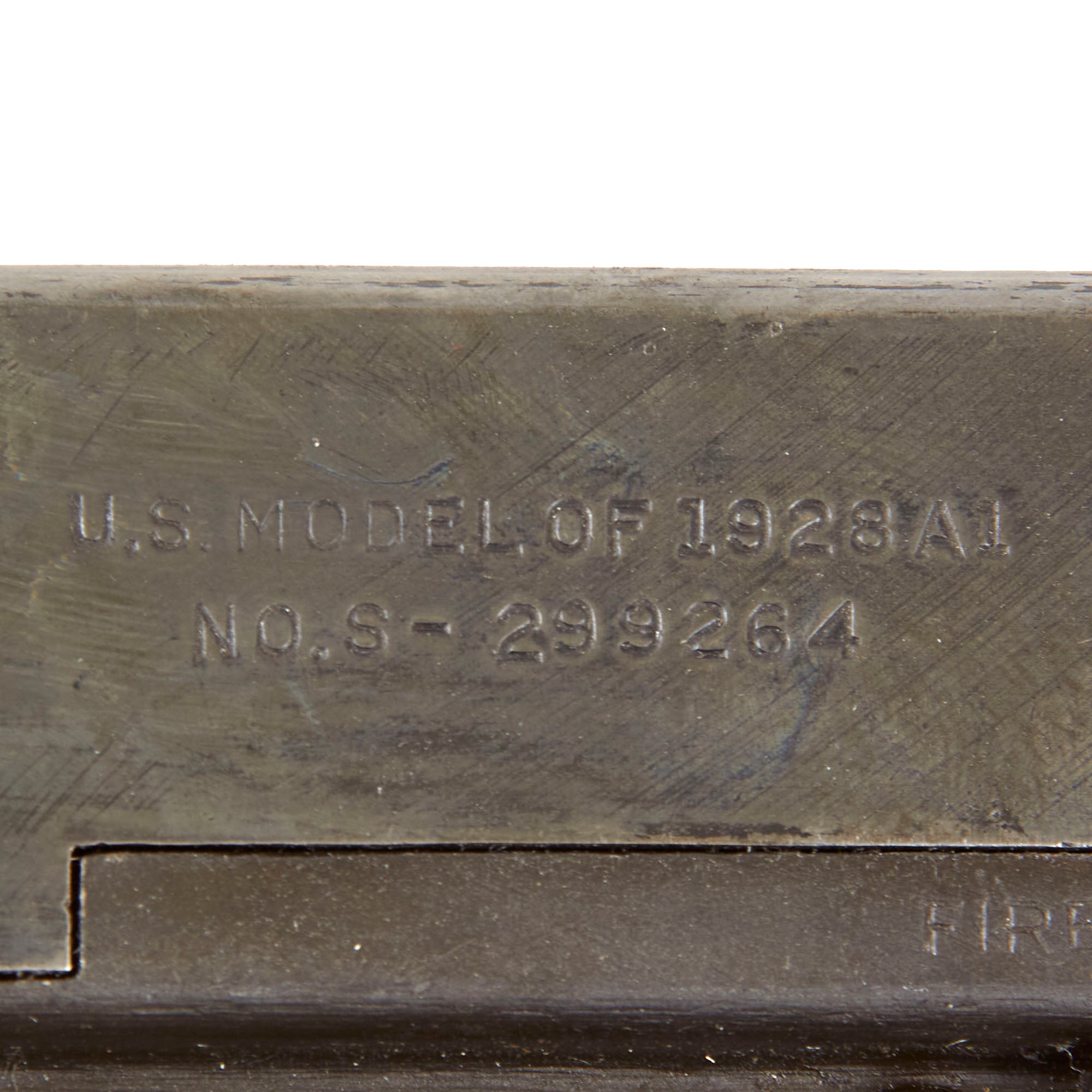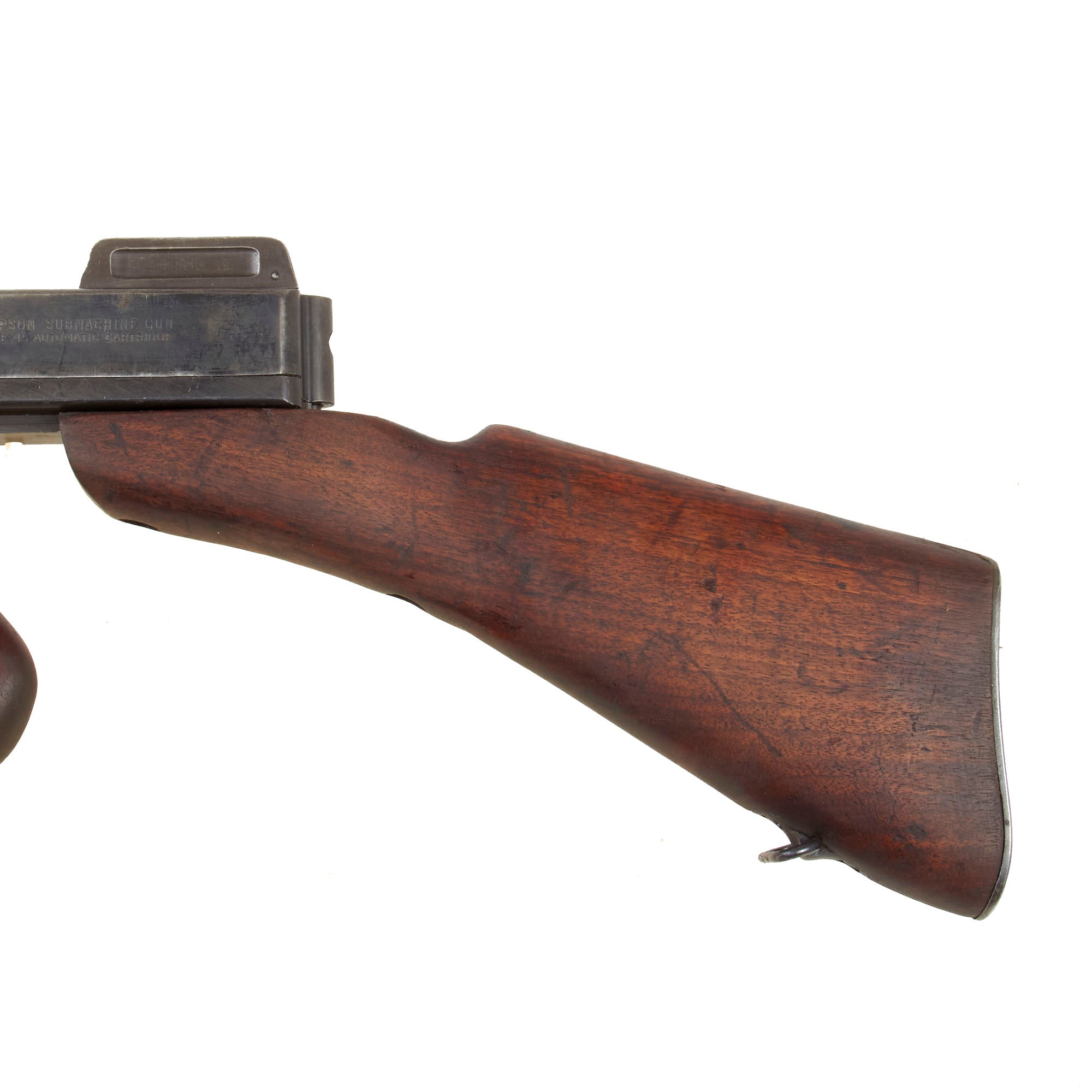 This example is typical of the early war issue Thompson M1928A1, with the more delicate adjustable Lyman Sight. It also has the early style buttstock, without the reinforcement bolt, and the sling swivel mounts are both the correct machined steel type. It has beautifully finished walnut furniture that has that red brown color only achieved after years of age, showing some great service wear on the fore grip and butt stock. The metalwork has a lovely aged patina, still retaining a lot of the original finish, while also showing wear from service.