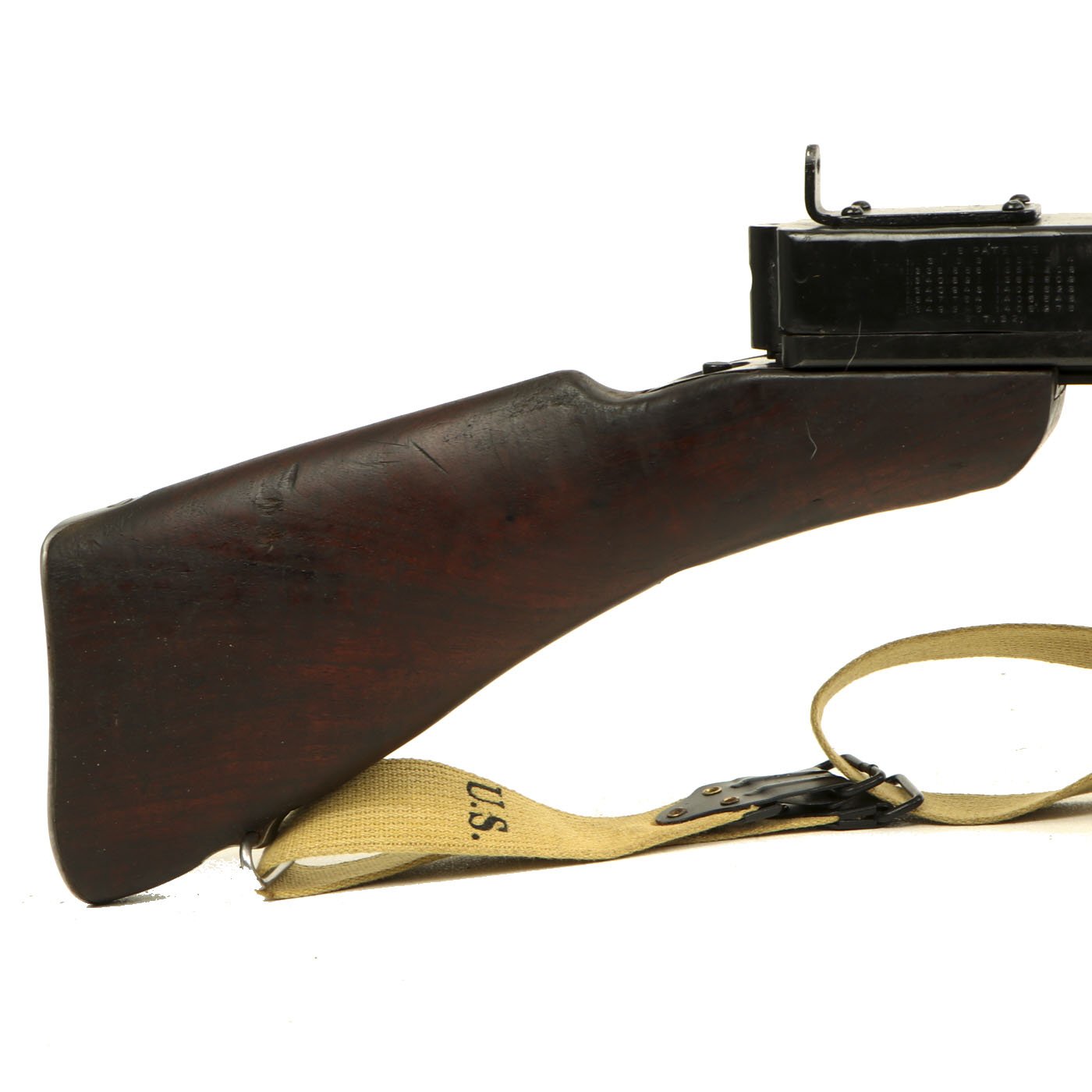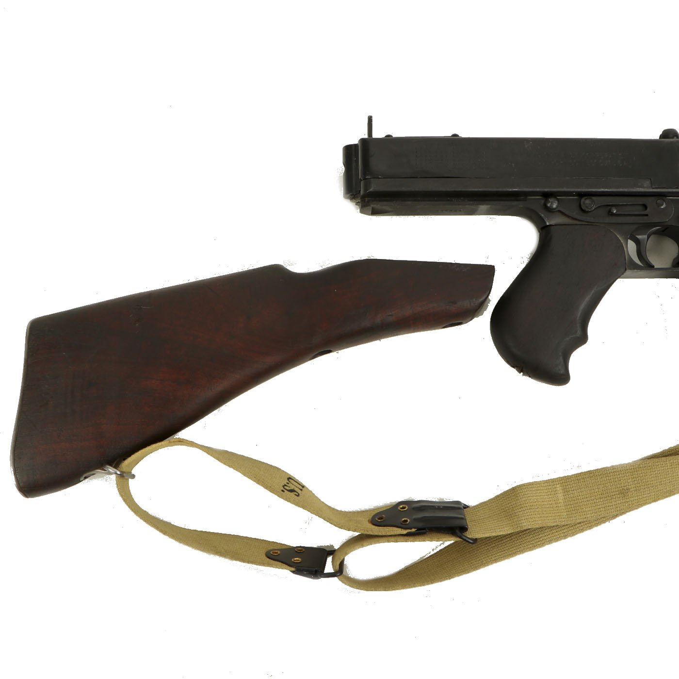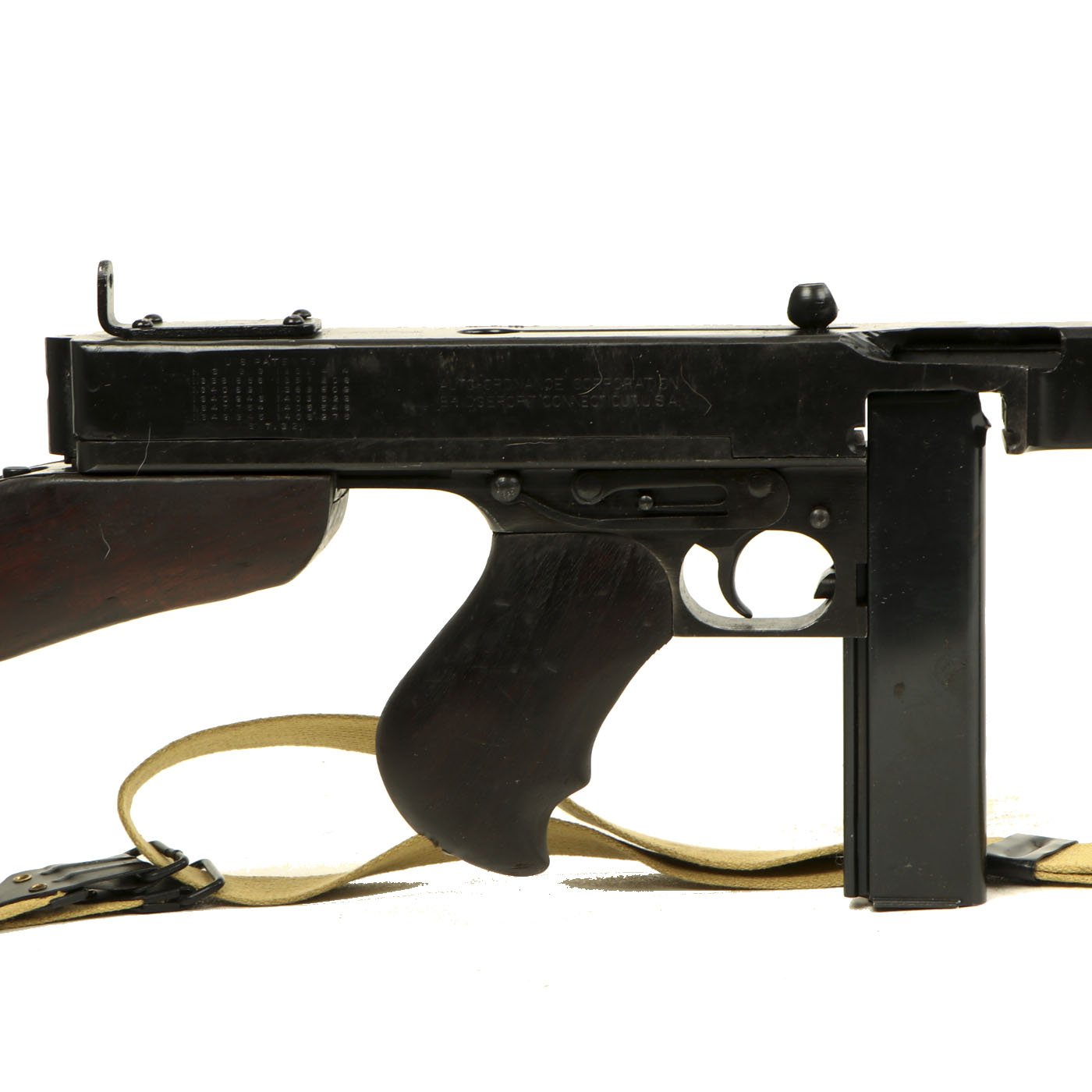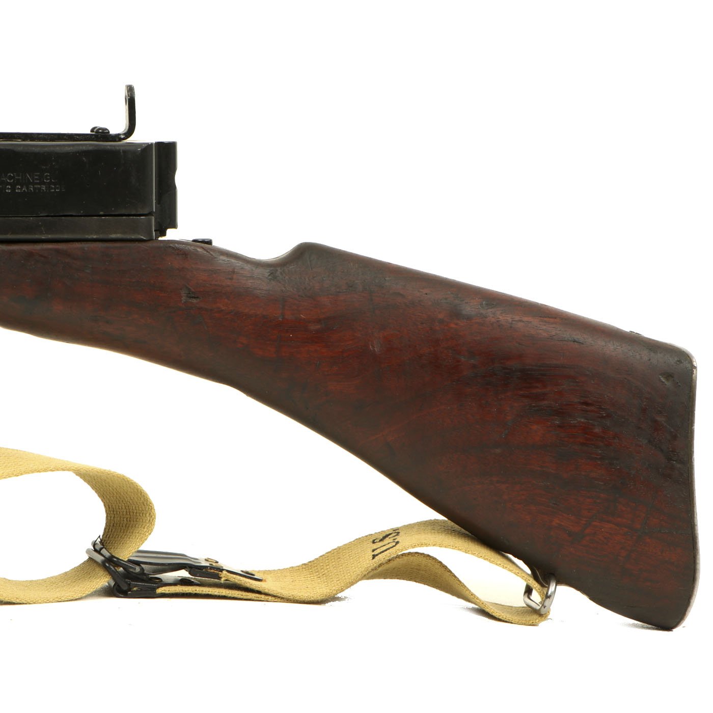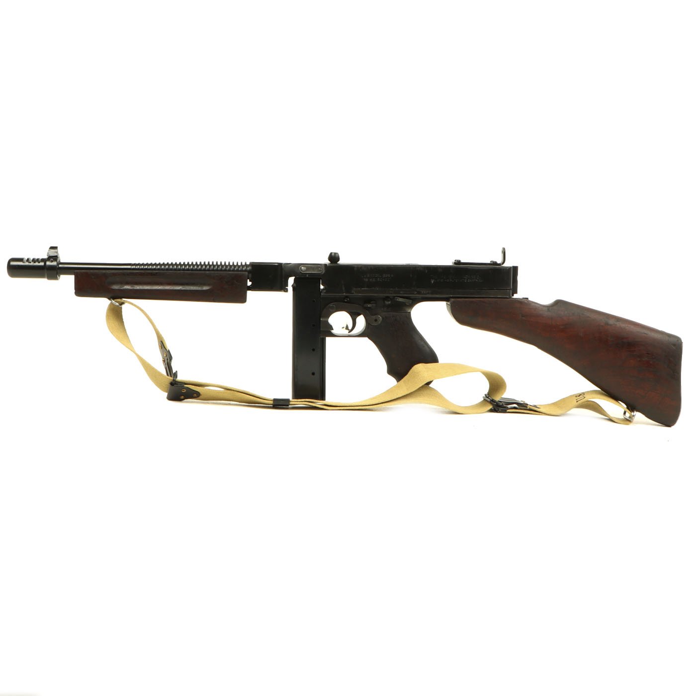 Original Item: Only One Available. As used in the film "Saving Private Ryan" this is a magnificent display gun built from excellent genuine WWII Thompson M-1928 parts and reassembled with a beautiful non-firing permanently deactivated ATF approved original reassembled WWII issue Thompson receiver. Every part on this display gun is original WW2 manufacture other than ATF approved non-functional receiver. This example has also been fitted with an early-issue Lyman Adjustable sight, and not the later stamped steel L-sight, and comes with one of our reproduction Thompson Kerr adjustable slings.