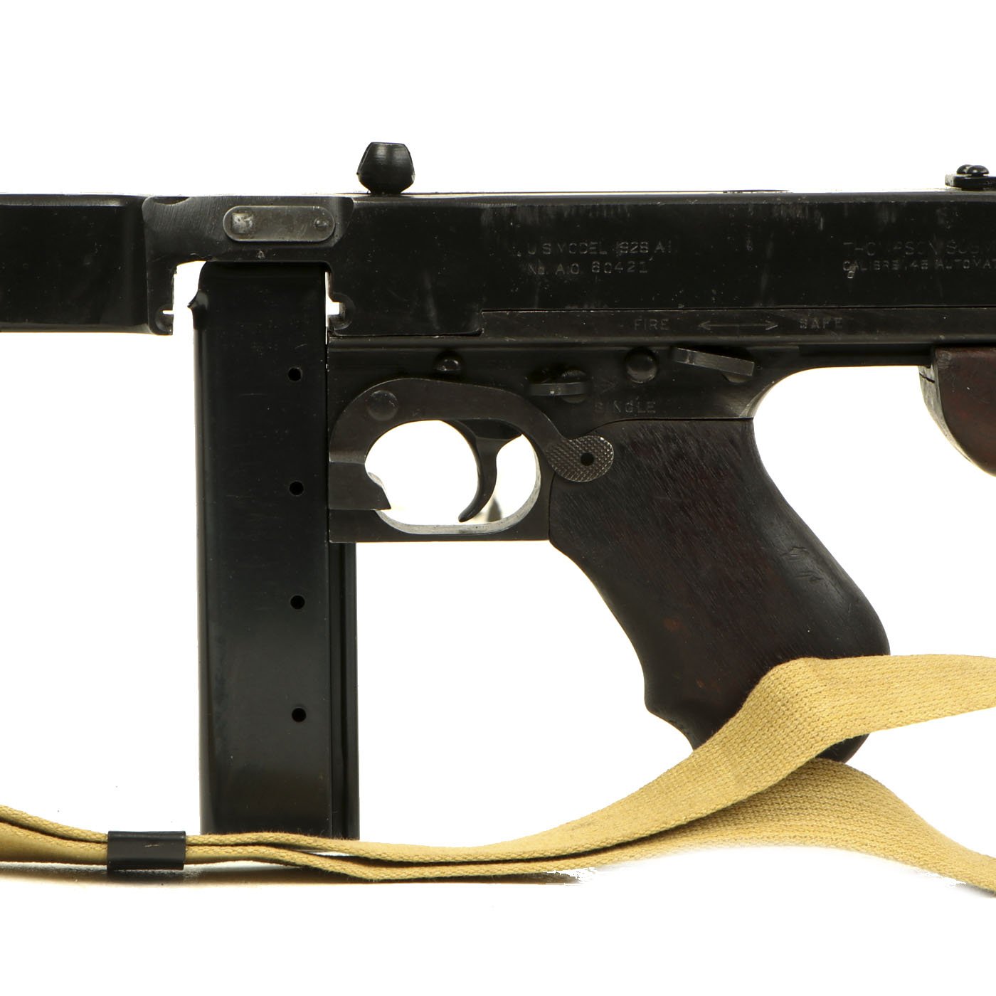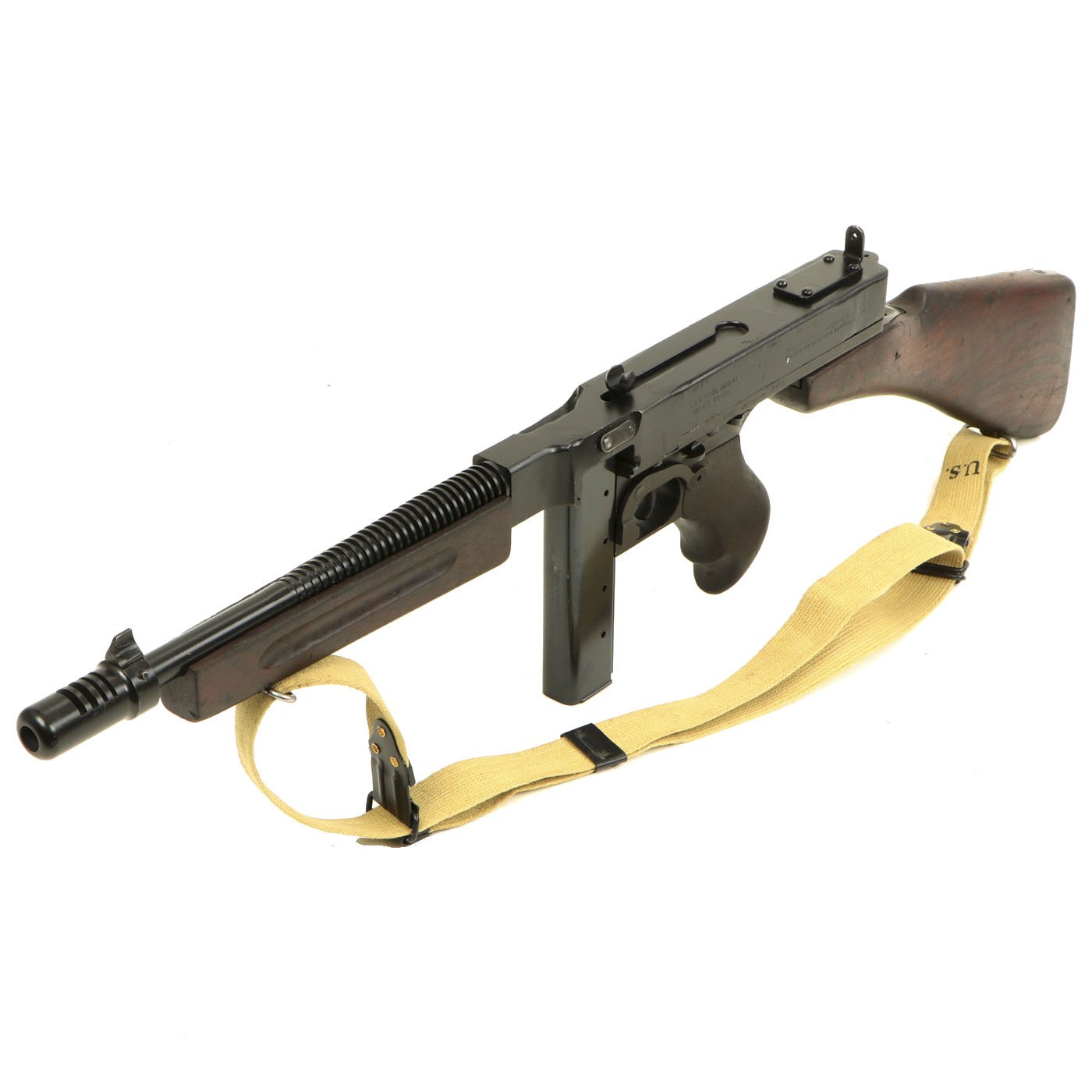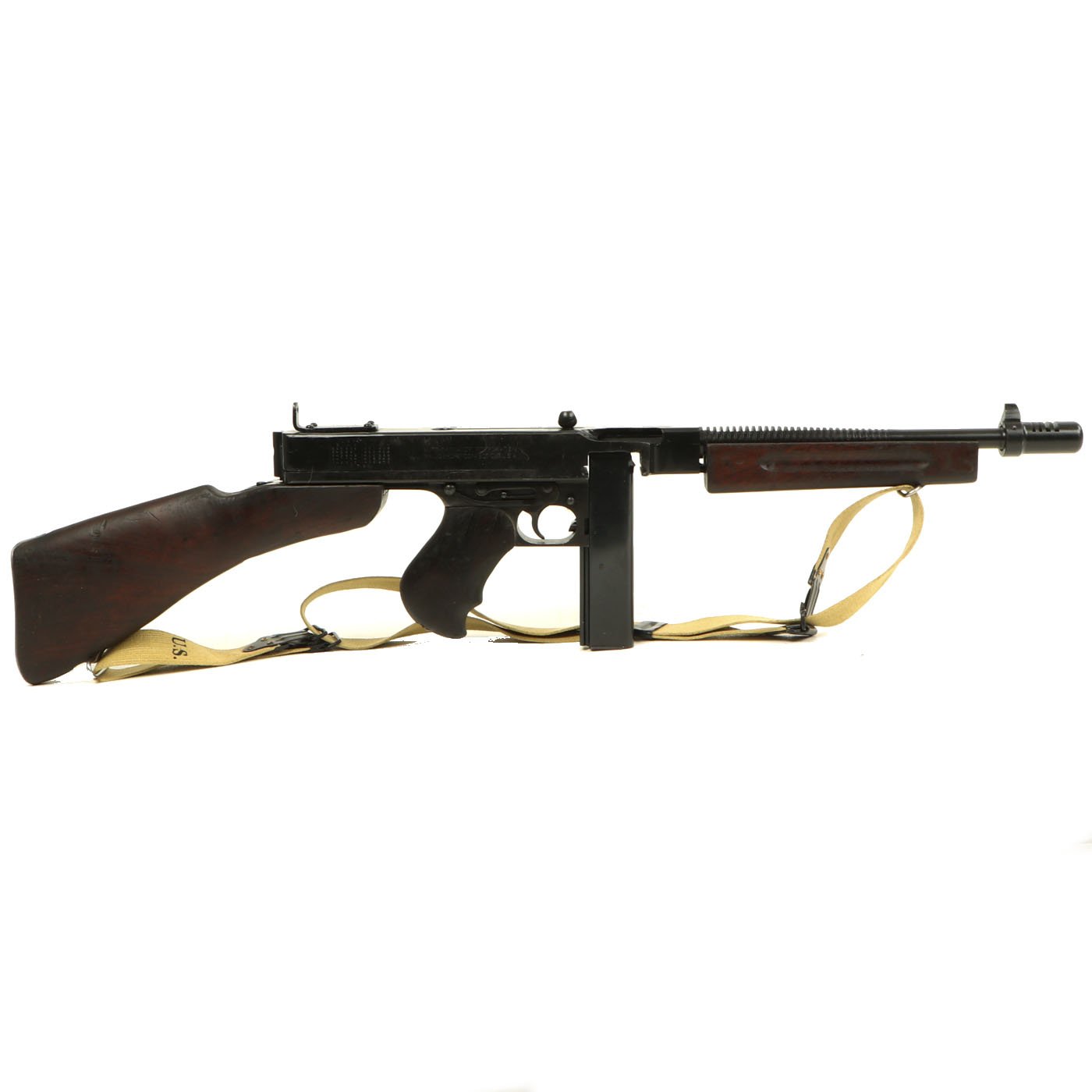 The Thompson 1928 sub machine gun is perhaps the most recognizable firearm of World War II, made famous by the Airborne Troops of the 101st and 82nd Airborne Divisions. This military model differs from the original commercial model in its 20 round magazine and its horizontal foregrip. Though heavy by today's standards, the weight helped control the .45 caliber bursts when operated on full automatic.