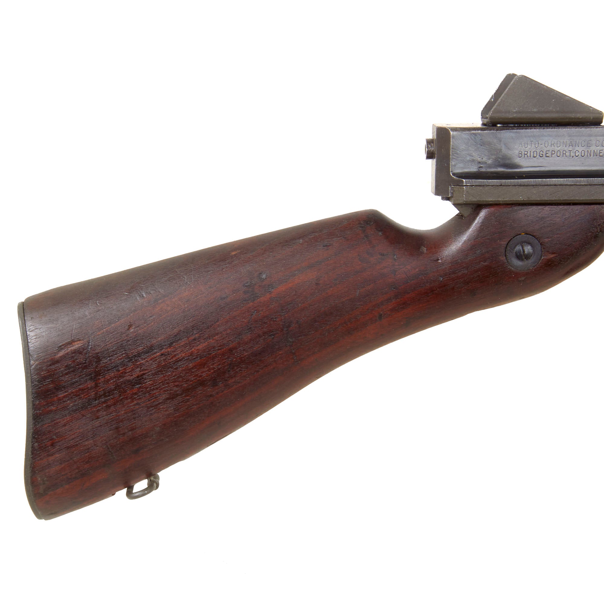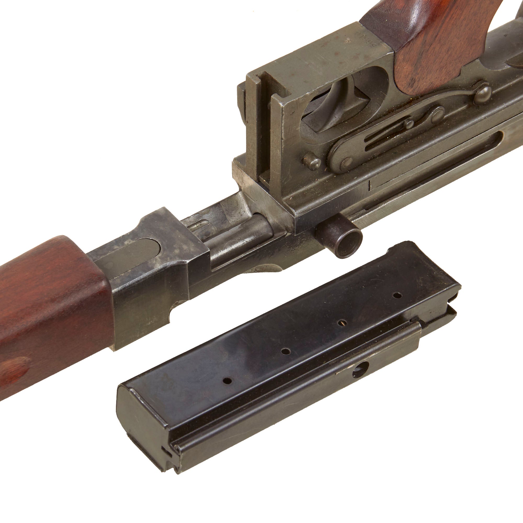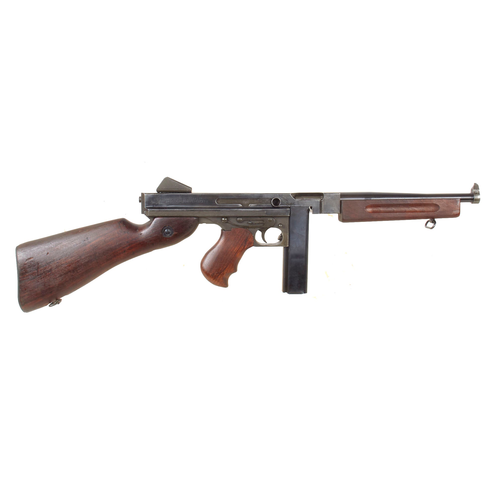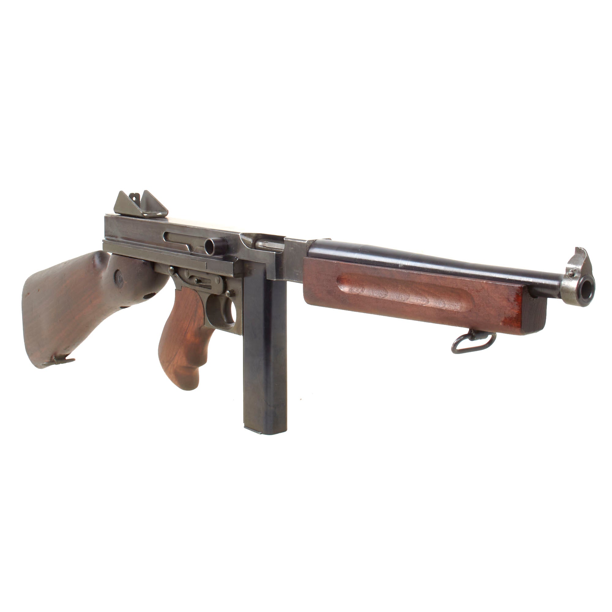 Original Item: Only One Available. This is a magnificent Thompson M1 display gun built from excellent genuine WWII parts and reassembled with a beautiful non-firing BATF approved original reassembled WWII issue Thompson receiver, making this a 100% legal display Sub-Machine gun. This receiver was created by using portions of the original torch cut demilitarized receiver, which had at least 1/4" material removed per each cut, as required. These portions, including the front barrel bushing, were combined with some new made solid steel portions. The original bolt has been deactivated and placed inside the receiver in the forward position.