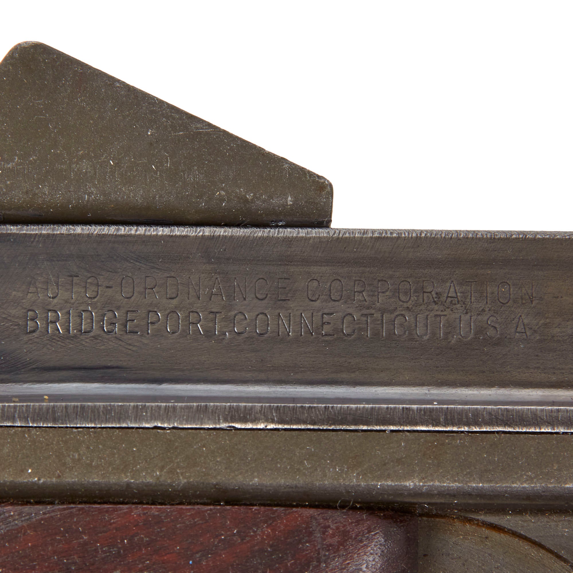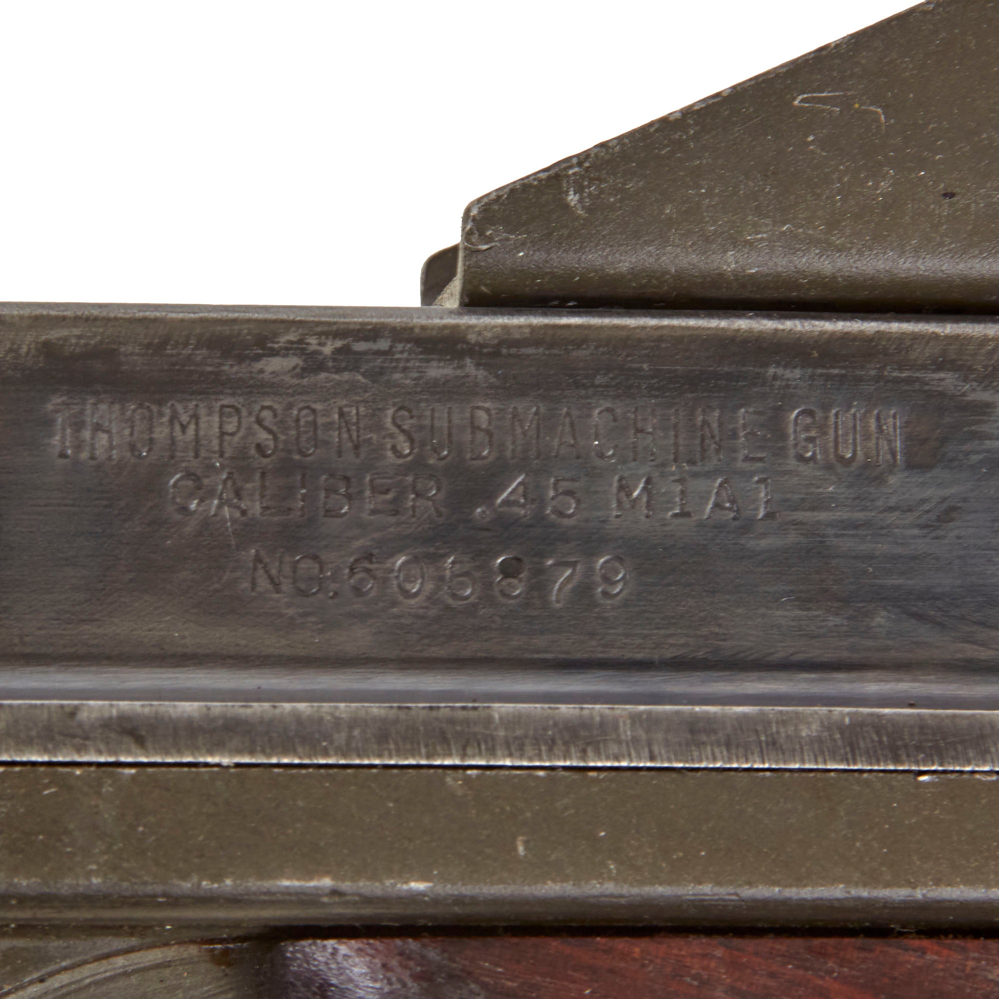 - ATF compliant Thompson M1A1 marked non-firing receiver, complete with original maker and arsenal markings, including the manufacturer name AUTO-ORDNANCE, the Thompson "Bullet" Logo, and with serial NO. 605879. The "A1" is not a separate stamping, so this was made once the new stamping dies were made. Really some great markings on this receiver!