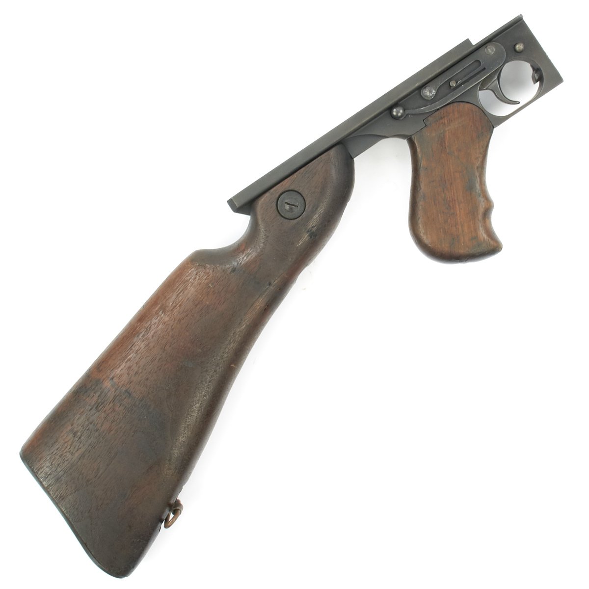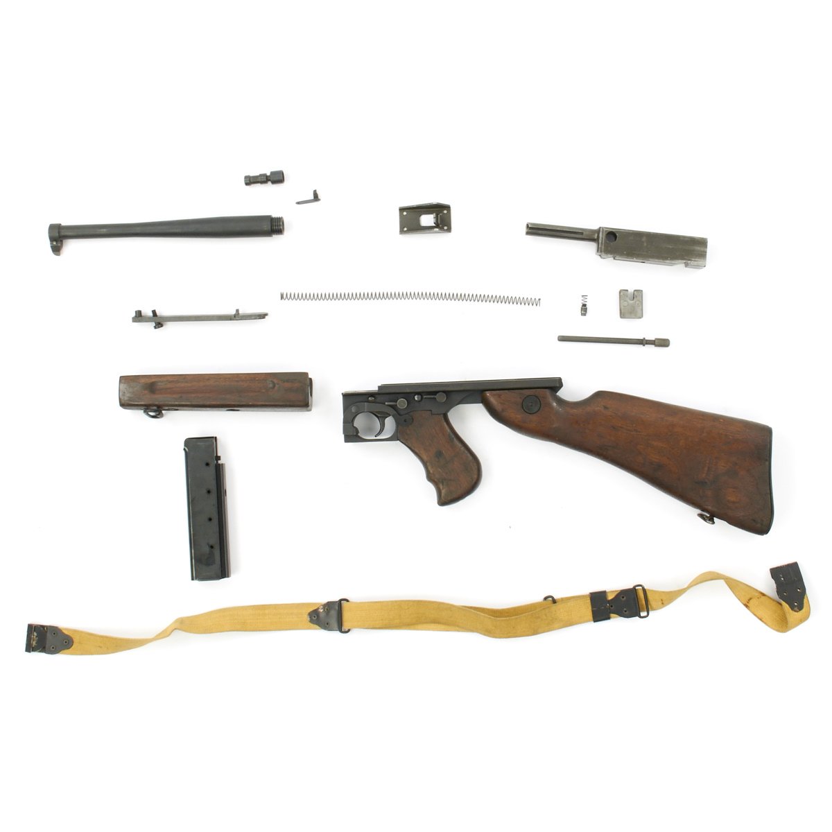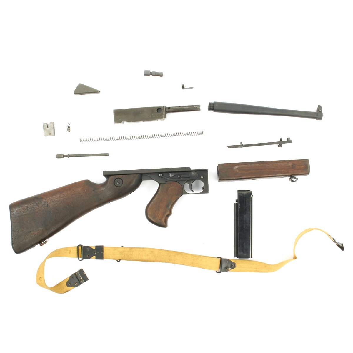 Original Item: One of our very last M1A1 parts sets. Original U.S. Thompson WW2 era M1A1 Parts set with an original issue barrel. Finish on the metal components is phosphate/parkerized, and stock wood is in excellent condition. Comes complete with an aged reproduction sling and original magazine.