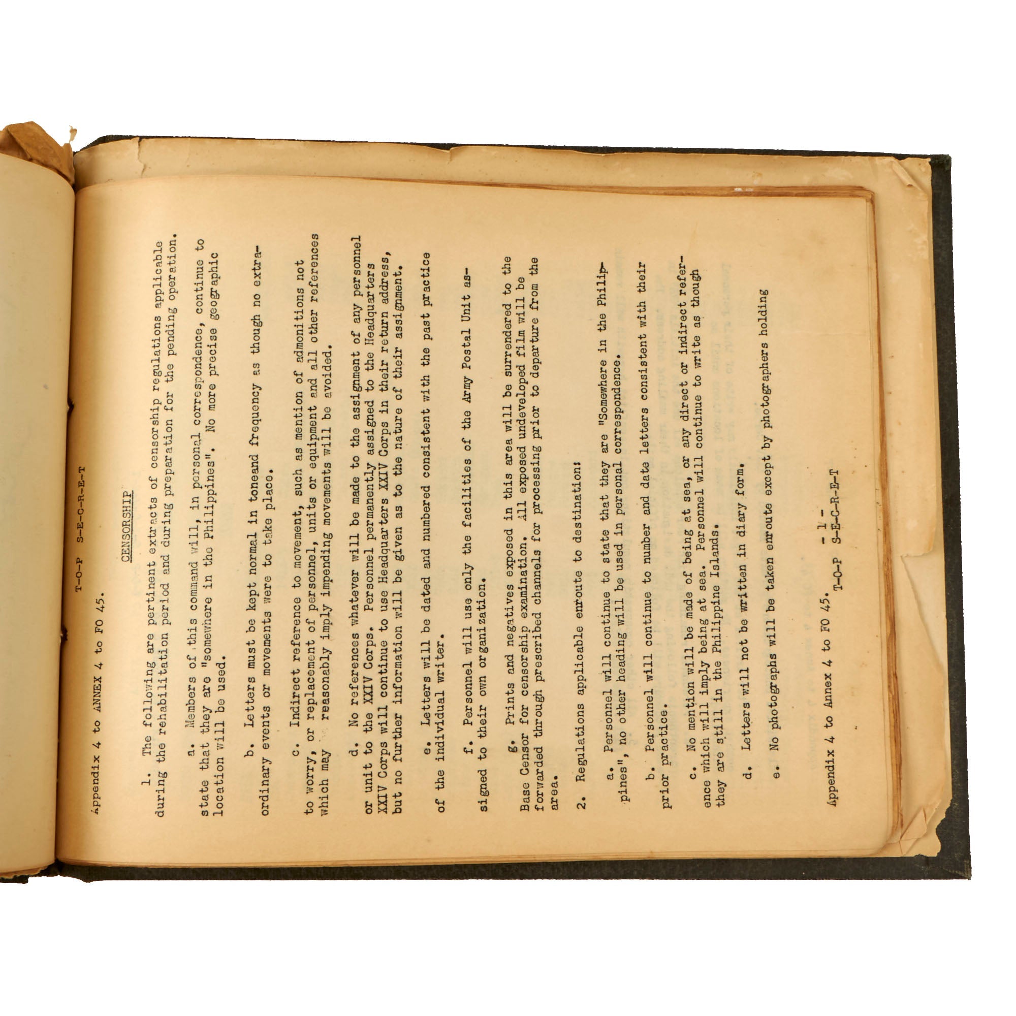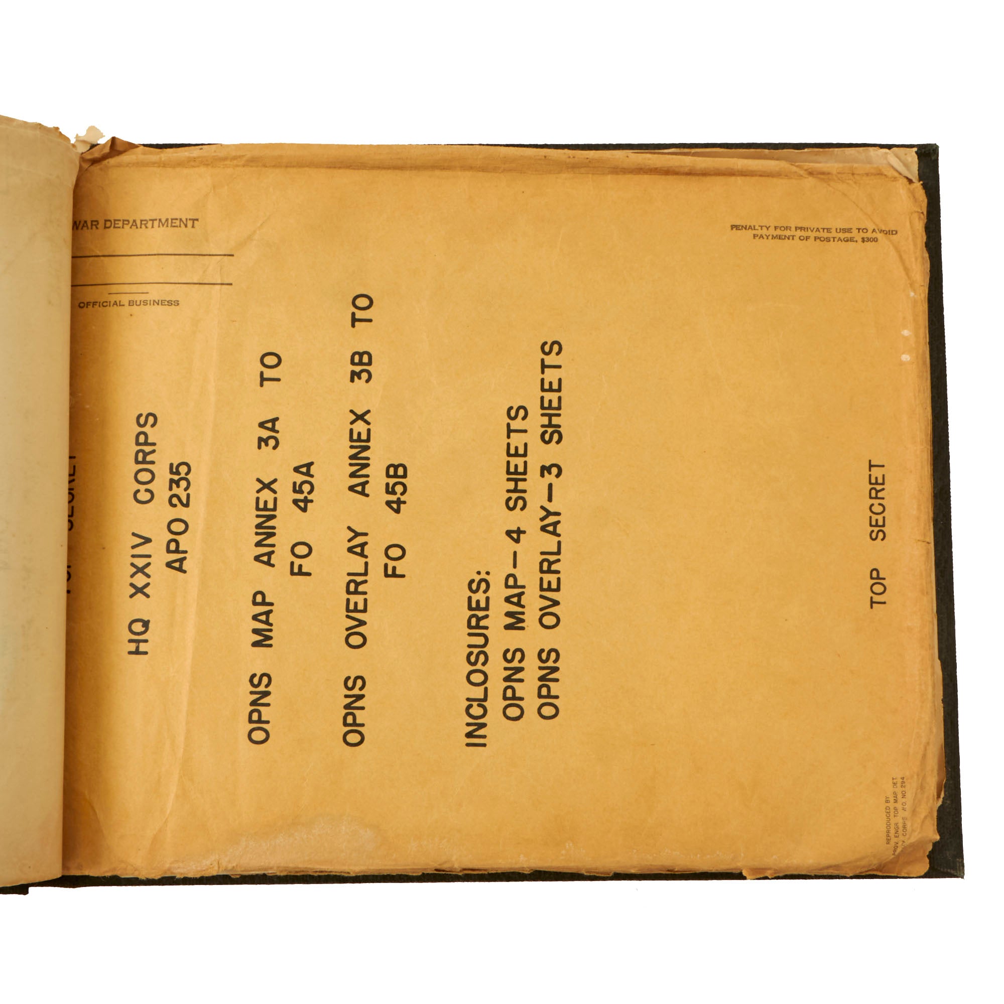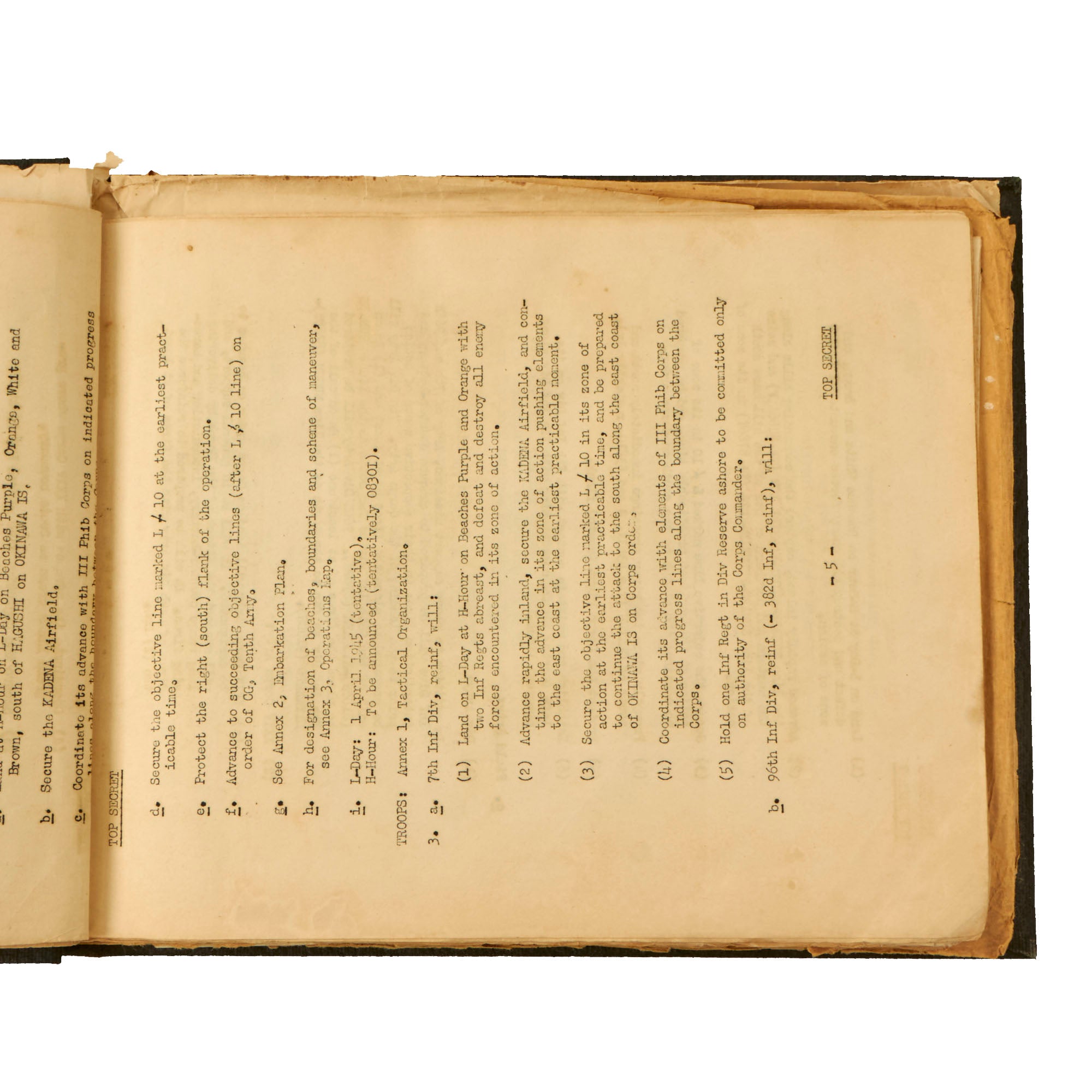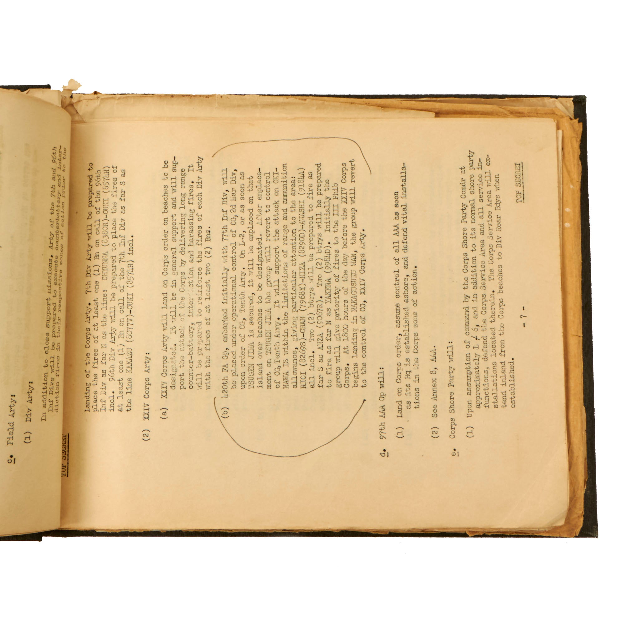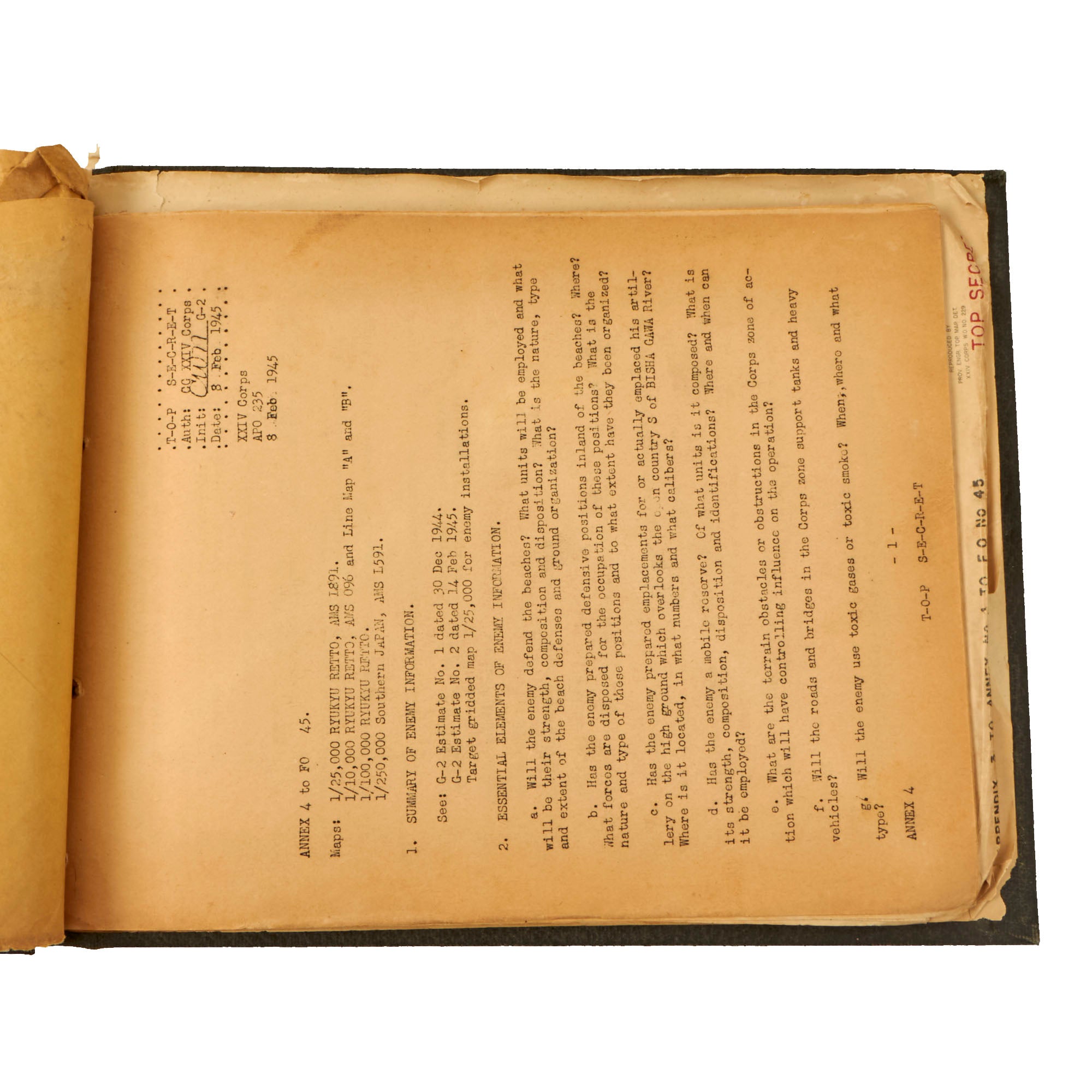 Original Item. One-of-a-Kind. This is a once-in-a-lifetime offering including original invasion plan book with report of operations and after action reports for the 532nd Field Artillery Battalion during Operation Forager, the Philippine Campaign, and the Ryukyus Campaign, and for XXIV Corps during Operation Iceberg, the Assault on Okinawa. These documents are nearly impossible to source today, making this an extremely scarce offering.