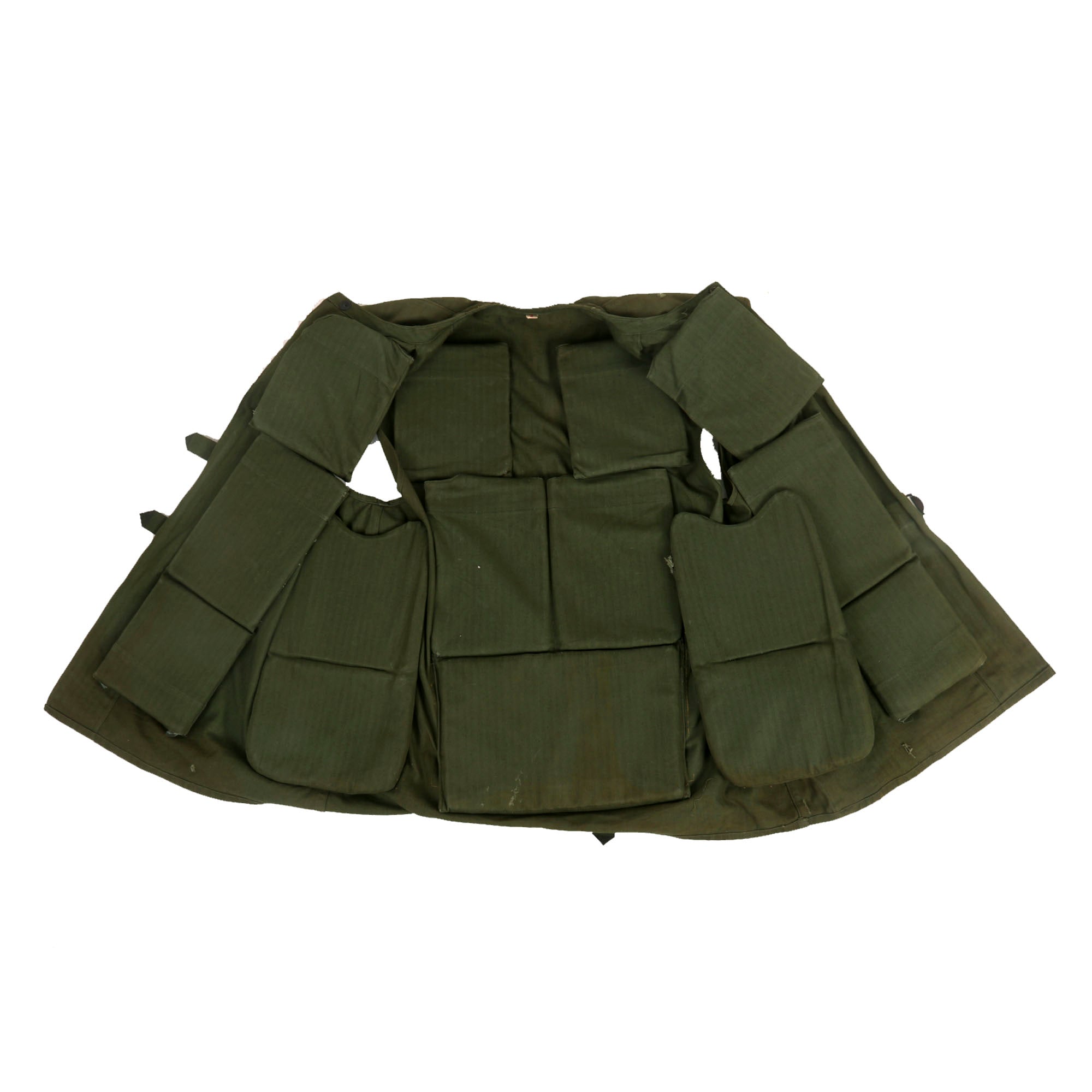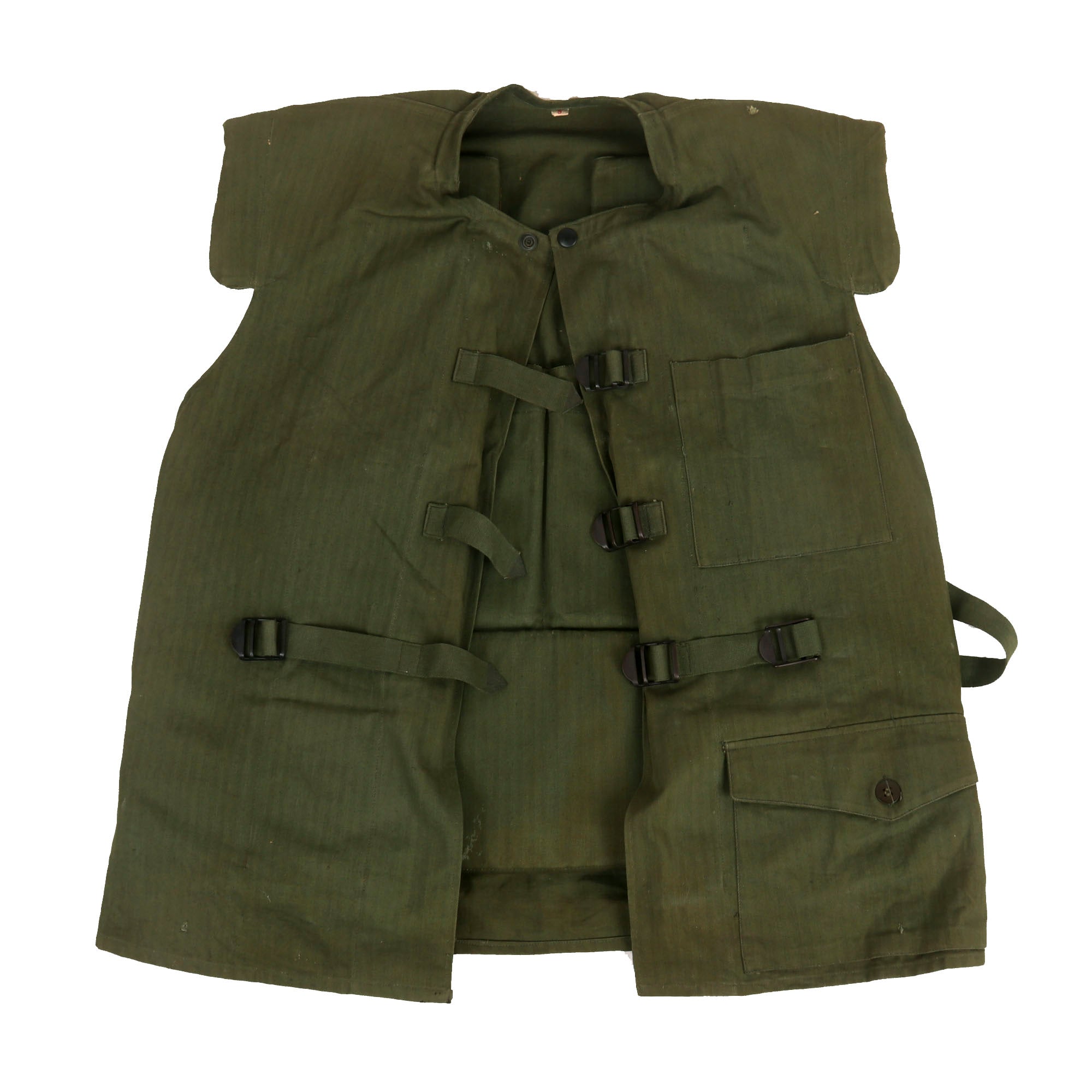 There is a small red tag stapled inside the bottom pocket reading 116 SMALL 1A X1 653. The buckles on the jacket are all labeled Waterbury Buckle Co. and the snaps are all labeled UNITED CARR, which is consistent with snaps on other body armor of the era (i.e. the M12). Every plate is secured in its sleeve by a button that can be undone to allow for their removal. There are fifteen (15) plates in total, with added padding in each shoulder to make the armor a bit more comfortable to wear. The set is in overall great condition and should fit well on a mannequin. Please advise that it is the Small size.
