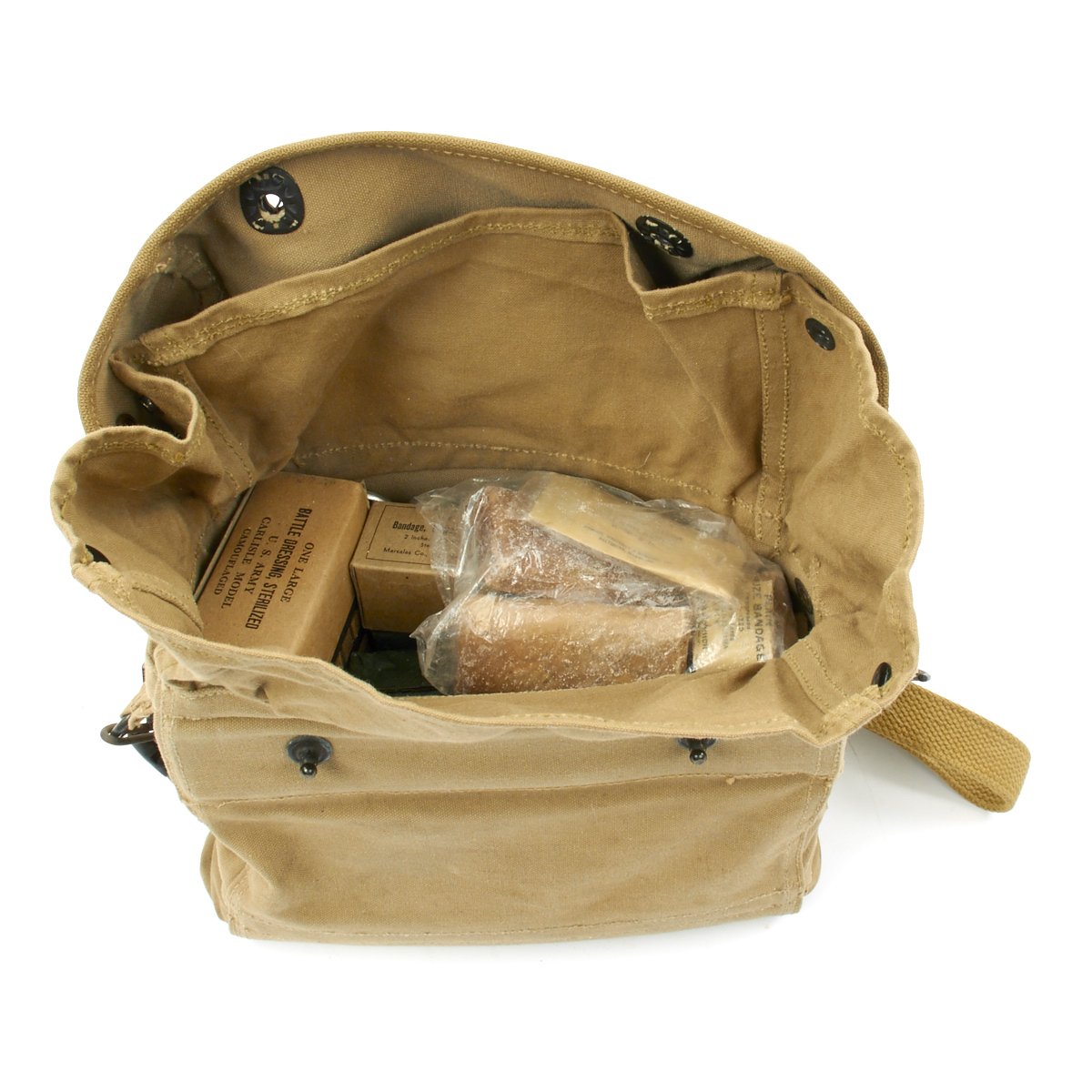 Original Items: Only One Available. This is a super rare medical dressing kit featuring genuine WWII U. S. Navy First Aid Medical Corpsmans bag complete with medical accessories as originally issued. The bag measures 9 x 7 x 3 inches, but has an expansion on the bottom, which makes it 9 x 12 x 3 inches. It has metal strap tips and clasps. Included inside the bag are the following NOS totally original WW2 accessories: