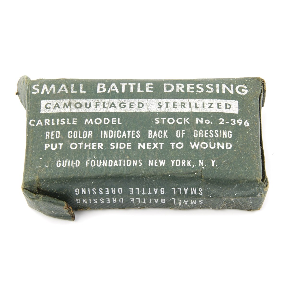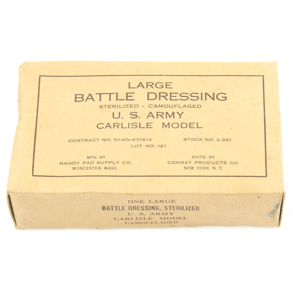- One U.S. Army Carlisle Model LARGE Battle Dressing Sterilized - Camouflaged, by Handy Pad Supply Co. in original cardboard box.