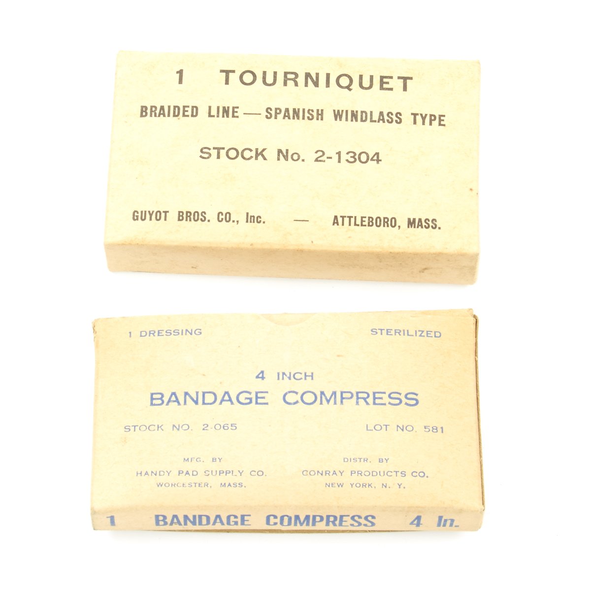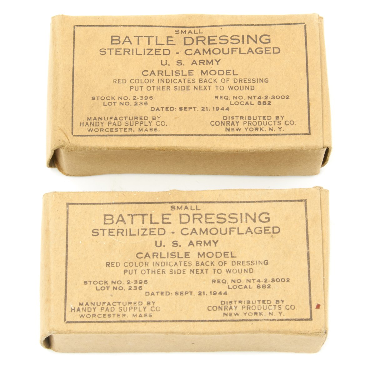 - 2 x U.S. Army Carlisle Model Small Battle Dressing Sterilized - Camouflaged, dated SEPT. 21 1944 in original cardboard boxes.