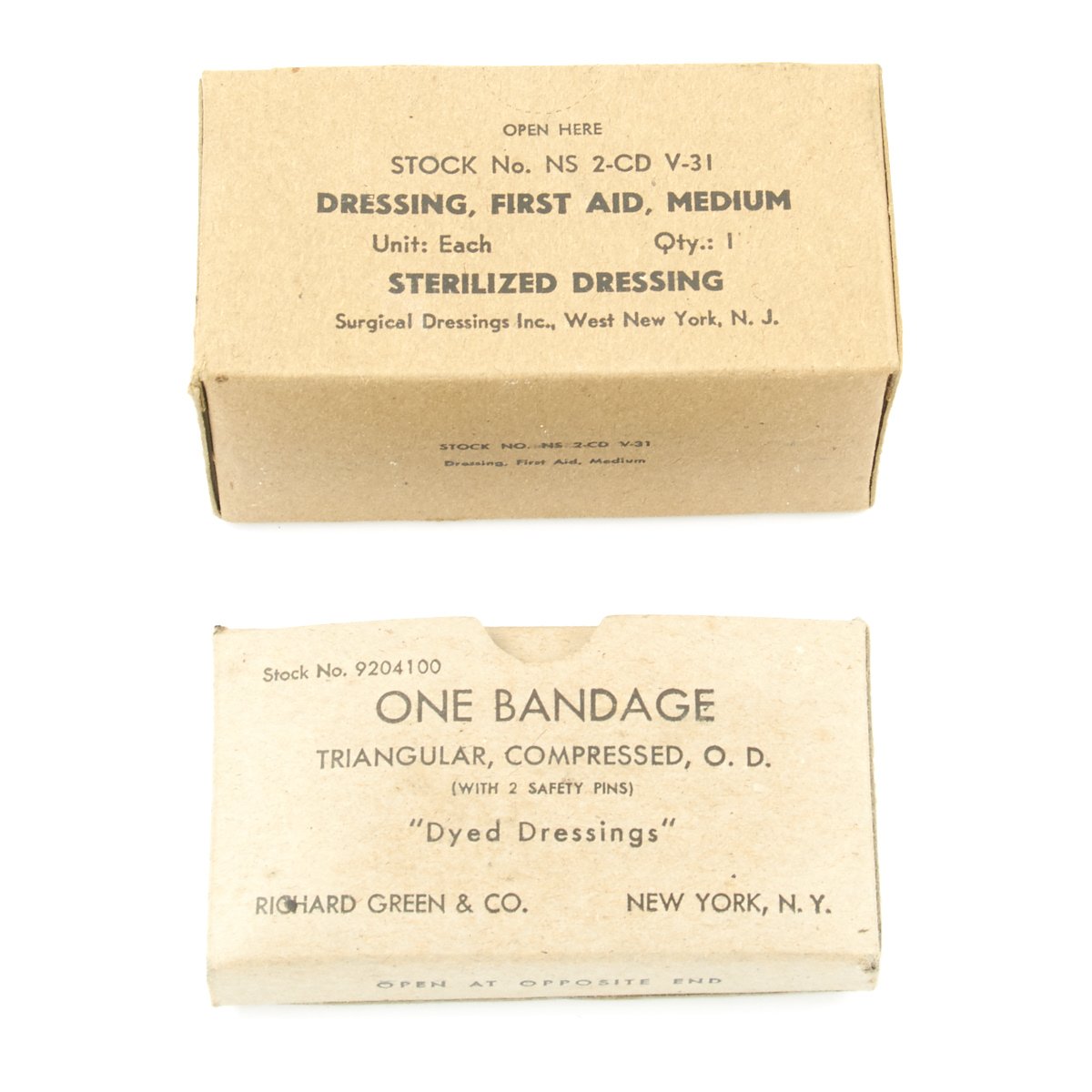 - One BANDAGE TRIANGULAR COMPRESSED, O.D. (with 2 safety pins) "Dyed Dressings" by Richard Green & Co., New York.