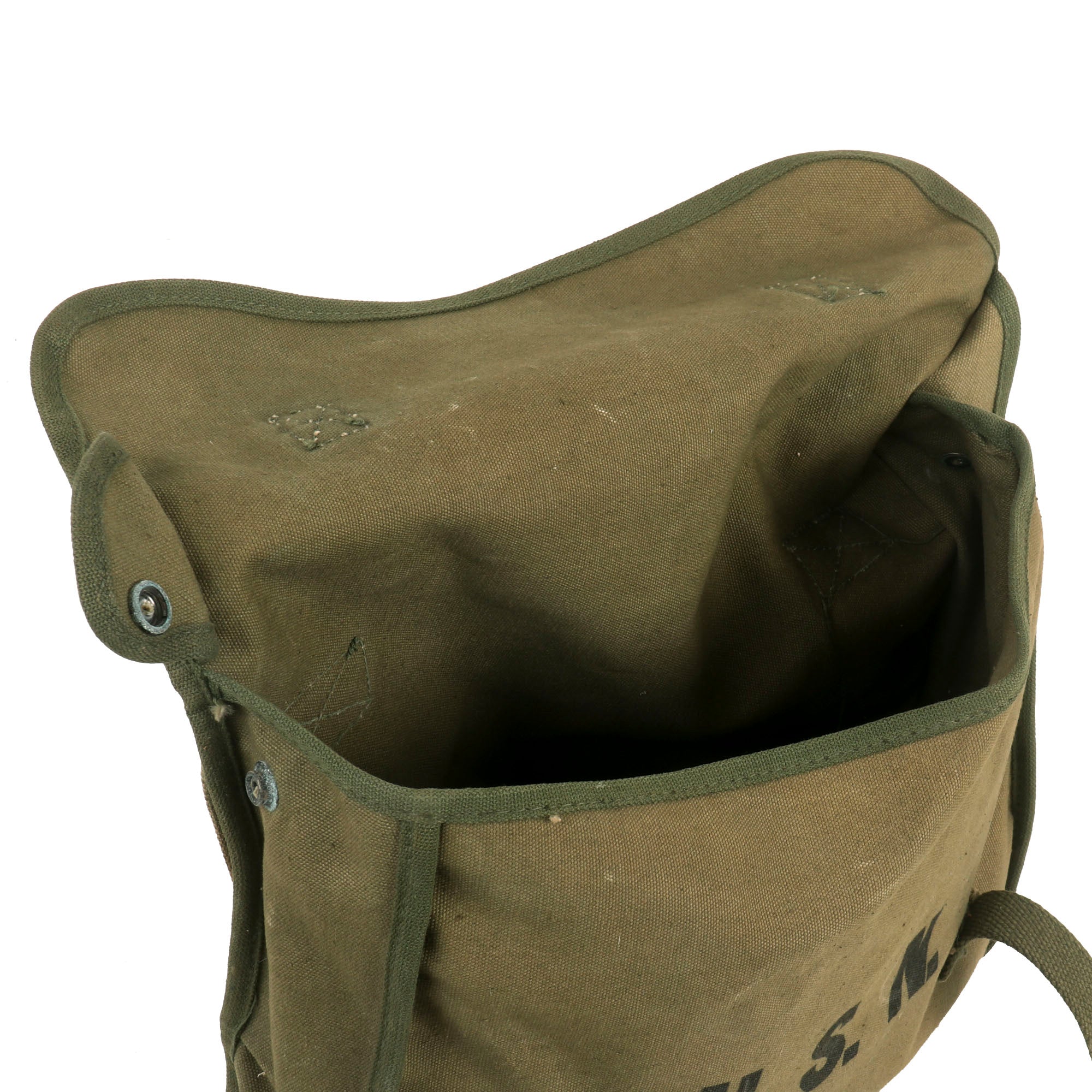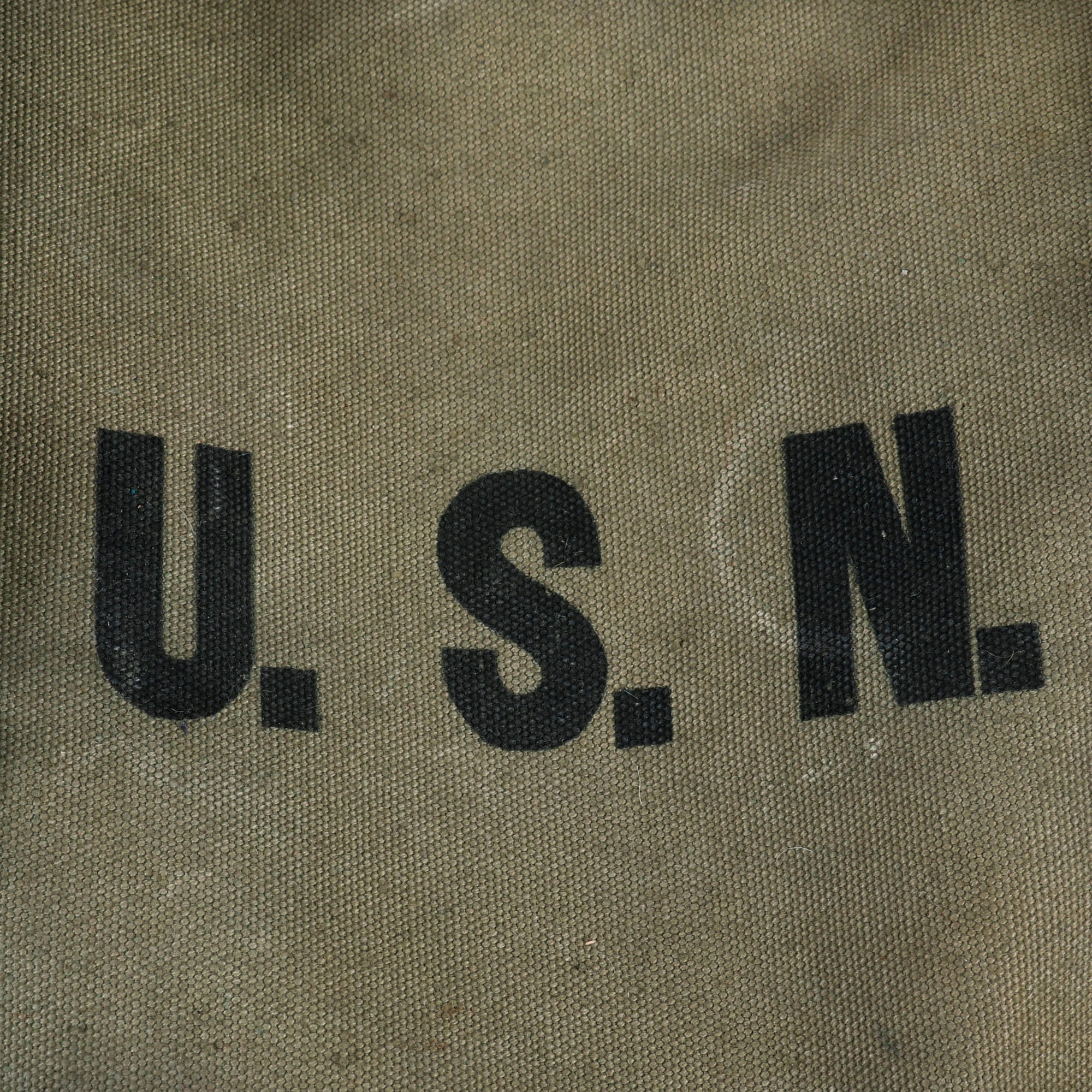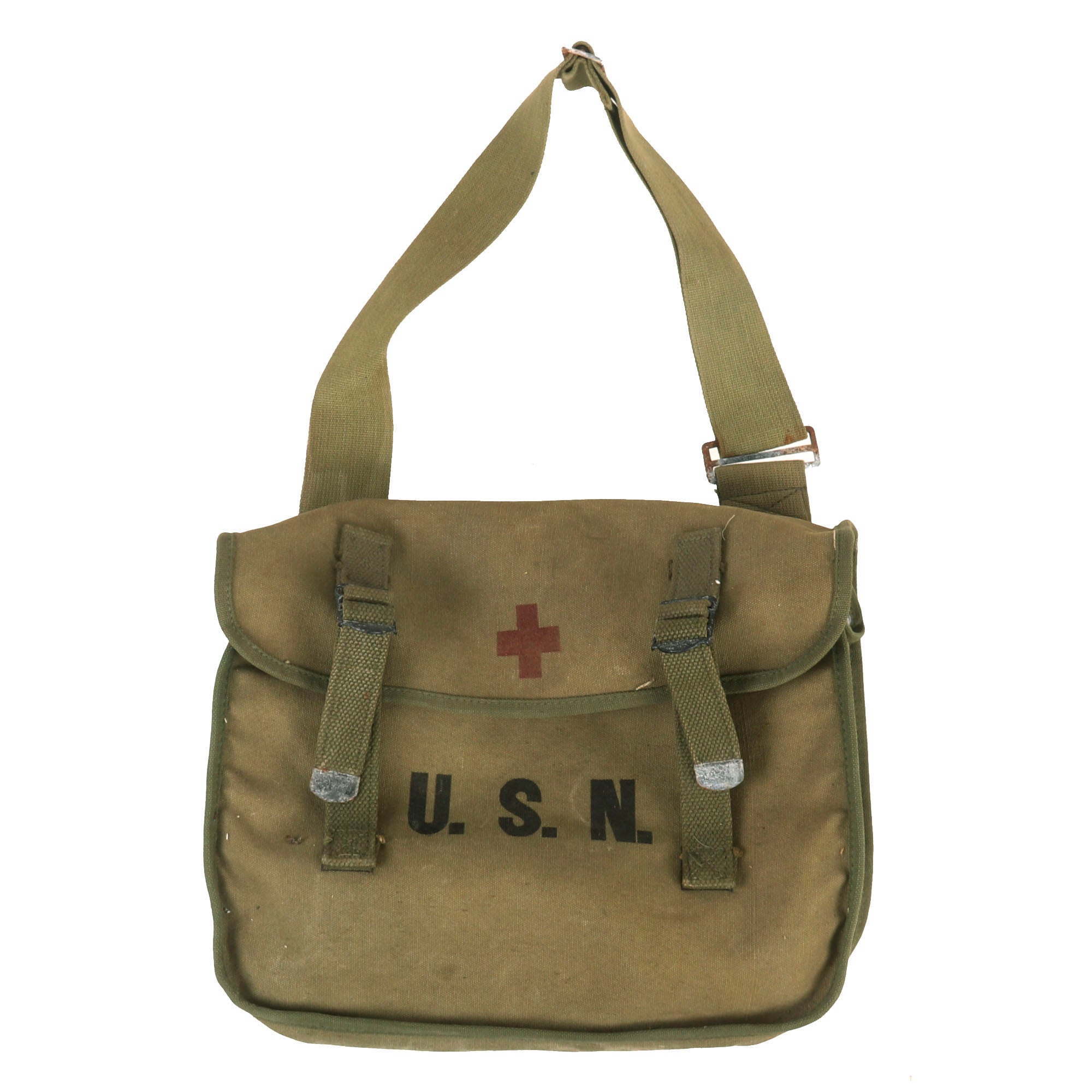 Original Items: Only One Available. This is a super rare genuine WWII U.S. Navy First Aid Medical Corpsman's bag. The bag measures about 11 x 8 x 4 inches, has metal strap tips and clasps. Crisp medical logo on the bag flap and nicely stencil marked U.S.N.. The bag also has a small bag of dozens of buttons, an issue belt, and a pair of Gilt Navy uniform buttons.