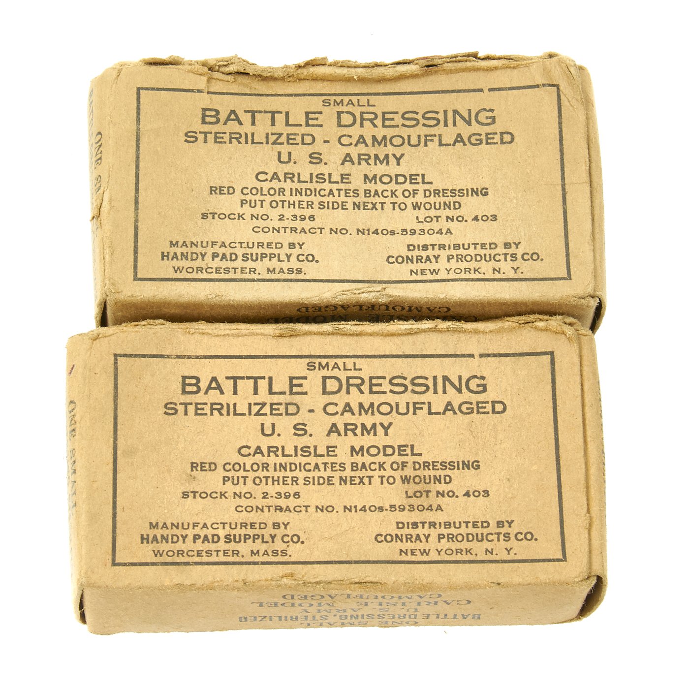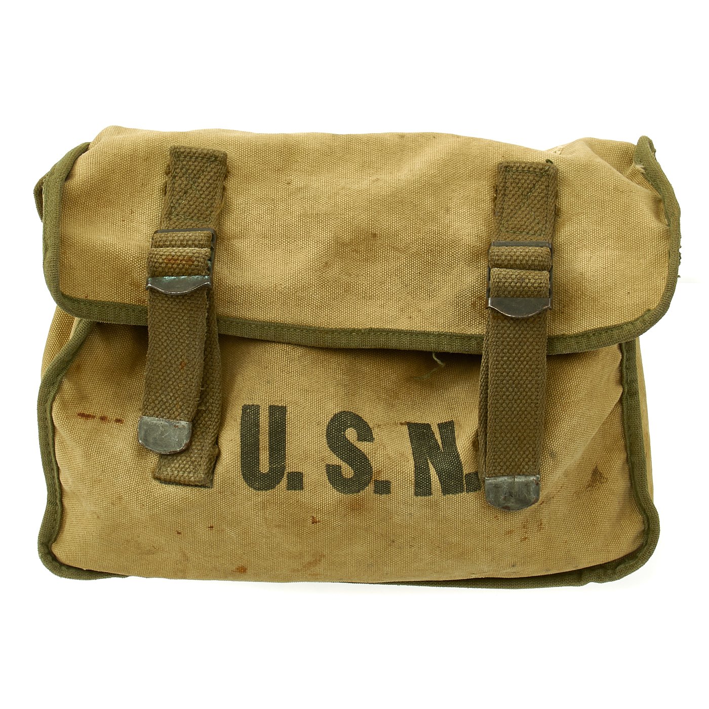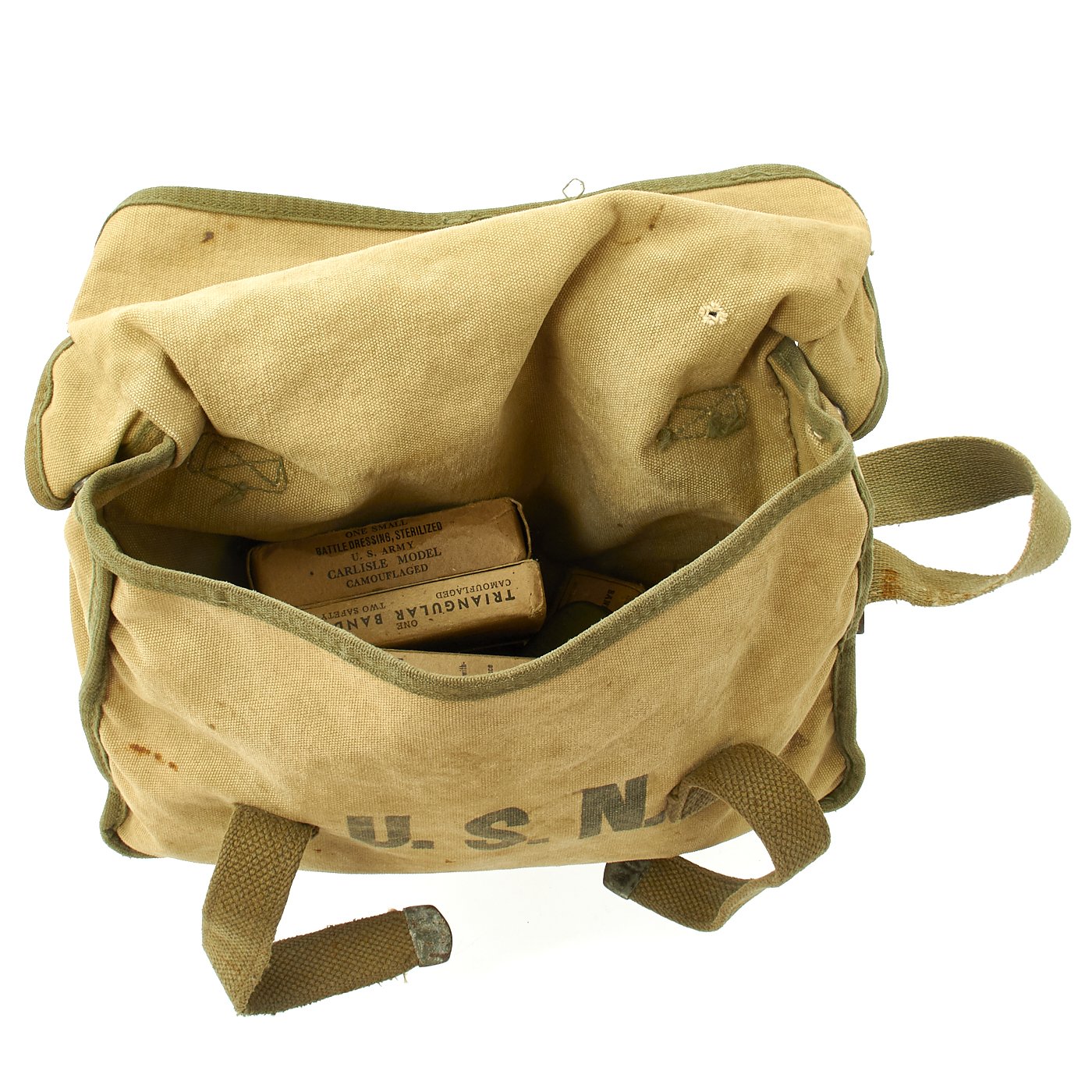 Original Items: Only One Available. This is a super rare well stocked kit featuring genuine WWII U. S. Navy First Aid Medical Corpsmans bag with loads of medical accessories as originally issued. The bag measures about 11 x 8 x 4 inches, has metal strap tips and clasps. Crisp medical logo on the bag flap and nicely stencil marked U.S.N. Included inside the bag are NOS totally original WWII accessories as can be seen in the images. They include many different types of bandages and field dressings, some of which are camouflaged. There are also two original metal-cased Carlisle bandages, suture material, and even a bottle of Acetylsalicylic acid tablets, more commonly known as "Asprin."