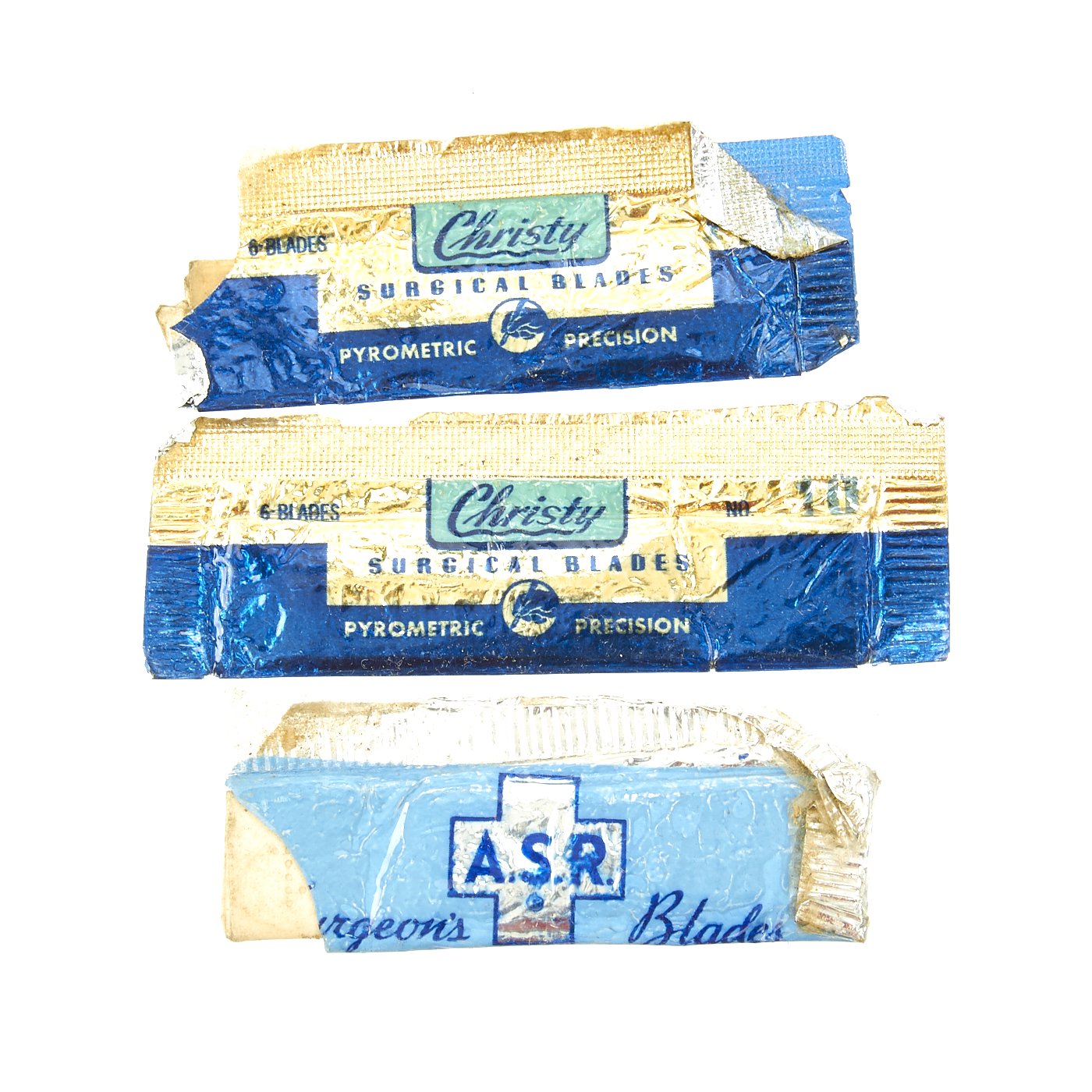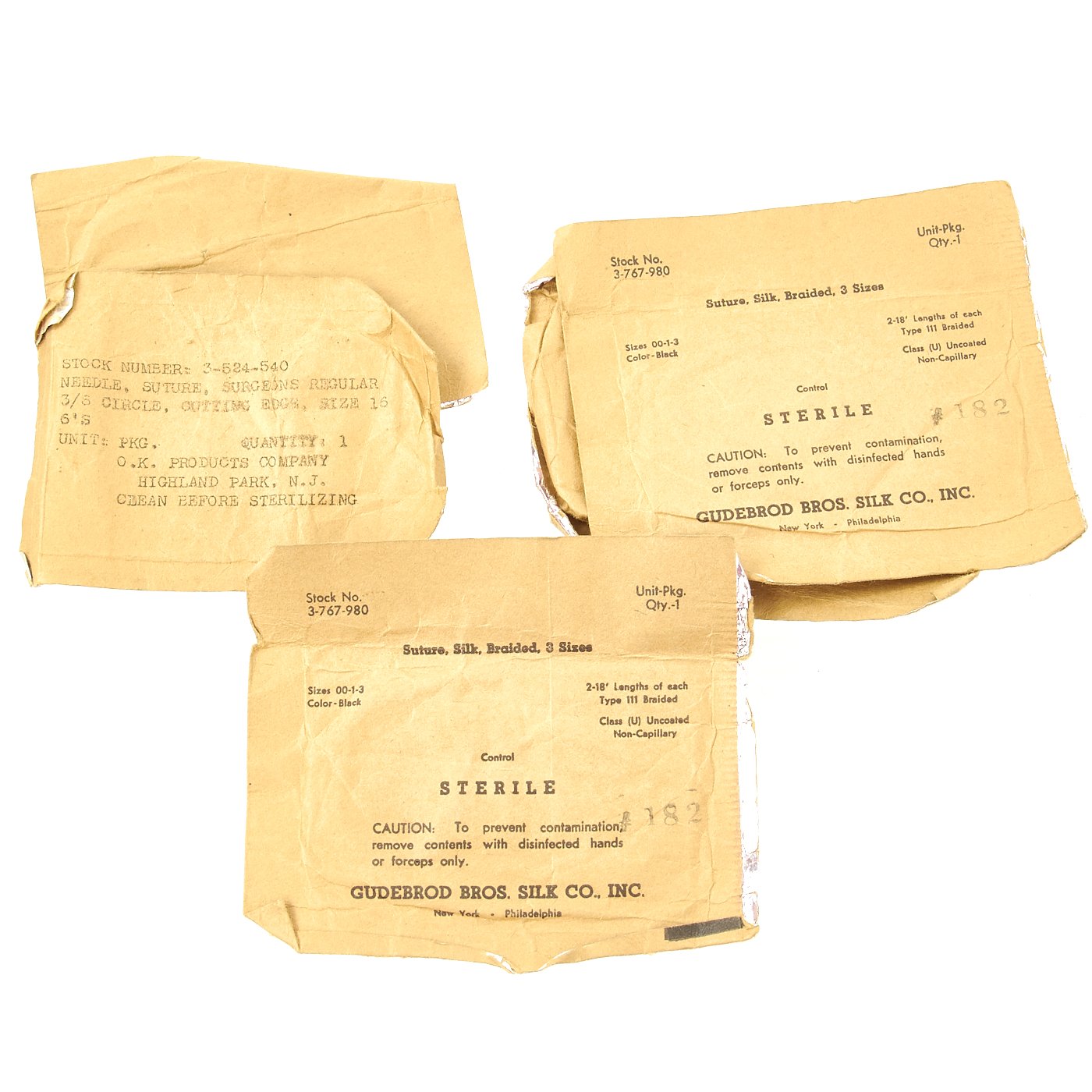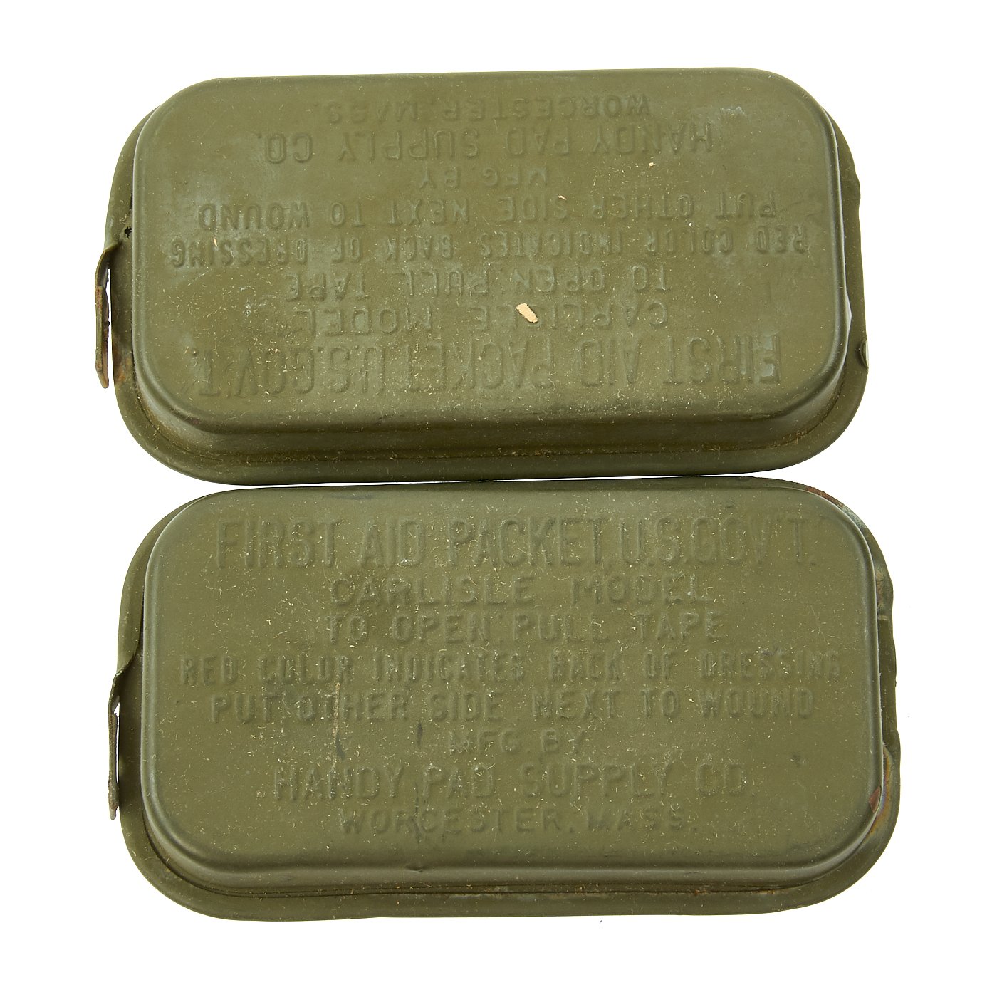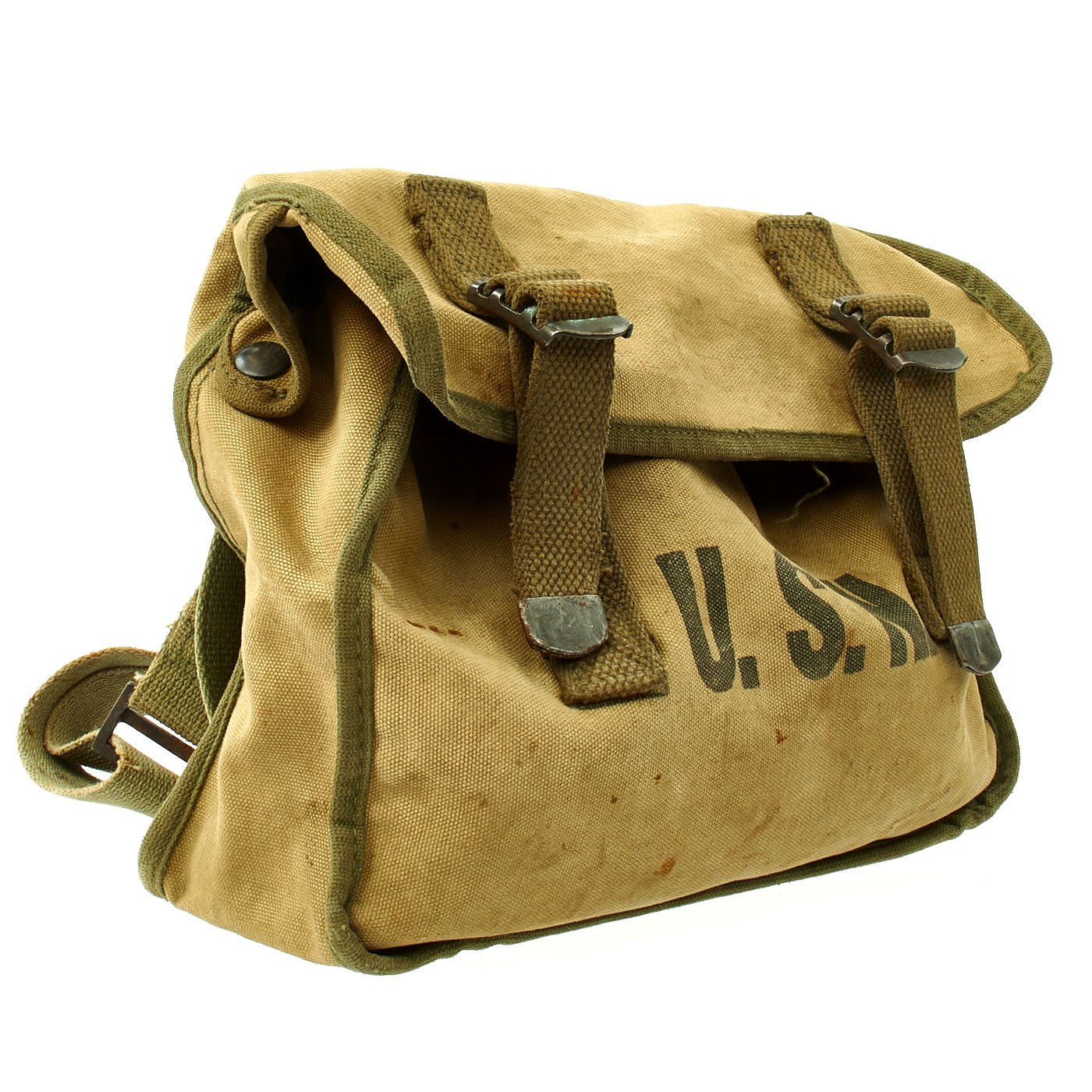 Original Items: Only One Available. This is a super rare well stocked kit featuring genuine WWII U. S. Navy First Aid Medical Corpsmans bag with loads of medical accessories as originally issued. The bag measures about 11 x 8 x 4 inches, has metal strap tips and clasps. Crisp medical logo on the bag flap and nicely stencil marked U.S.N. Included inside the bag are NOS totally original WWII accessories as can be seen in the images. They include many different types of bandages and field dressings, some of which are camouflaged. There are also two original metal-cased Carlisle bandages, suture material, and even a bottle of Acetylsalicylic acid tablets, more commonly known as "Asprin."
