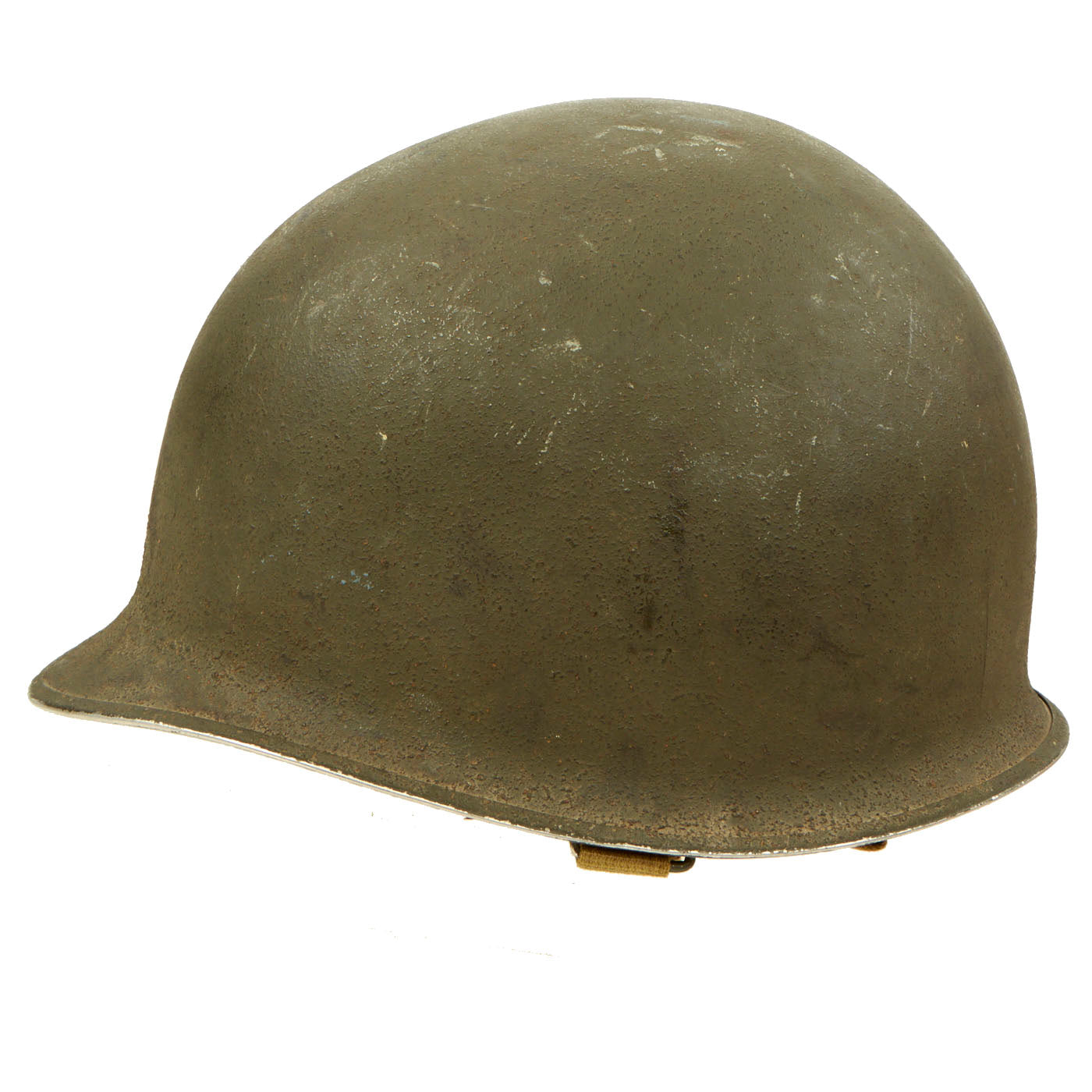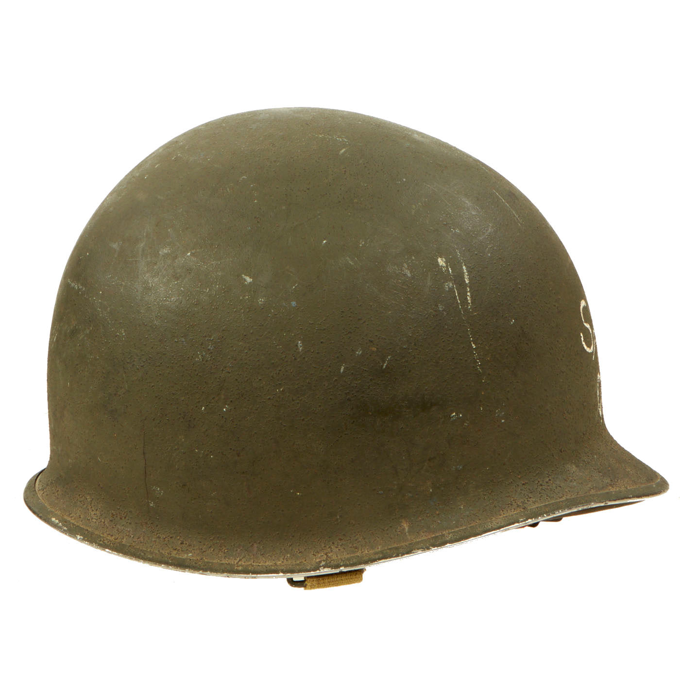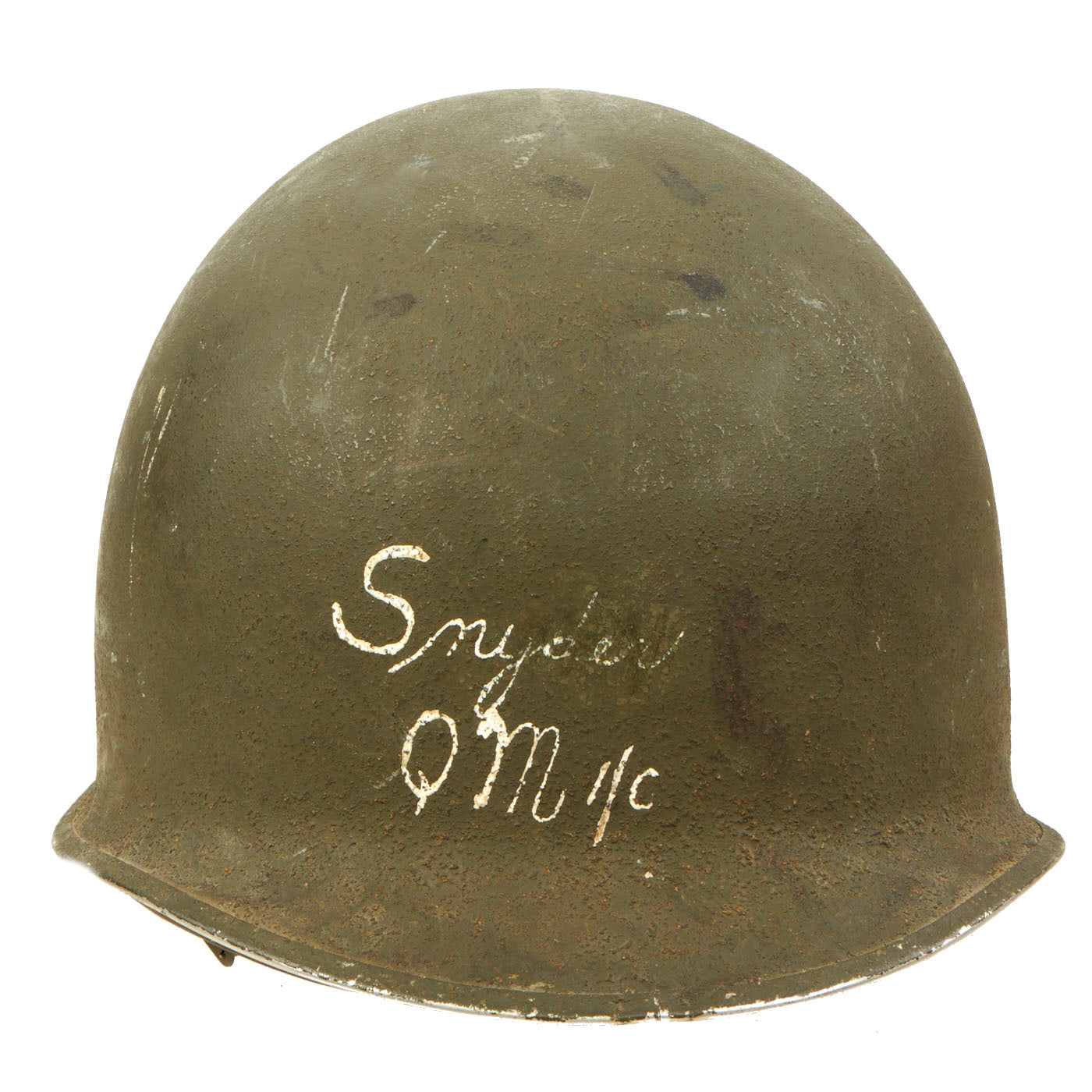 - M1 Helmet: The helmet is complete with a Front Seam, Fixed Bale McCord shell, heat stamp 271C indicating production in September of 1942. The liner is the correct “high pressure” liner manufactured by Westinghouse. The helmet is in great condition with both chinstraps, the leather shows signs of honest wear but is undamaged on both the sweatband and liner chinstrap. The front of both the shell and liner have “Snyder QM1/c” painted in white.