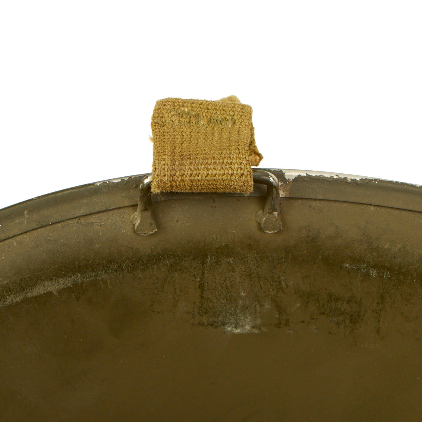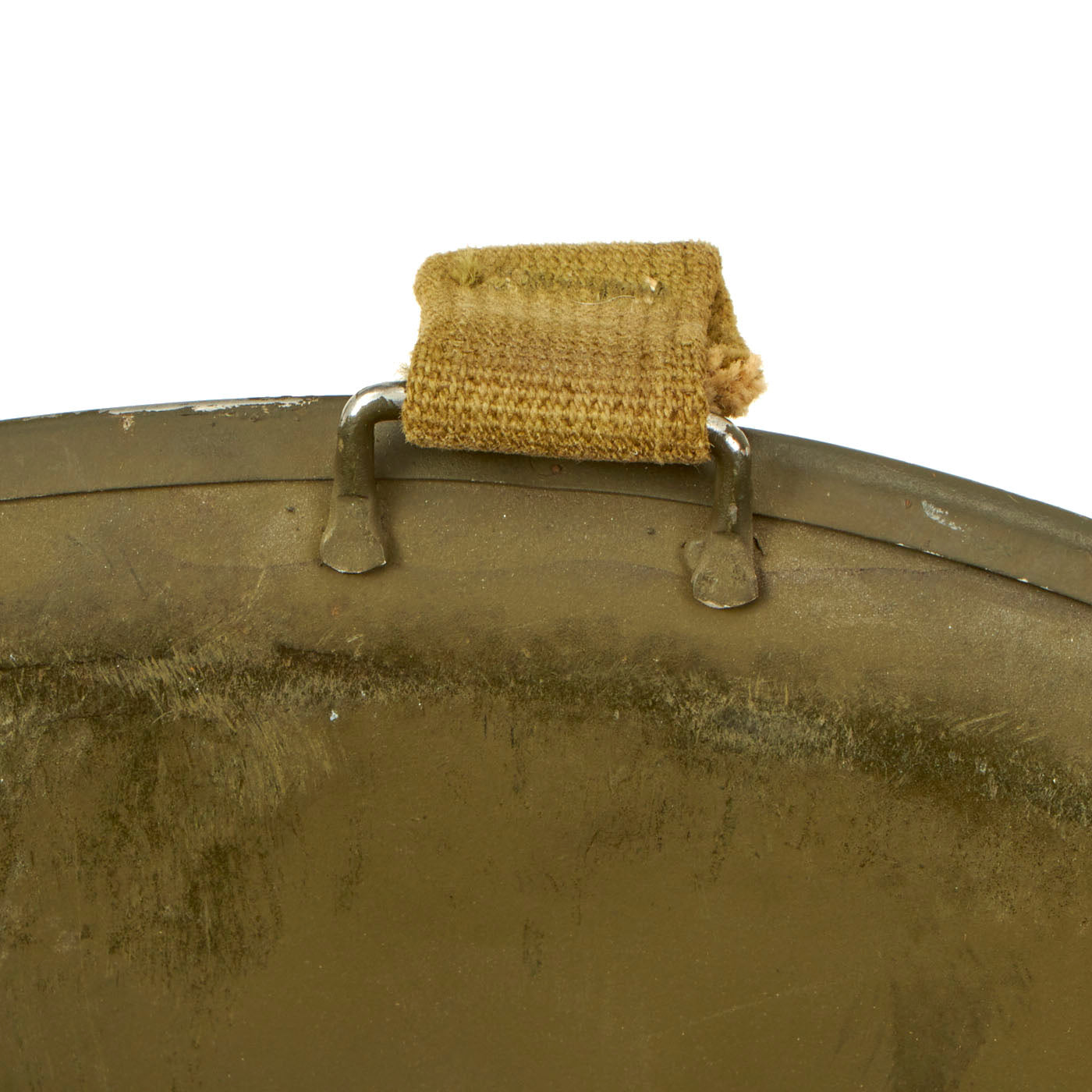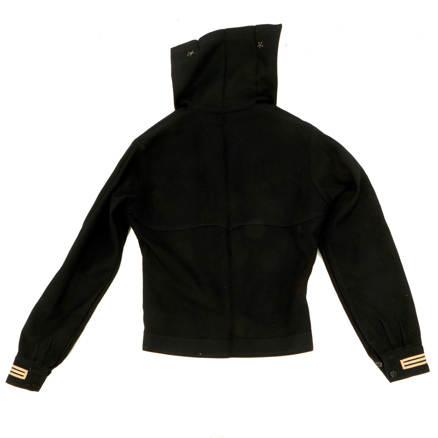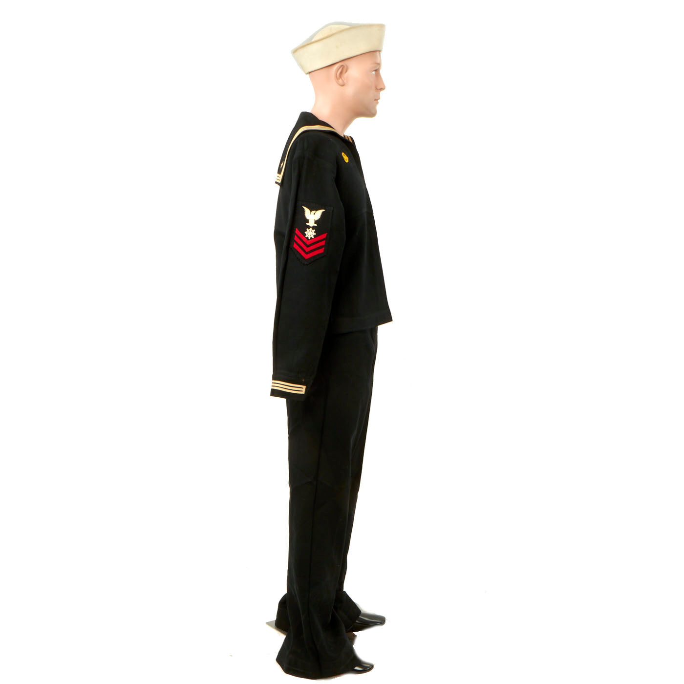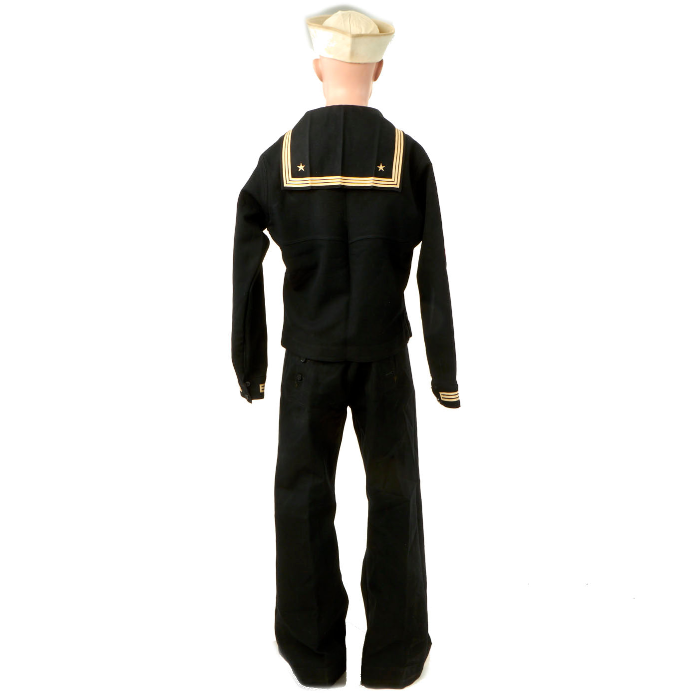 - The “dixie cup” sailors cover is still white but does have minor staining on the outside and sweat stains are present on the inside, showing signs of definite wear. His name is not on the cover but the size stamp is still present. The size is a 7.