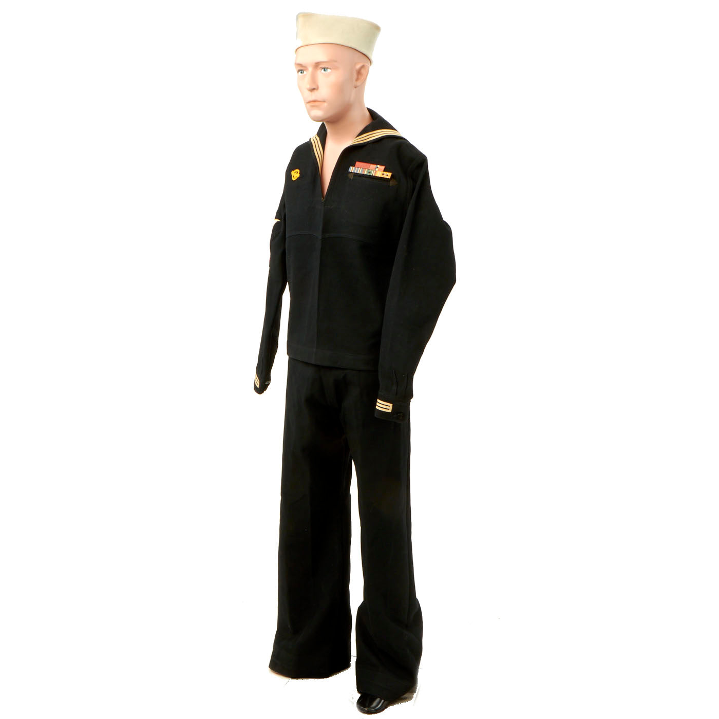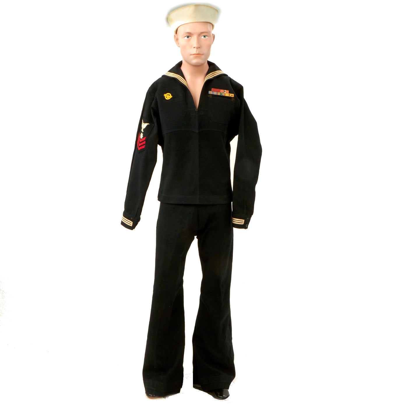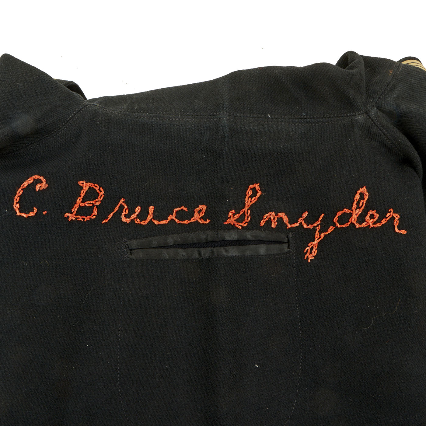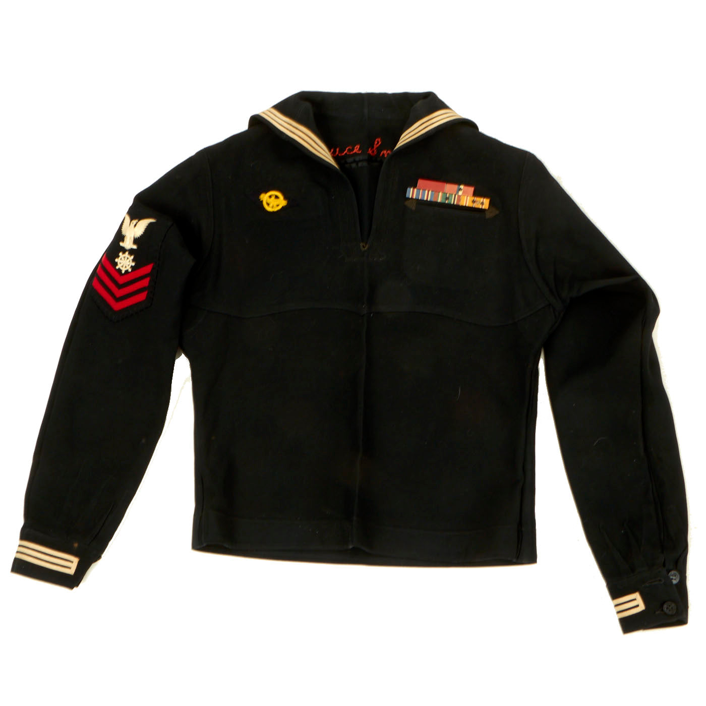 - Dress Blue Uniform: The uniform consists of a blouse, trousers, white cap and white belt with black buckle. The blouse and trousers both have “C. Bruce Snyder” hand stitched in orange thread on the inside and done very beautifully. There are ribbons present on the left hand side: Navy Good Conduct - Philippine Liberation Medal W/ Star American Campaign - EAME W/ Star - Asiatic Pacific W/ 2 Bronze Stars and 1 Gold Star. The 5 ribbons are a little worn and faded but are still easily discernible. The right hand side has the USN WWII “Ruptured Duck” Honorable Service patch. The left sleeve has a Quartermaster 1st Class patch which appears to be hand sewn on in a “cross stitch” type pattern. All stitching is still present and tight