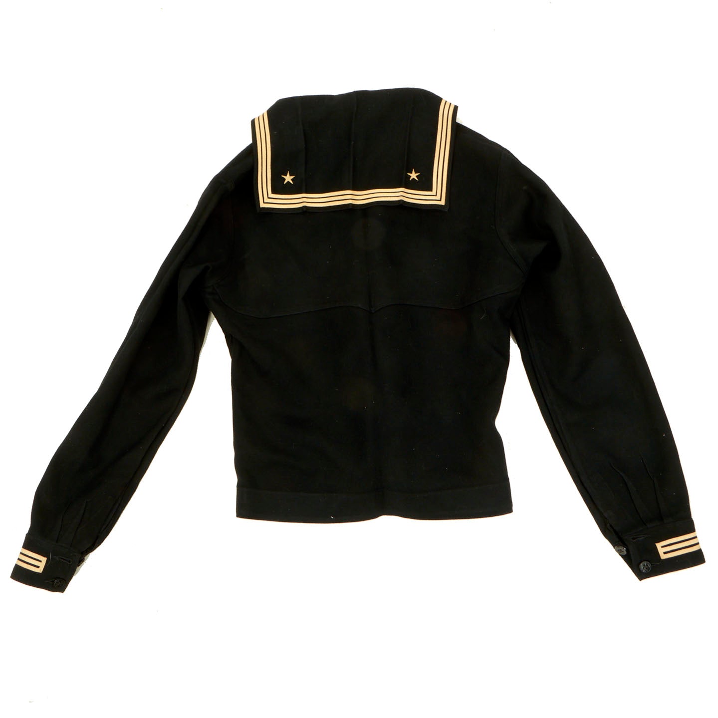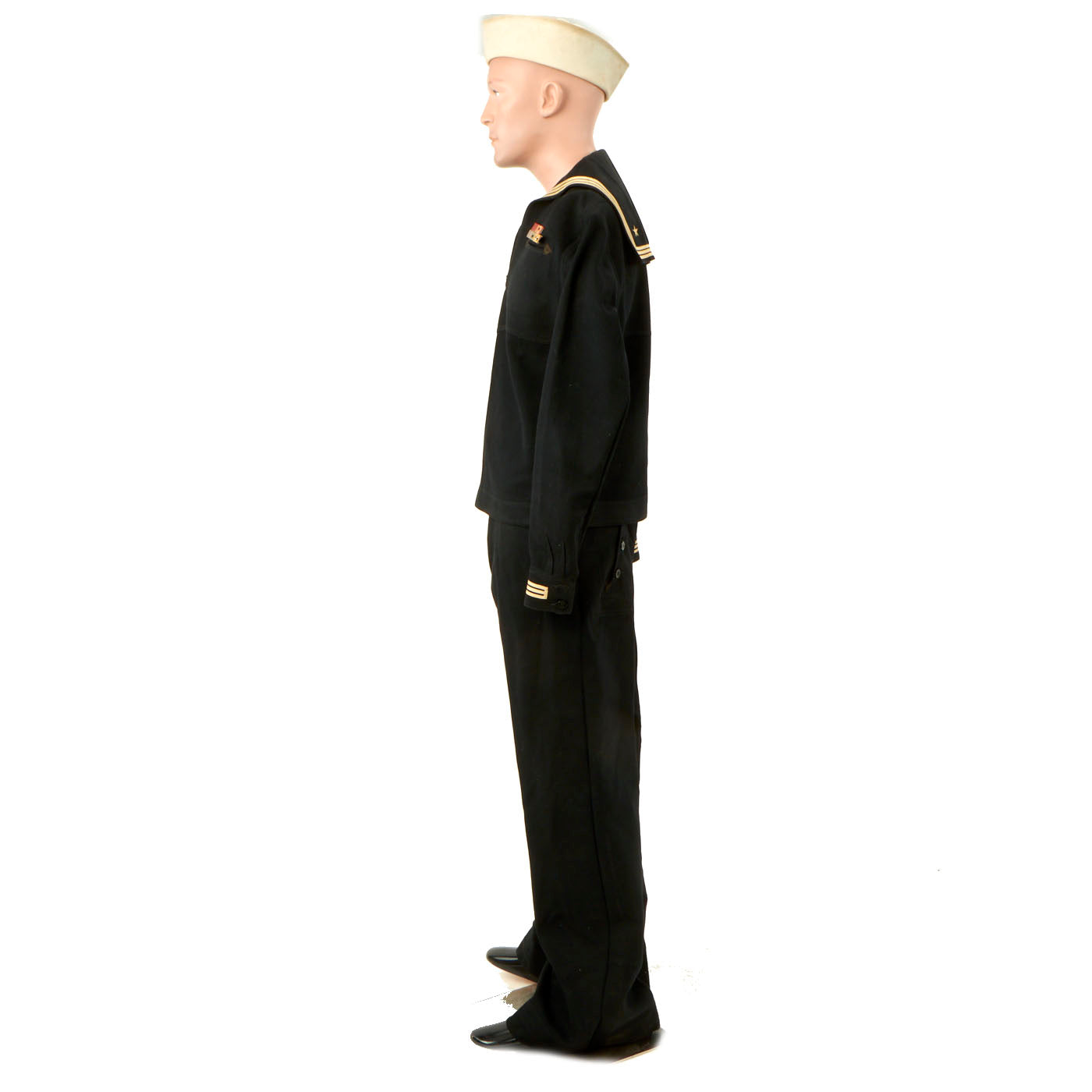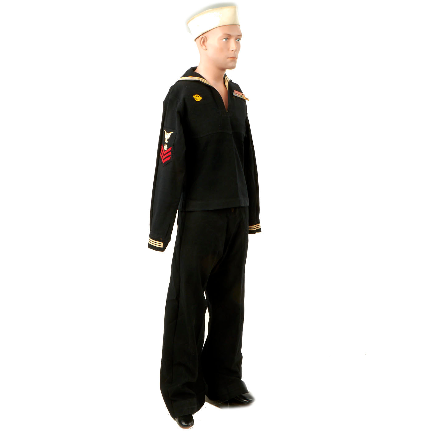 - Dress Blue Uniform: The uniform consists of a blouse, trousers, white cap and white belt with black buckle. The blouse and trousers both have “C. Bruce Snyder” hand stitched in orange thread on the inside and done very beautifully. There are ribbons present on the left hand side: Navy Good Conduct - Philippine Liberation Medal W/ Star American Campaign - EAME W/ Star - Asiatic Pacific W/ 2 Bronze Stars and 1 Gold Star. The 5 ribbons are a little worn and faded but are still easily discernible. The right hand side has the USN WWII “Ruptured Duck” Honorable Service patch. The left sleeve has a Quartermaster 1st Class patch which appears to be hand sewn on in a “cross stitch” type pattern. All stitching is still present and tight
