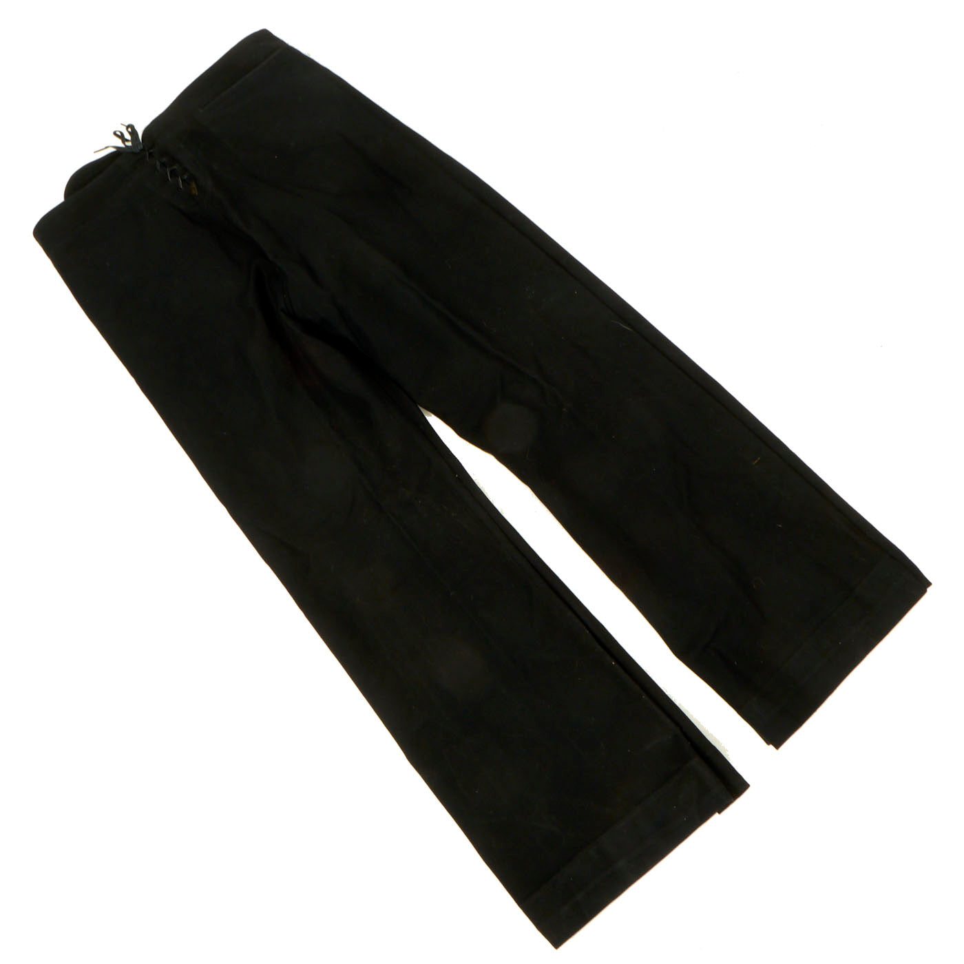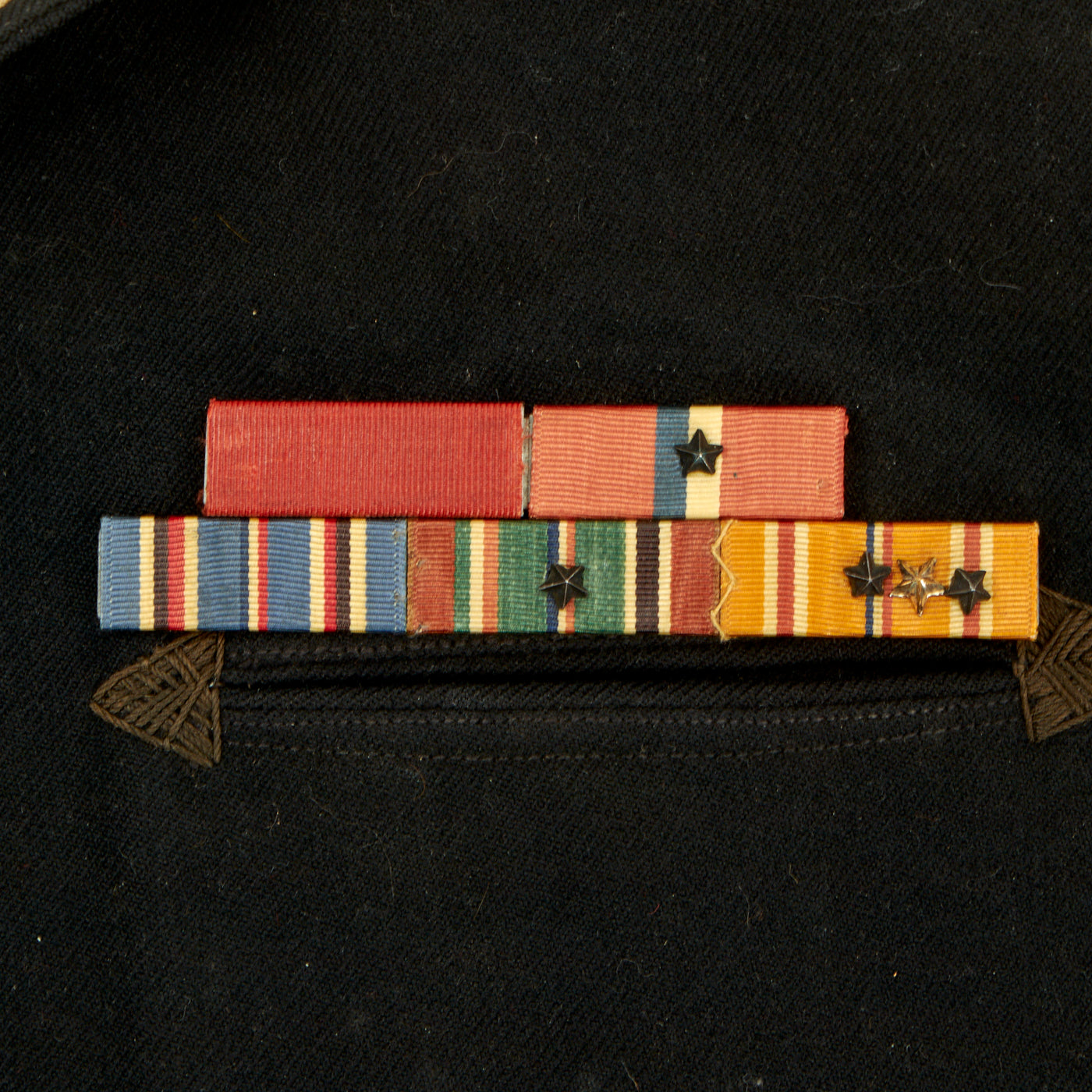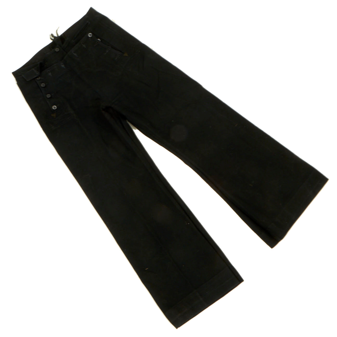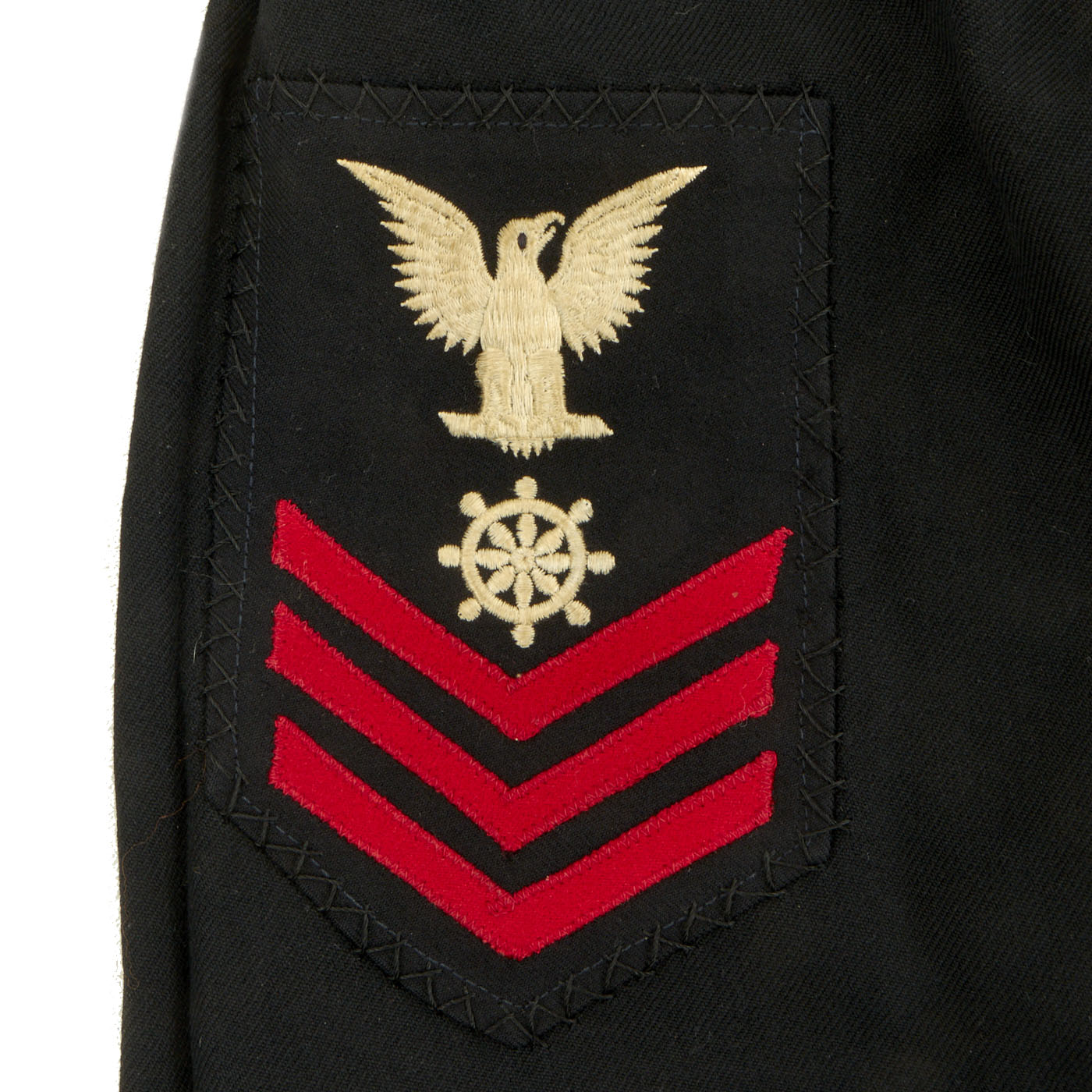 - Dress Blue Uniform: The uniform consists of a blouse, trousers, white cap and white belt with black buckle. The blouse and trousers both have “C. Bruce Snyder” hand stitched in orange thread on the inside and done very beautifully. There are ribbons present on the left hand side: Navy Good Conduct - Philippine Liberation Medal W/ Star American Campaign - EAME W/ Star - Asiatic Pacific W/ 2 Bronze Stars and 1 Gold Star. The 5 ribbons are a little worn and faded but are still easily discernible. The right hand side has the USN WWII “Ruptured Duck” Honorable Service patch. The left sleeve has a Quartermaster 1st Class patch which appears to be hand sewn on in a “cross stitch” type pattern. All stitching is still present and tight