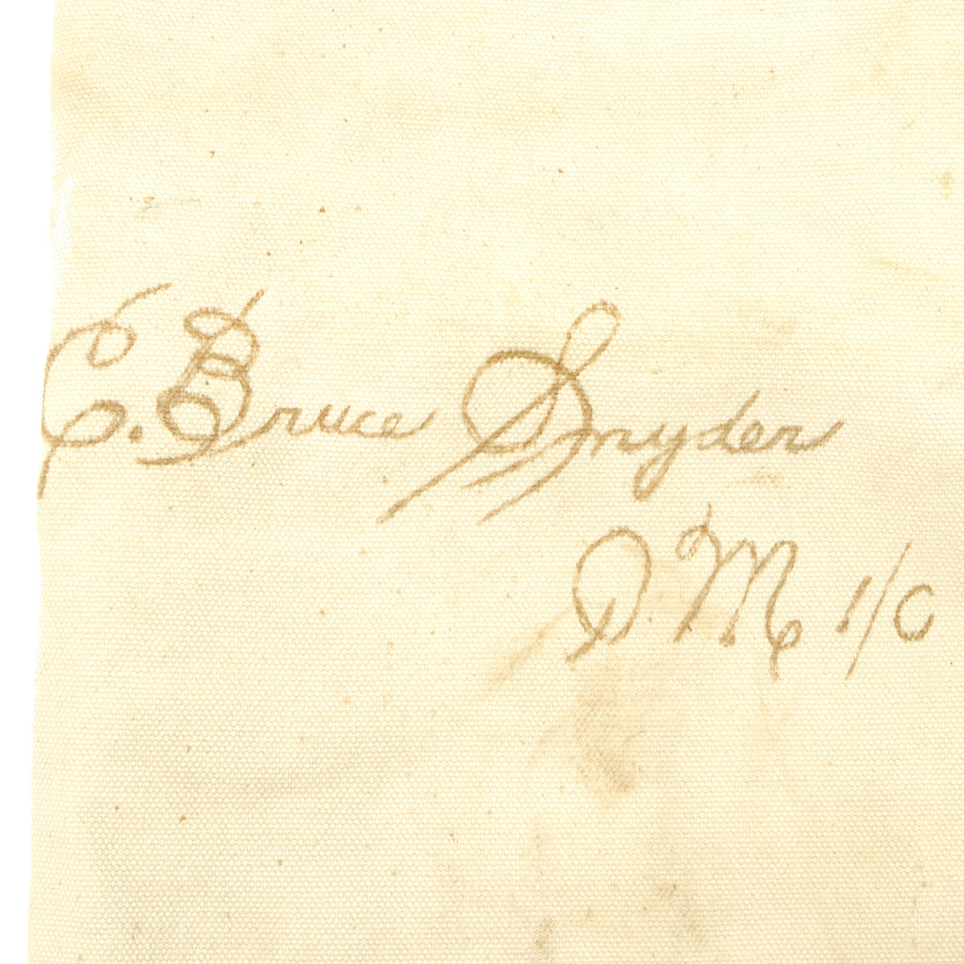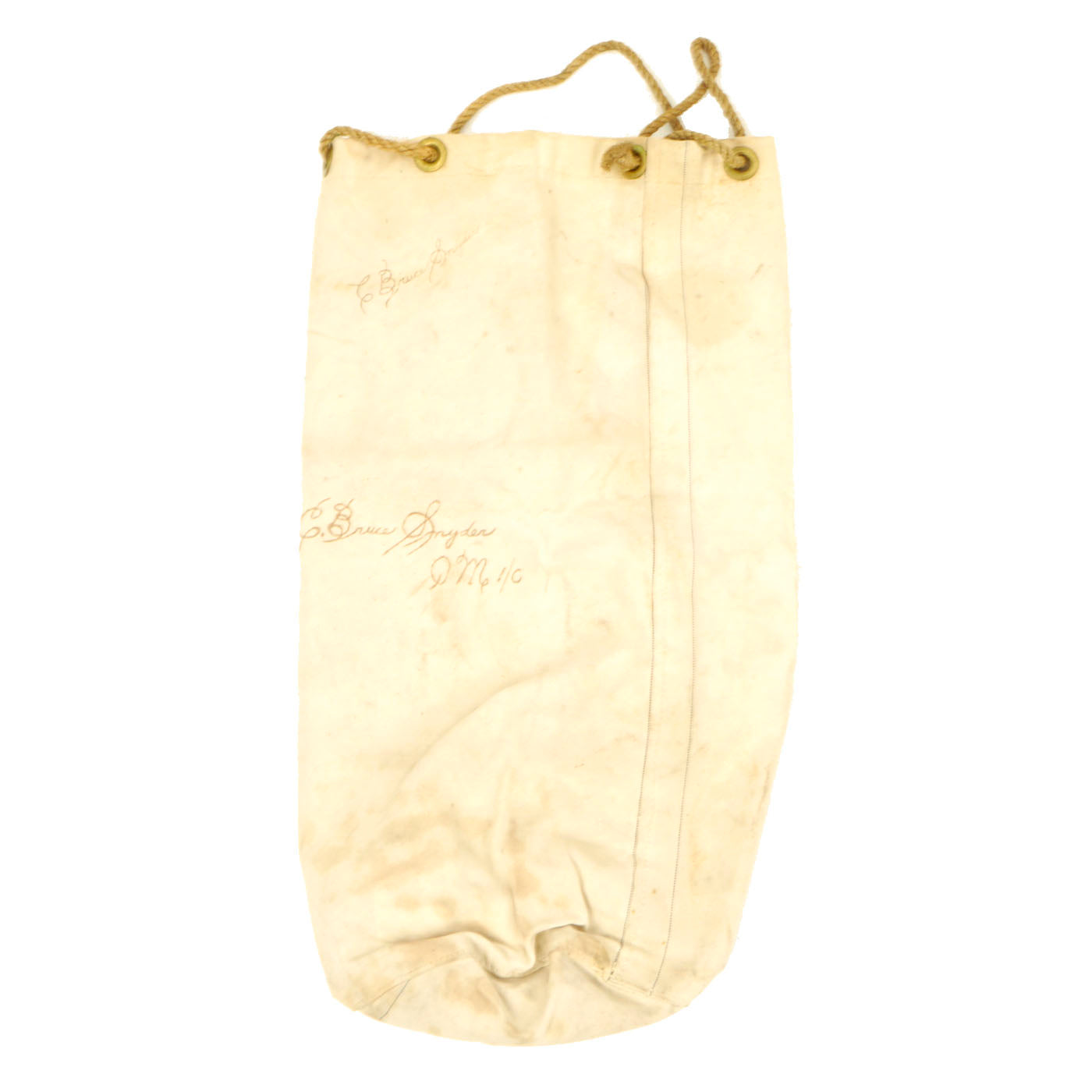 - USN Seabag: The seabag is a regular federal issue heavy white canvas bad and is complete with all brass eyelets and closure rope. As with everything white being used in the Military, especially the Navy during WWII, there is the expected staining to the material. The “USN” is no longer visible, but “ C. Bruce Snyder Qm1/c” is written on the outside twice.