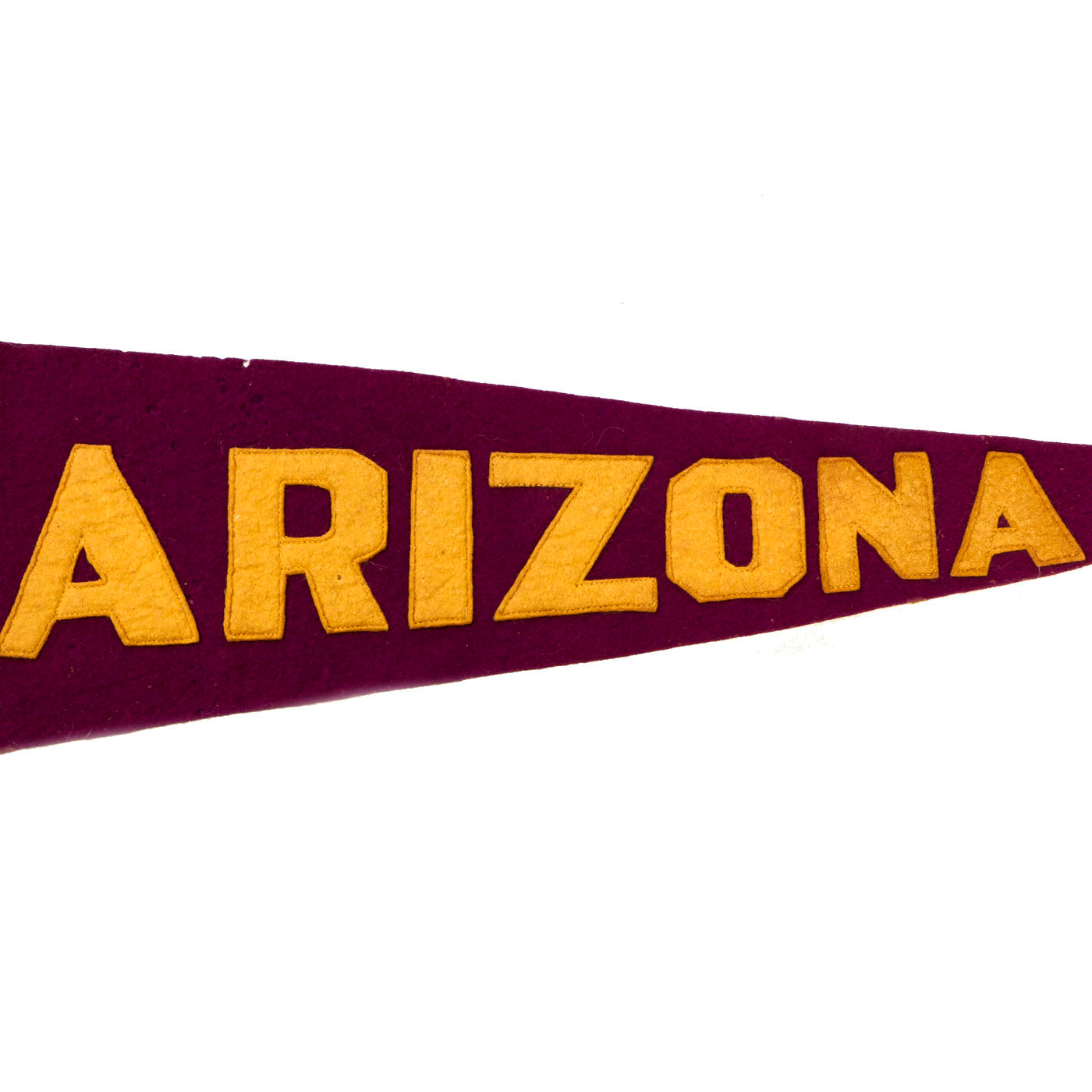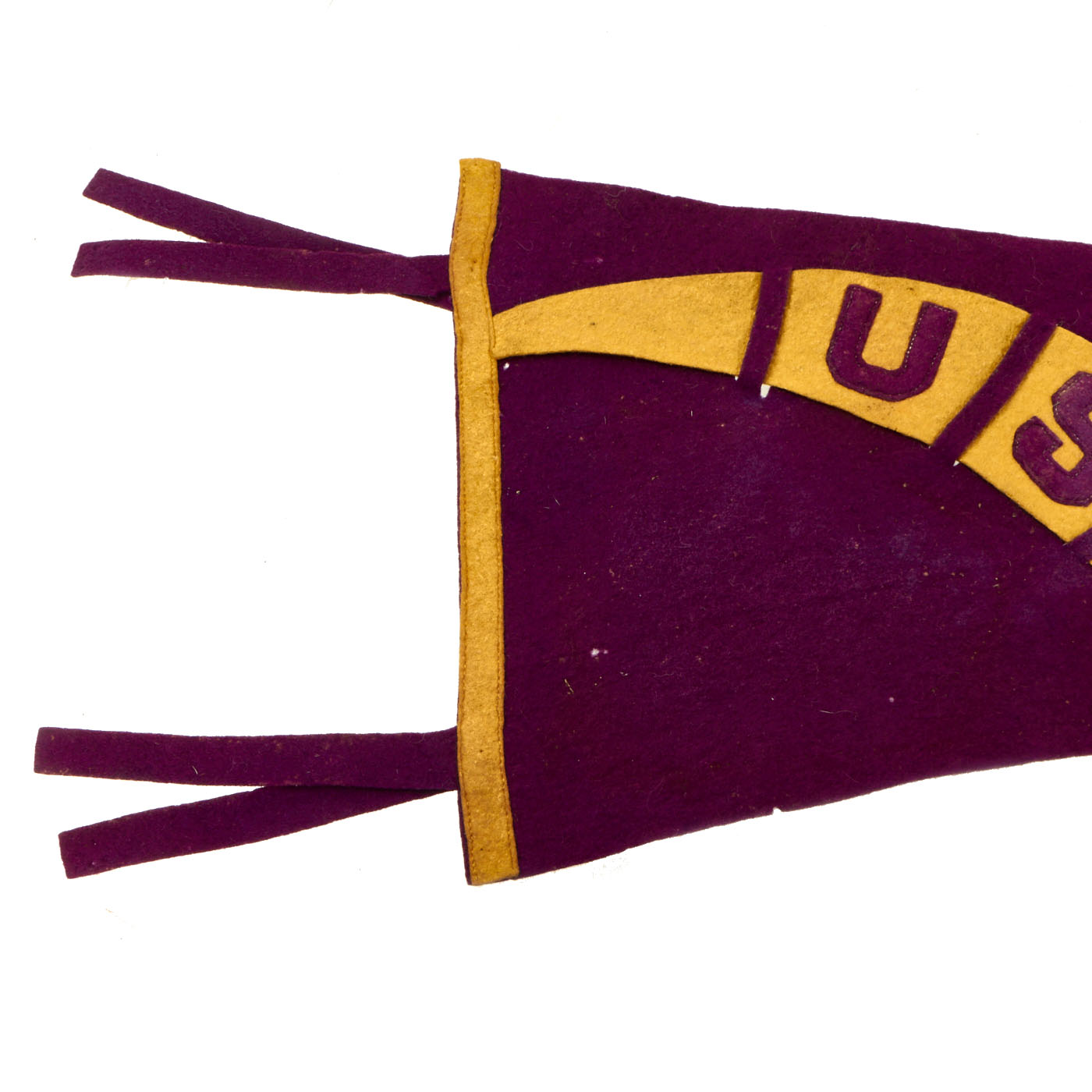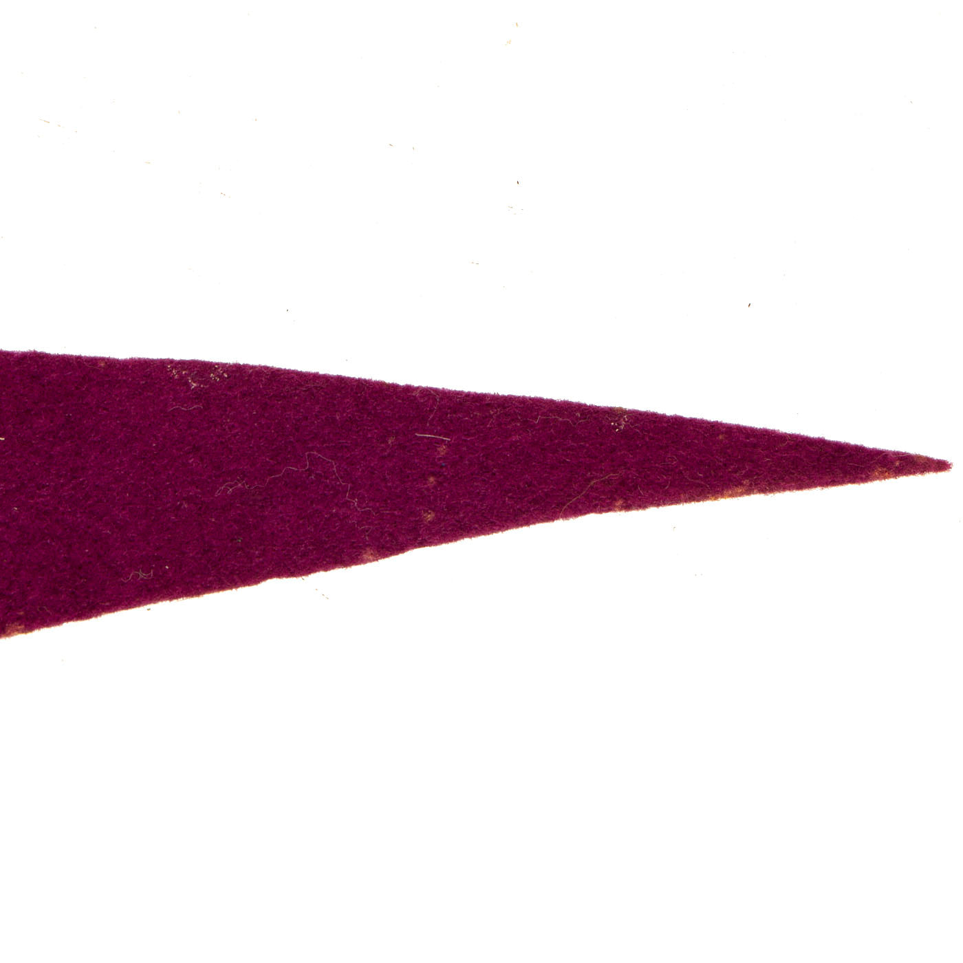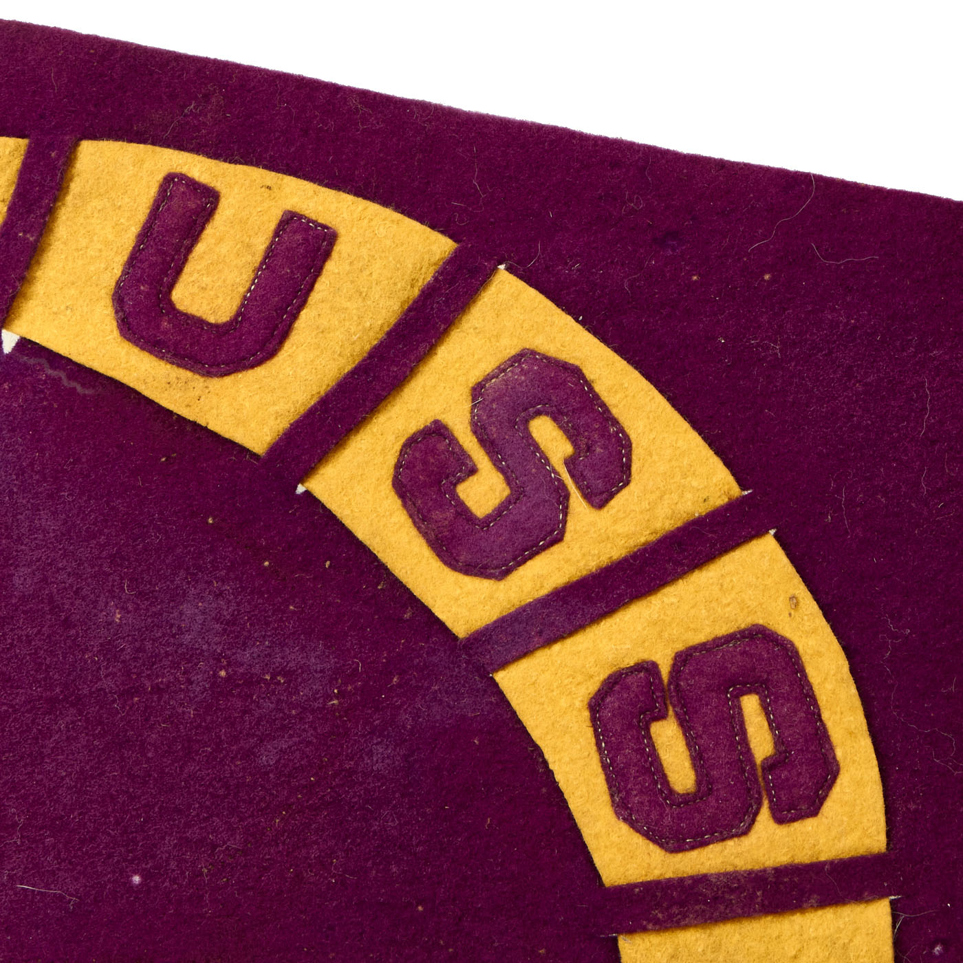 The pennant measures approximately 33 ½” with a width (at widest point) of 10 inches with 4 hanging ties measuring 4 ½” each. The overall condition is really good with the expected moth nips present. This pennant would have had a painted leather piece featuring the USS Arizona on it in the lower left corner, but unfortunately the leather piece was removed some time ago and is no longer present.