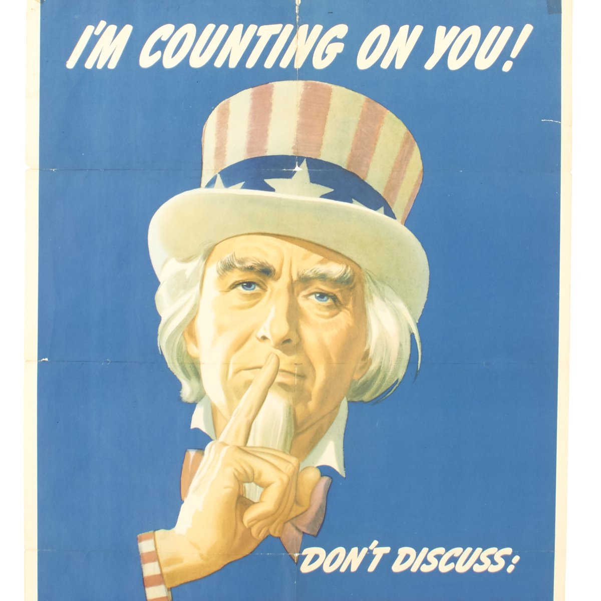 World War II poster with the message, "I'm Counting On You! Don't Discuss: Troop Movements, Ship Sailings, War Equipment." The poster shows a color drawing of Uncle Sam's head with finger to his lips on a blue background. The artist's name, "L. Helguera," is shown near the lower left corner of the drawing. Small printed text along the lower edge of the poster shows "OWI Poster No. 78 - 28 1/2 x 40. Additional copies may be obtained upon request from the Division of Public Inquiries, Office of War Information, Washington, D.C." and "U.S. Government Printing Office: 1943-O-534057."