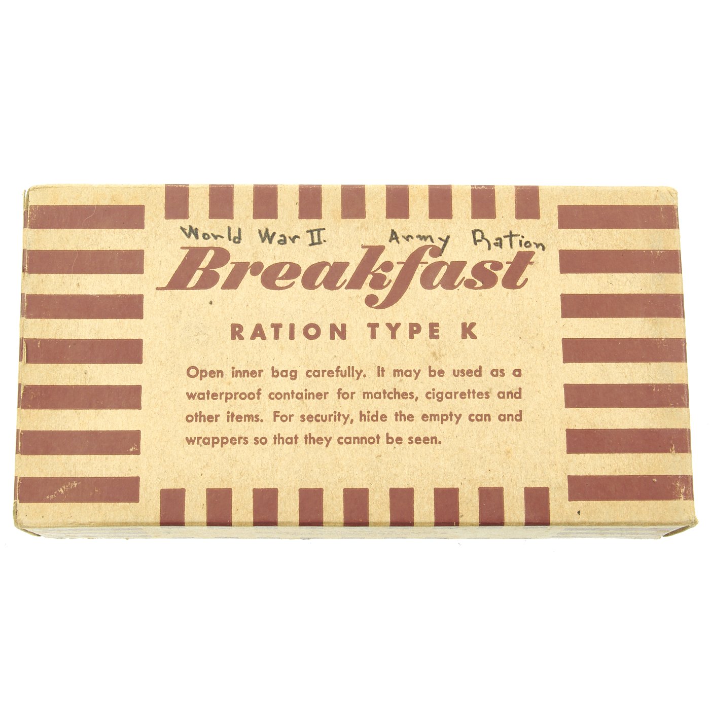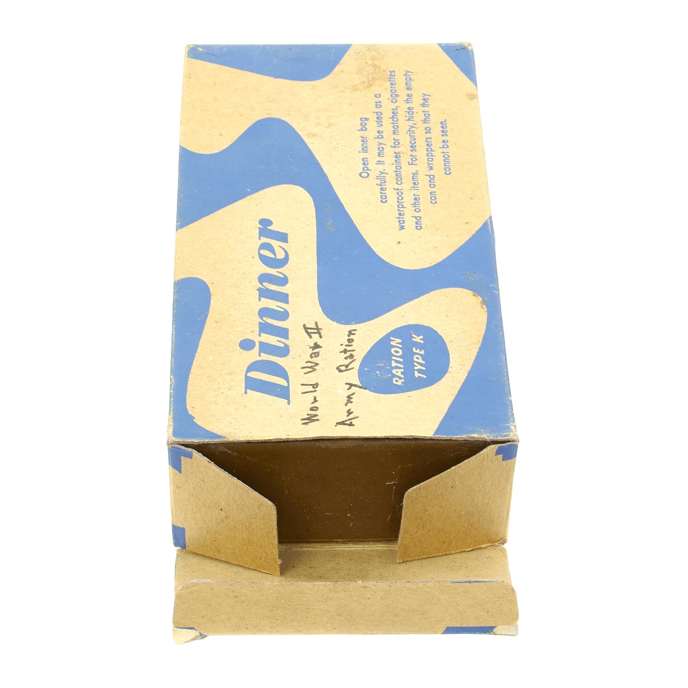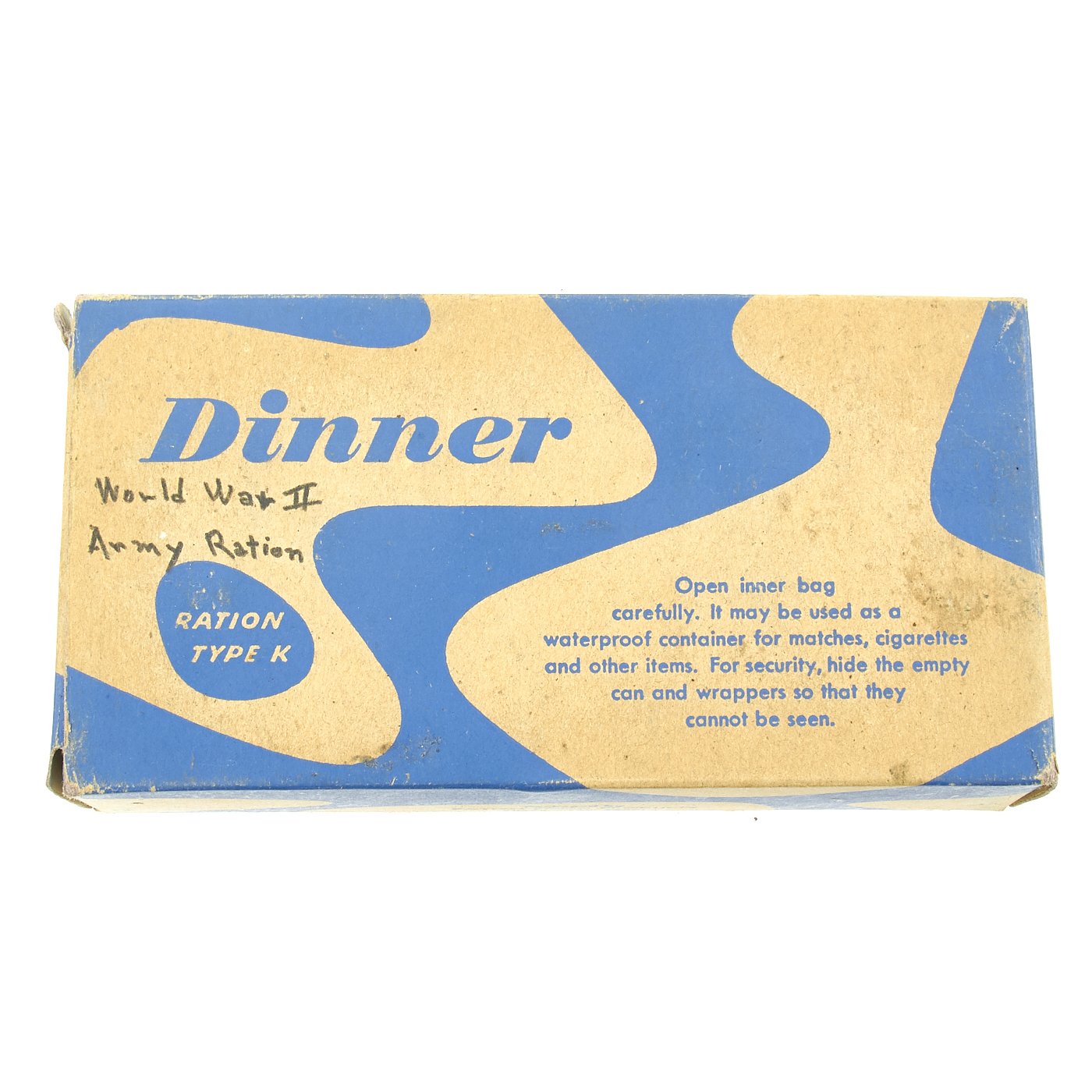Original Items: Only One Available.The K-ration was an individual daily combat food ration which was introduced by the United States Army during World War II. It was originally intended as an individually packaged daily ration for issue to airborne troops, tank crews, motorcycle couriers, and other mobile forces for a short duration. The K-ration provided three separately boxed meal units: breakfast, dinner (lunch) and supper (dinner).