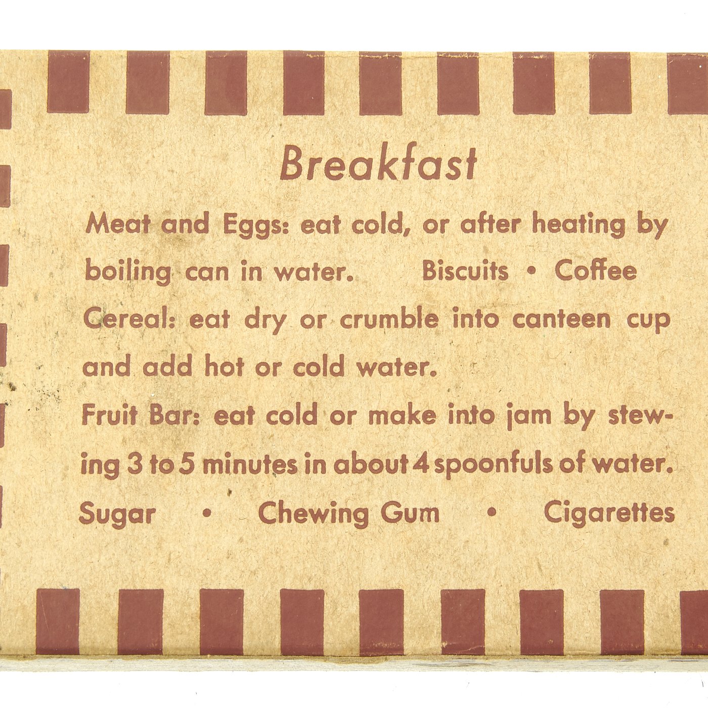 Breakfast Unit: canned entree veal (early version), canned chopped ham and eggs (all subsequent versions), biscuits, dextrose or malted milk tablets (early version), dried fruit bar, pre-mixed oatmeal cereal (late version) Halazone water purification tablets, a four-pack of cigarettes, Dentyne or Wrigley chewing gum, instant coffee, a packet of toilet paper tissues, and sugar (granulated, cubed, or compressed).