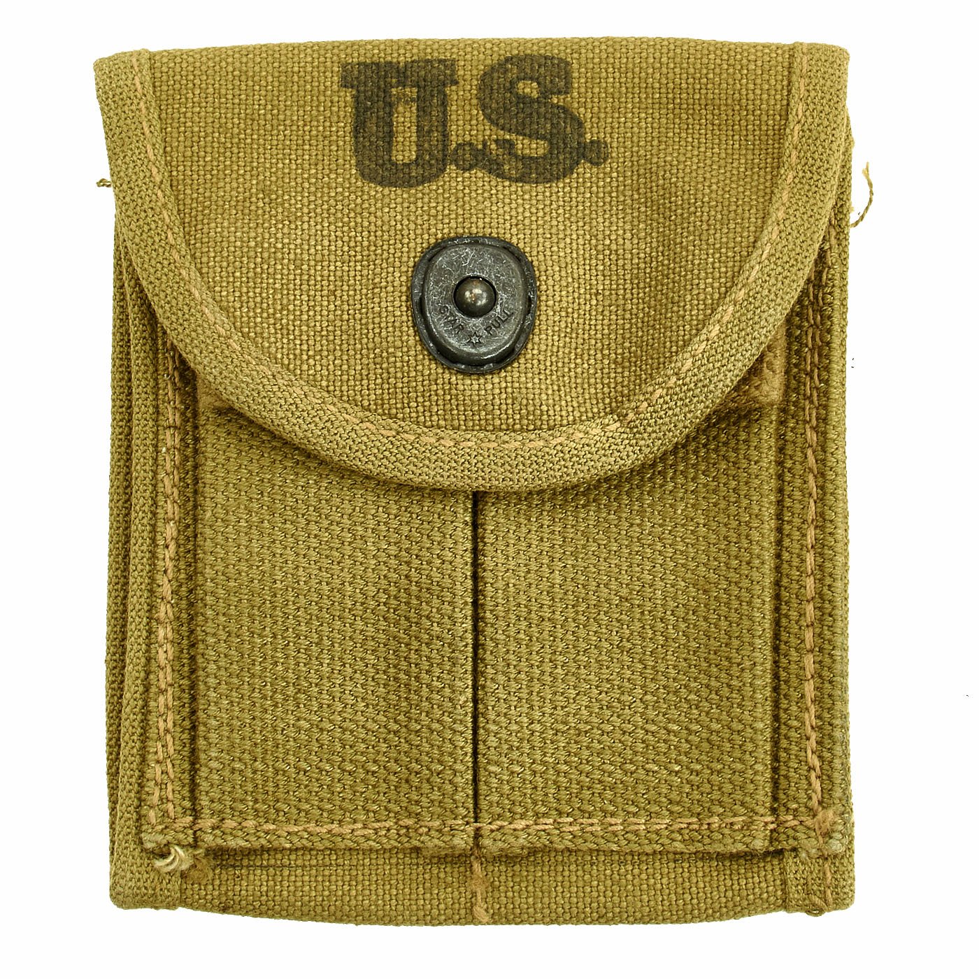 The M1 Carbine Magaine Pouch is designed to fit two 15 round magazines, and was originally intended as a belt pouch that would attach to the snap. However it was discovered that it could also fit over the carbine, and would rest securely on the butt stock area. Accounts differ on whether when on the gun it was used more for magazines or stripper clips.