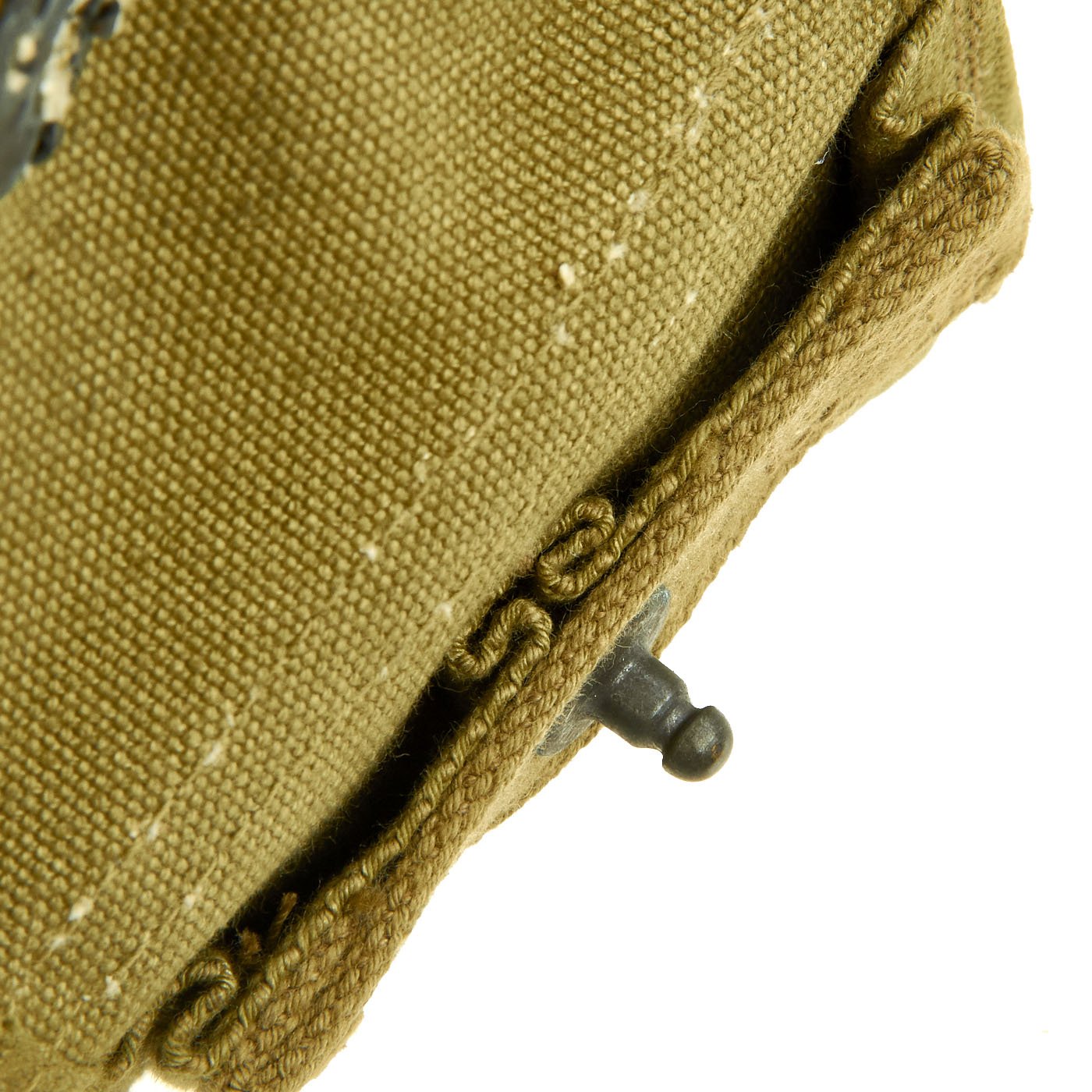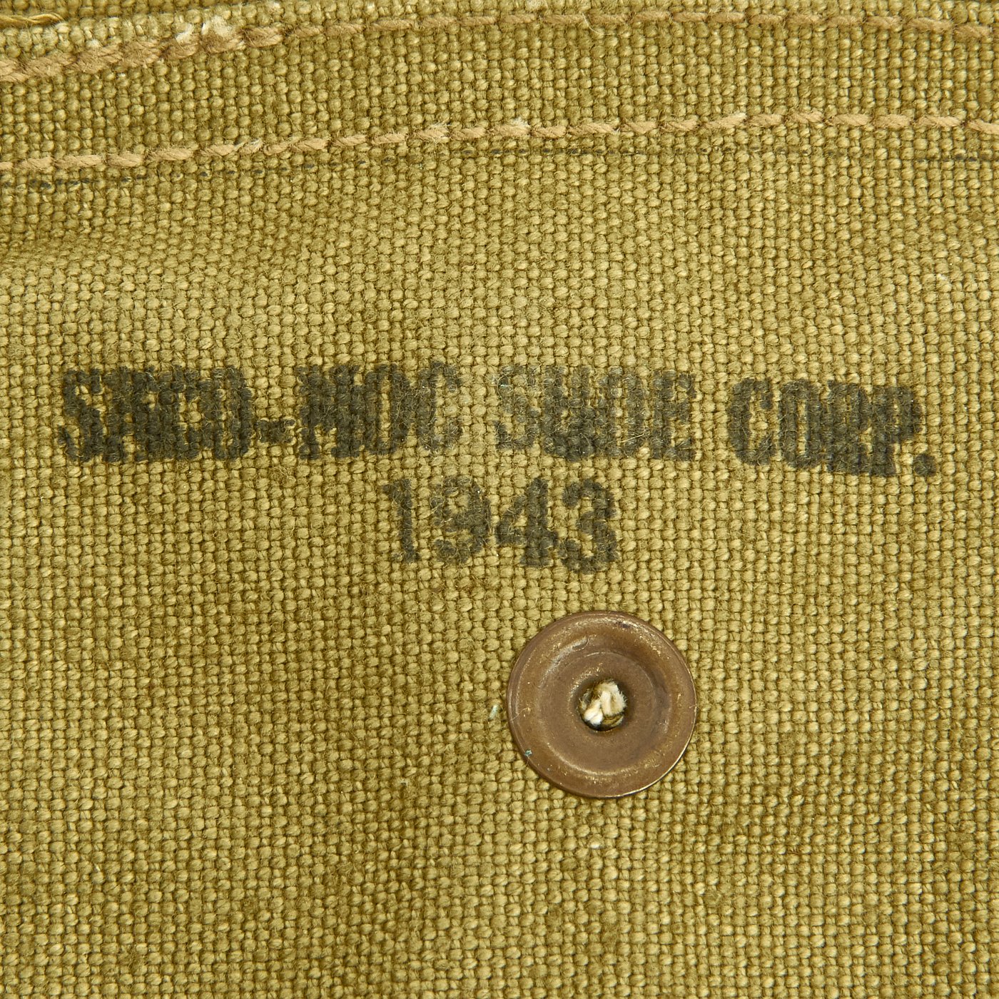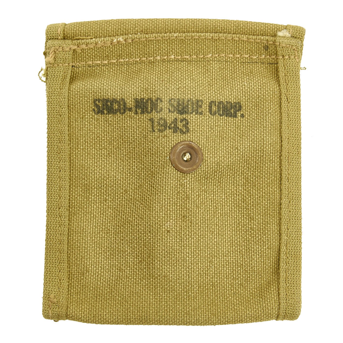 The ammo pouch is in similar condition, marked on the back SACO-MOC SHOE CORP. / 1943, and with a clear U.S. stamped on the front. The canvas is excellent, and there is just a bit of verdigris on the snaps.