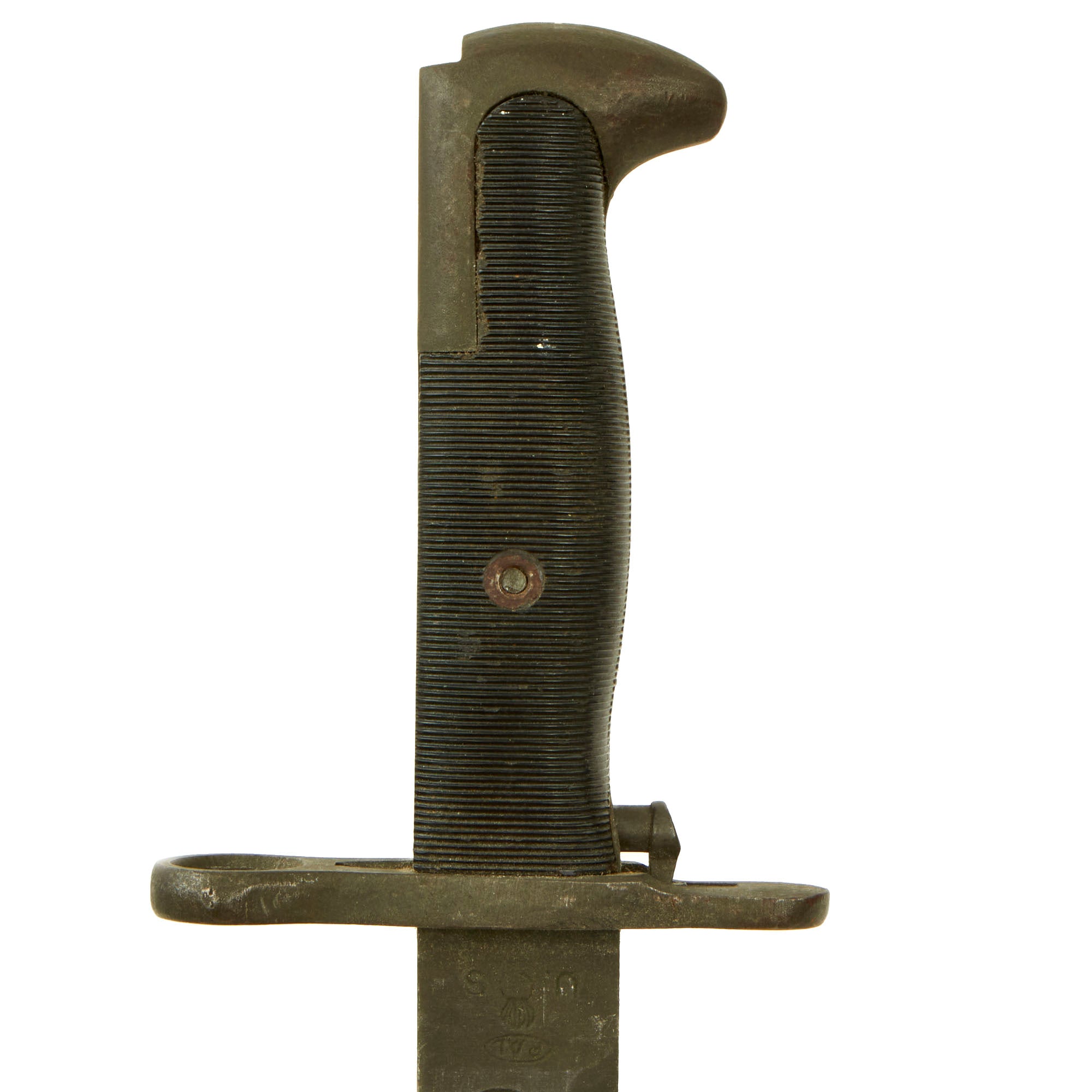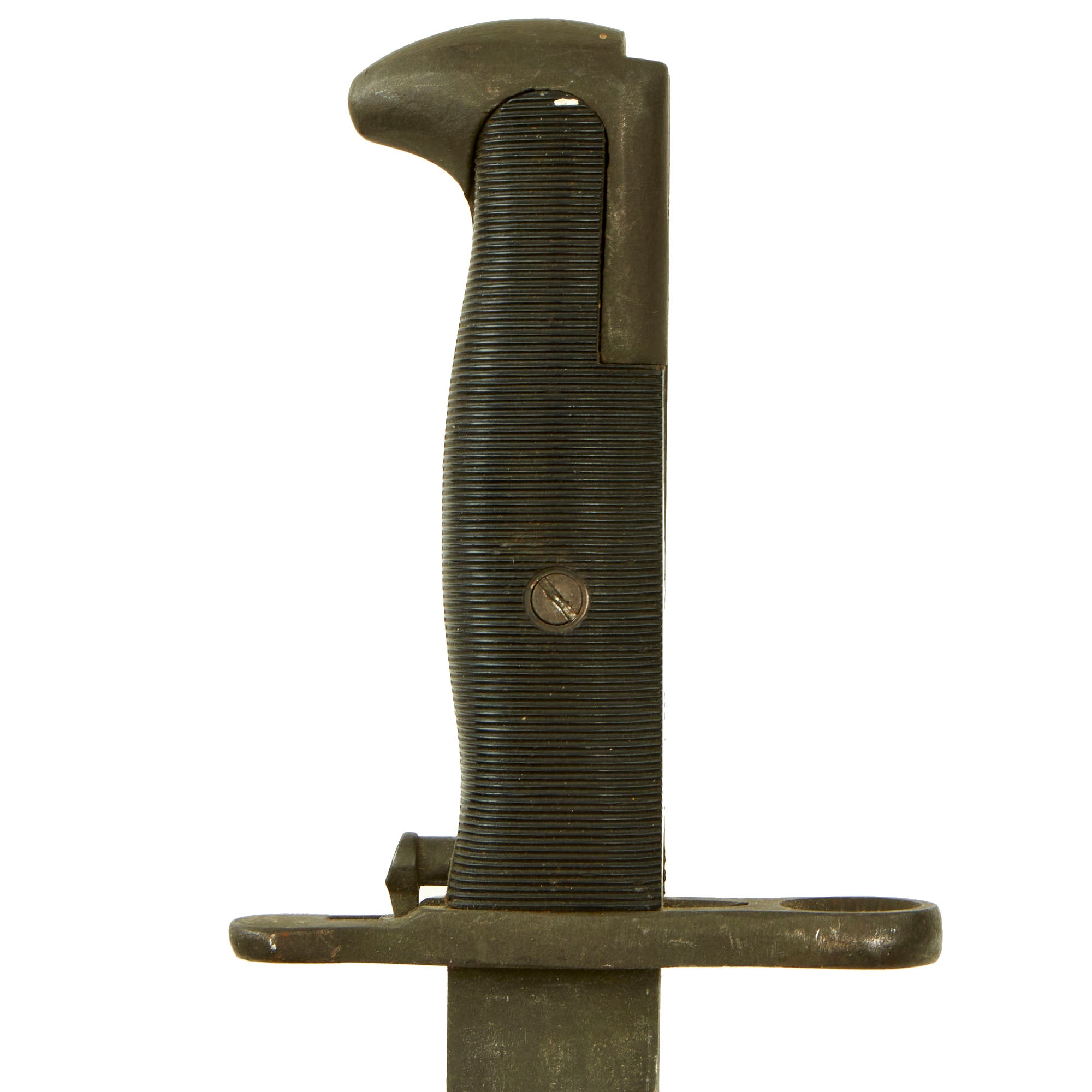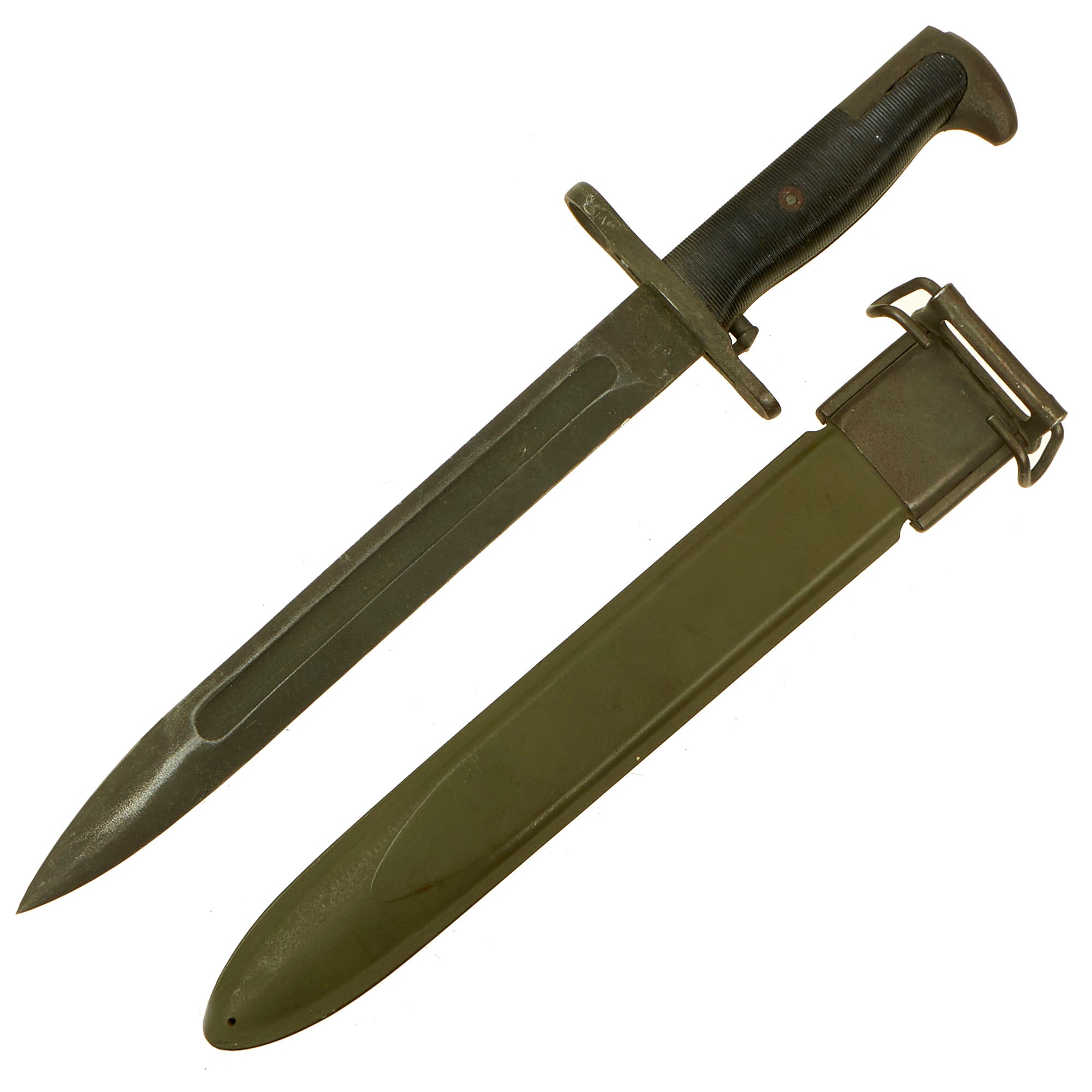 Original Item: Only One Available. This is a very nice condition U.S. M1 bayonet with a 10 inch blade for the M1 Garand Rifle, complete with the correct WWII Issue M7 scabbard. This bayonet is essentially the same as the earlier M1905 / M1942 bayonet, but with a 10 inch blade instead of 16 inches. In 1943, the U.S. Army made the decision to shorten the M1905 bayonet's blade to 10 inches (25.4 cm) and as many of the M1905 and M1942 bayonets were recalled, their blades were cut down to size, and were reissued. These shortened M1905 bayonets were re-designated as M1905E1.