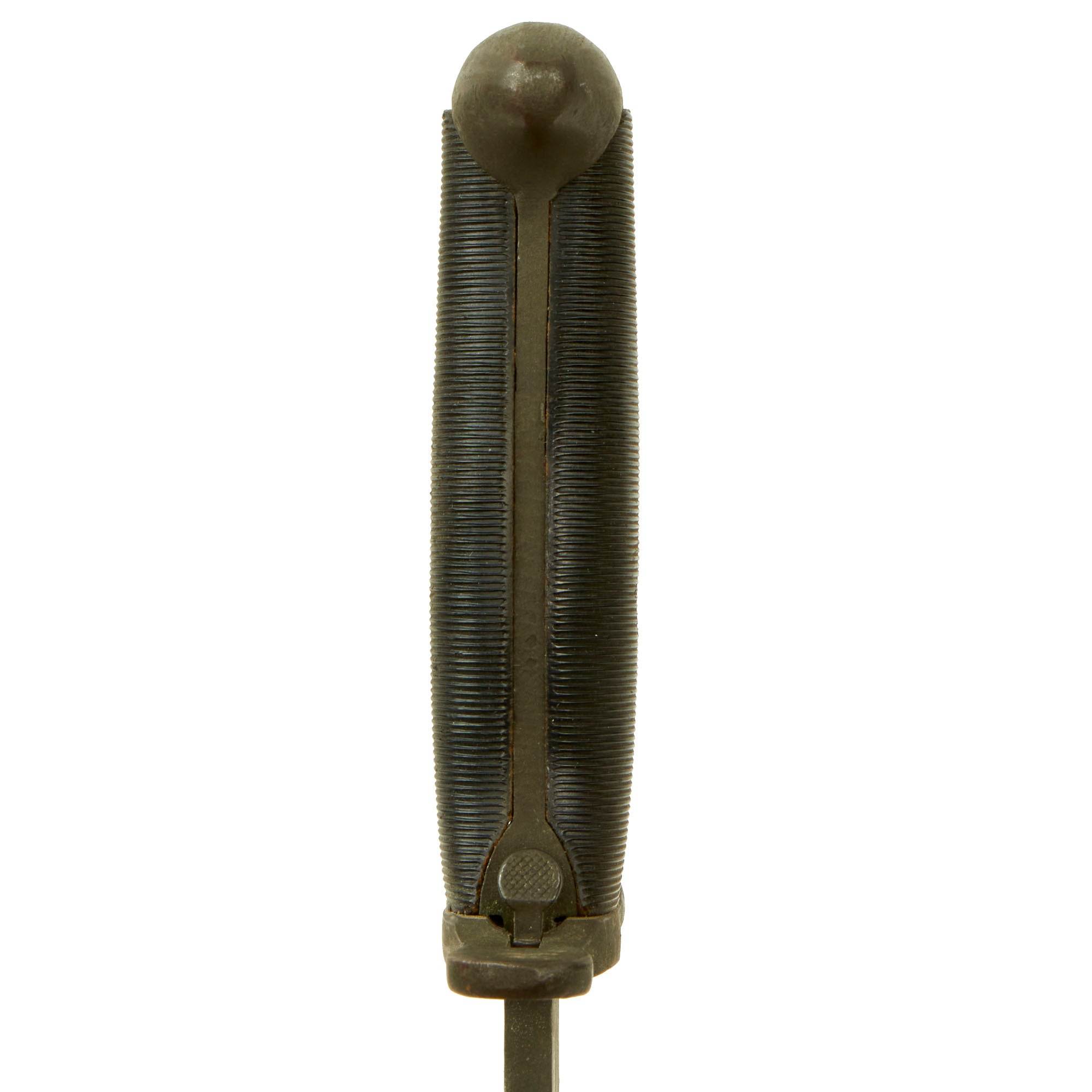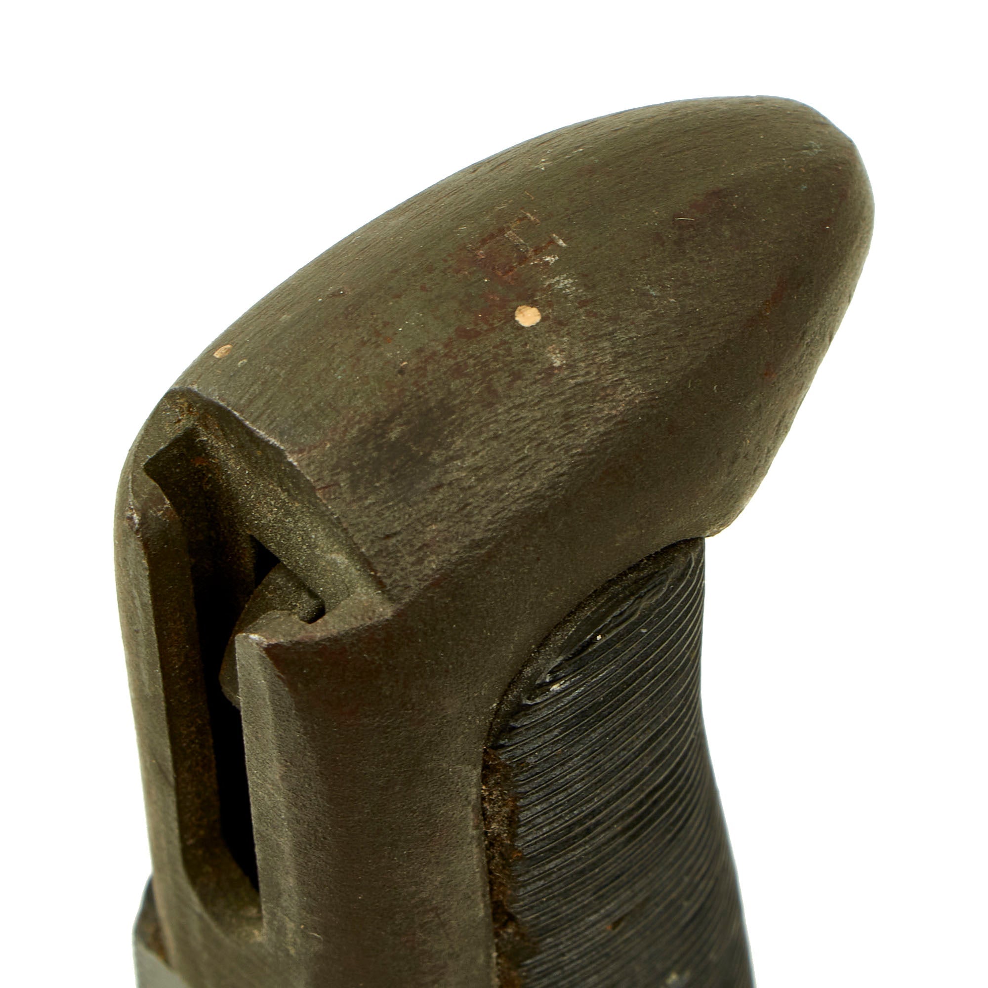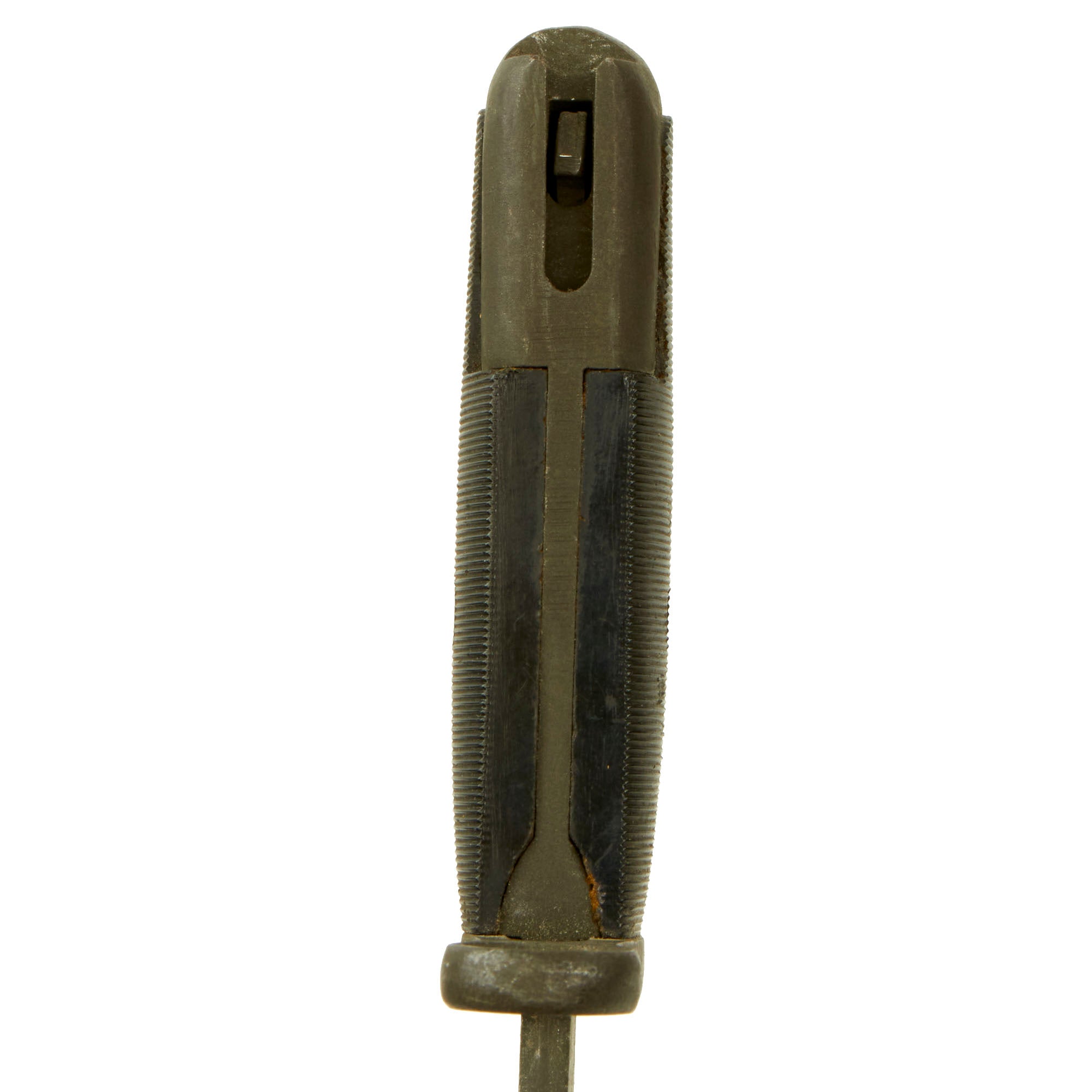 Original Item: Only One Available. This is a very nice condition U.S. M1 bayonet with a 10 inch blade for the M1 Garand Rifle, complete with the correct WWII Issue M7 scabbard. This bayonet is essentially the same as the earlier M1905 / M1942 bayonet, but with a 10 inch blade instead of 16 inches. In 1943, the U.S. Army made the decision to shorten the M1905 bayonet's blade to 10 inches (25.4 cm) and as many of the M1905 and M1942 bayonets were recalled, their blades were cut down to size, and were reissued. These shortened M1905 bayonets were re-designated as M1905E1.