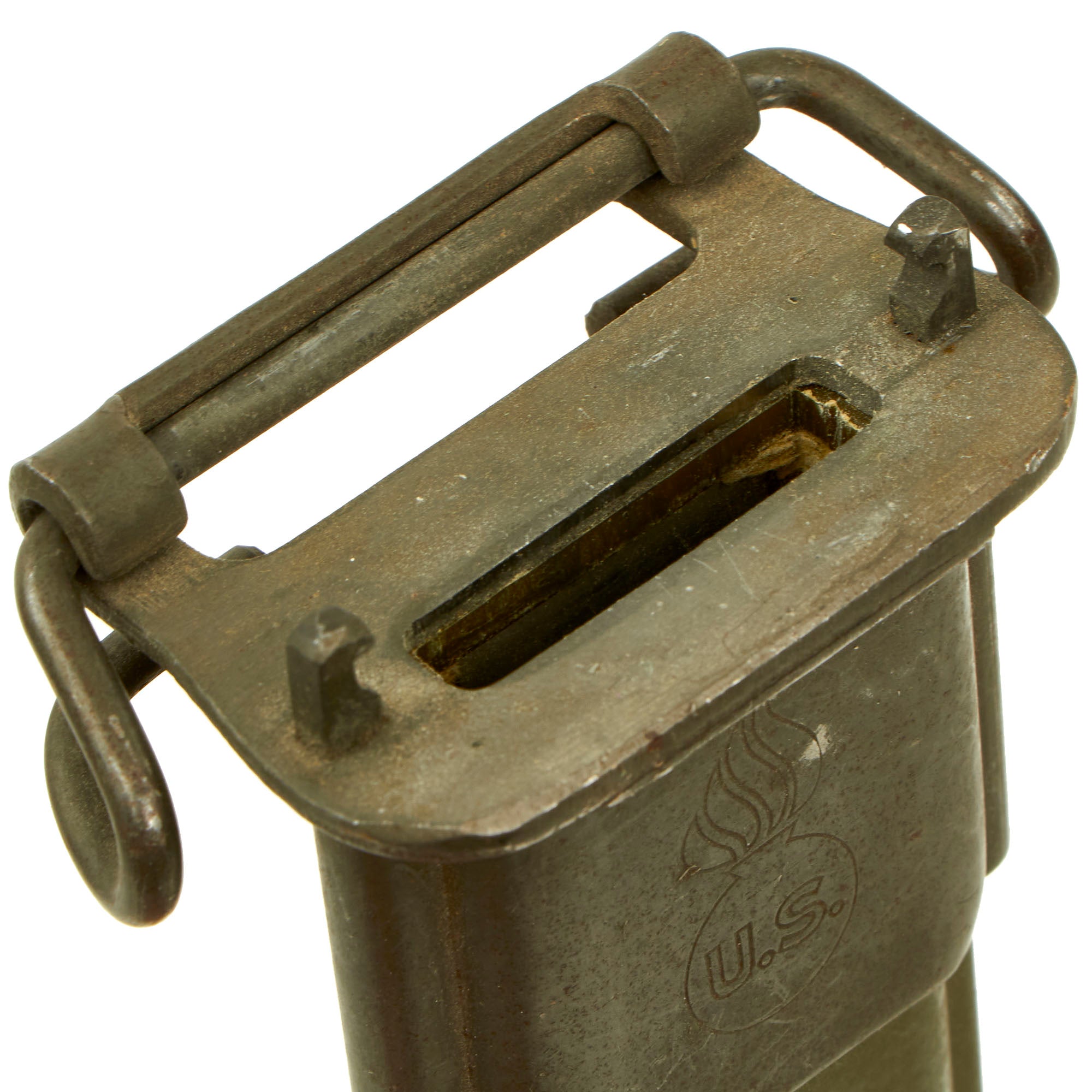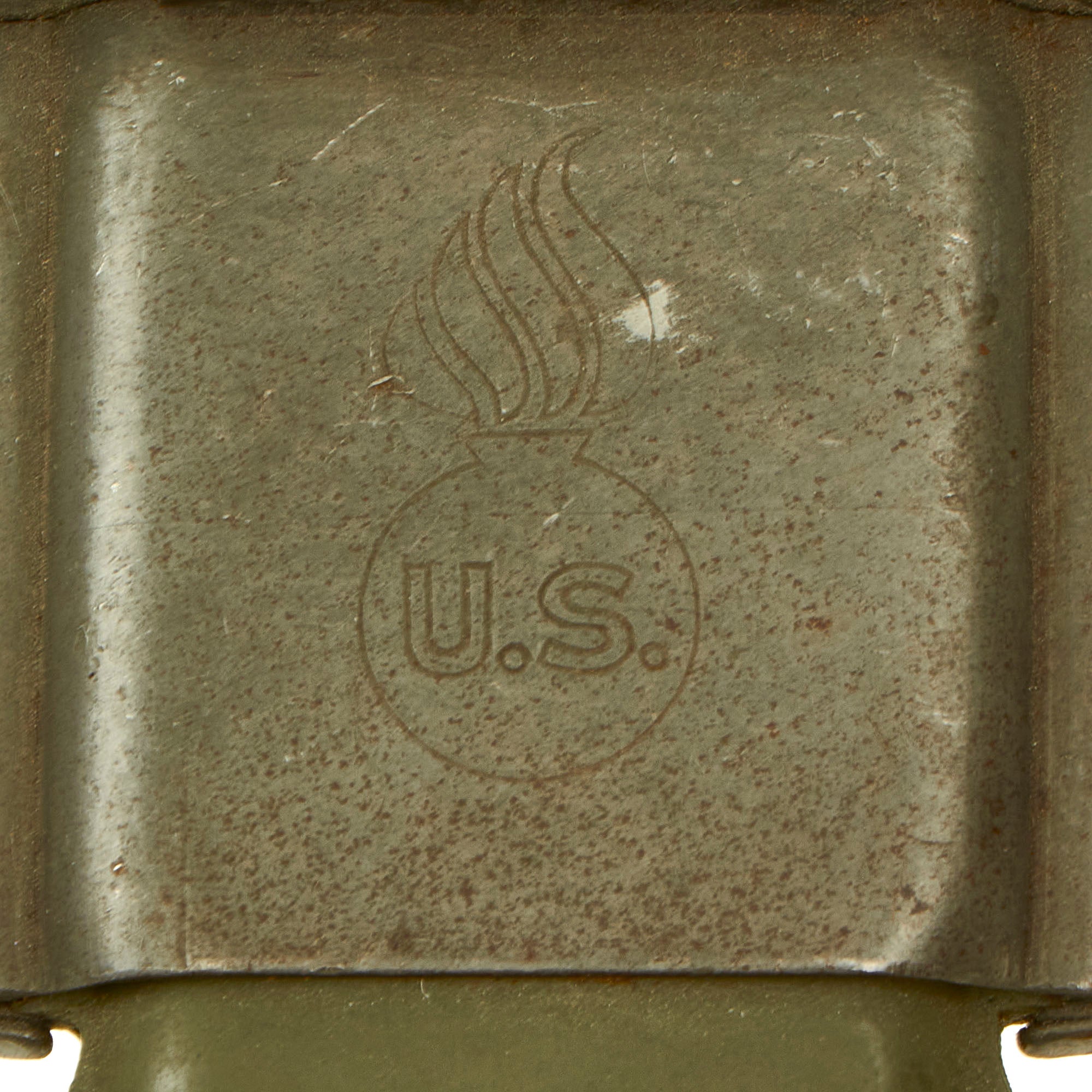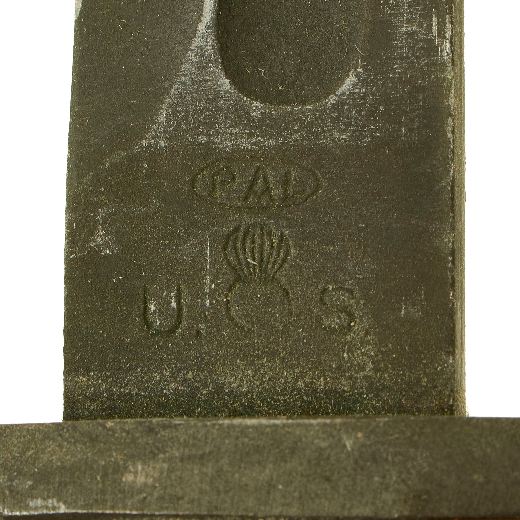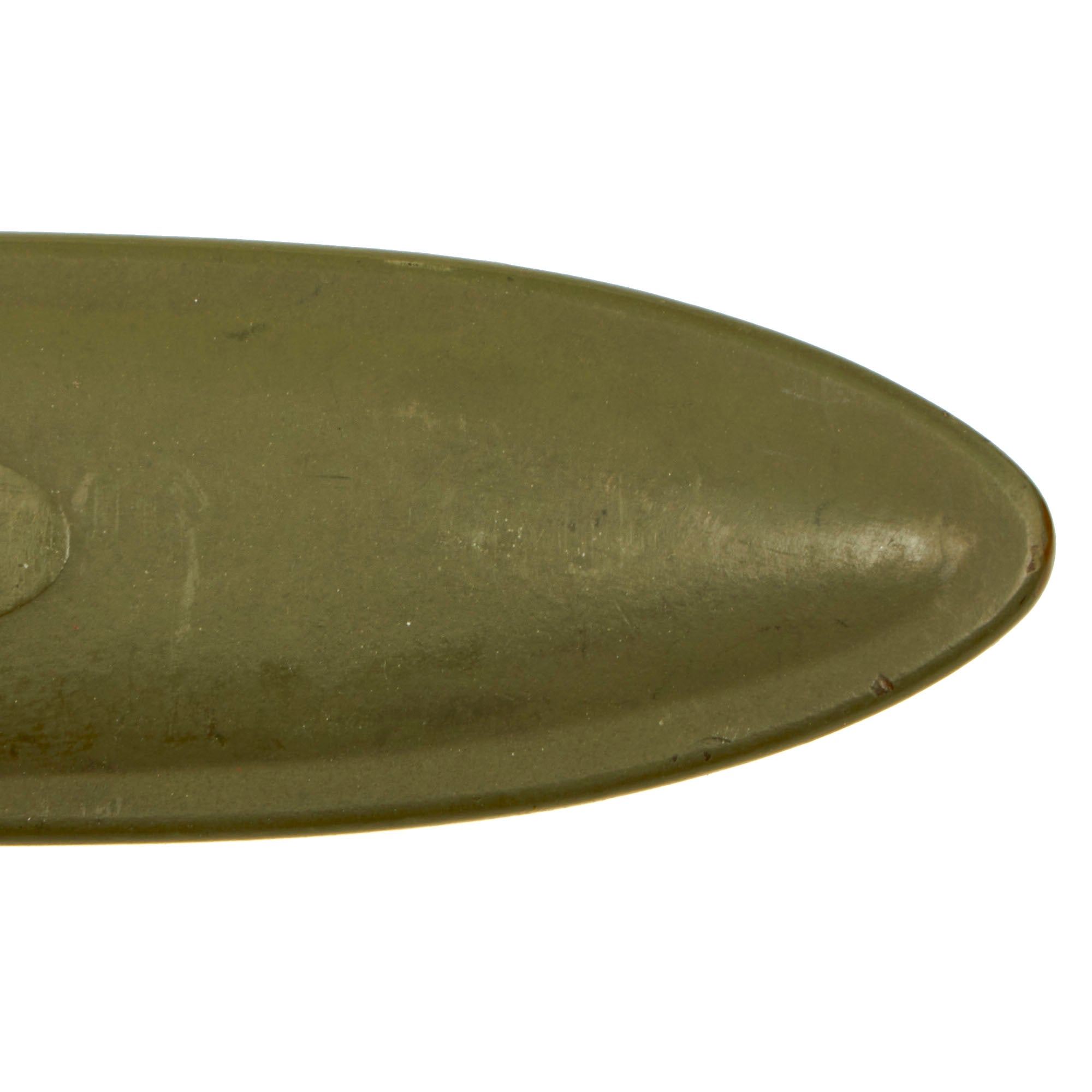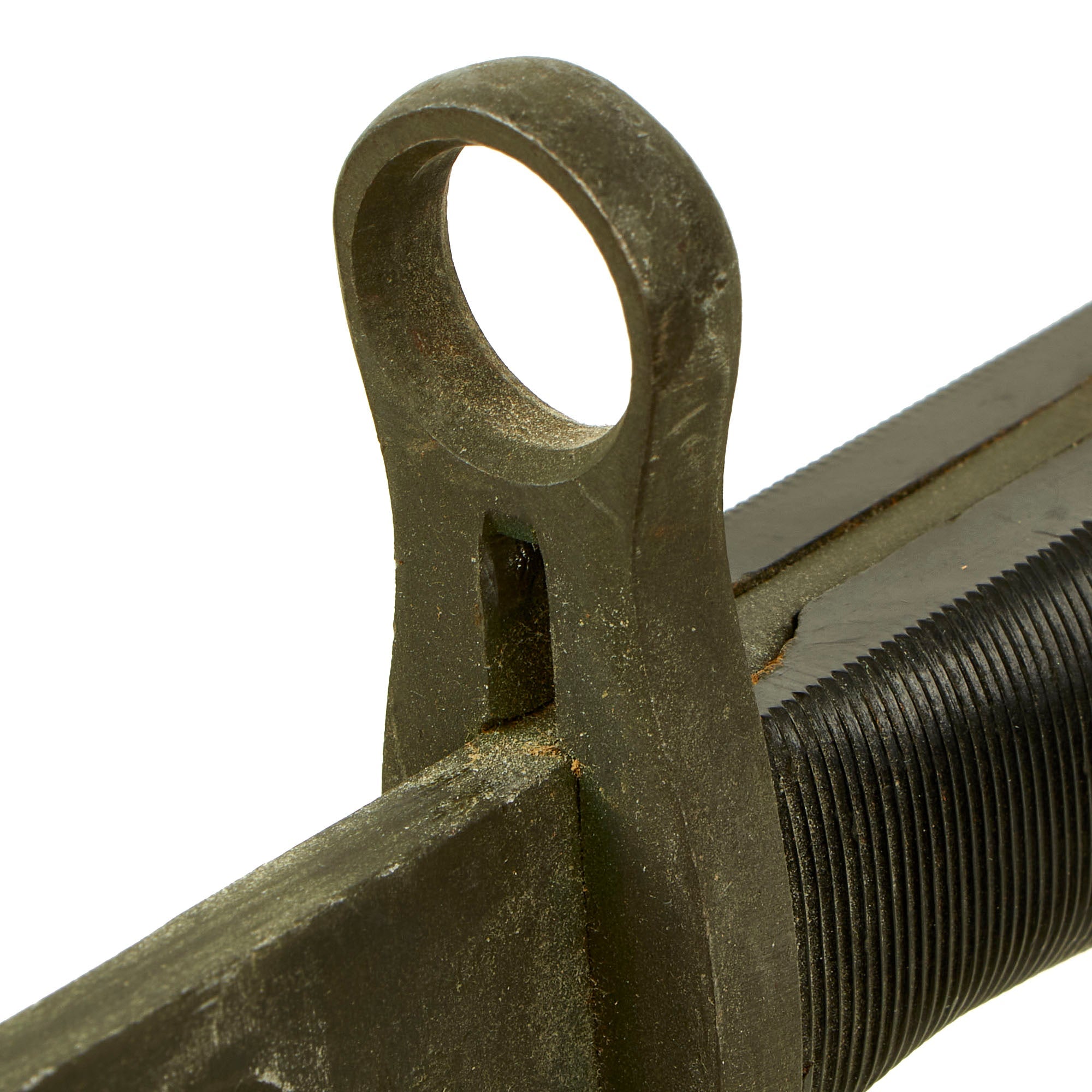 The original M7 scabbard is marked U.S. on the parkerized steel throat over the "Flaming Bomb", and is in good condition. The stylized VP marking on the underside metal throat lip and reverse of the scabbard is for Victory Plastics, who produced a variety of thermoplastic impregnated cotton fabric scabbards during the war. The scabbard body is in good shape, and looks to have been repainted during service. The throat has most of the finish worn away, showing a very nice oxidized patina.