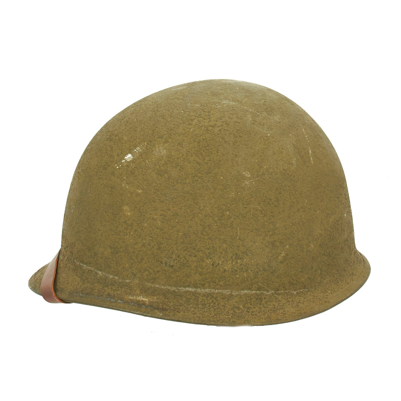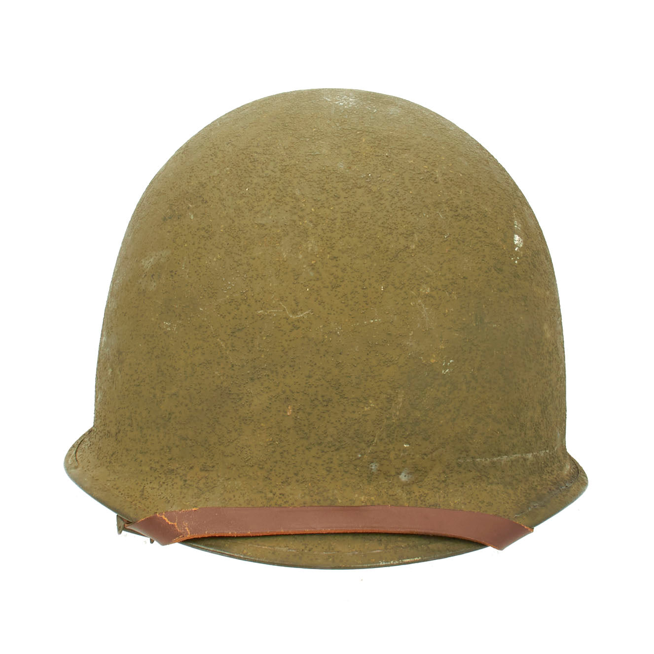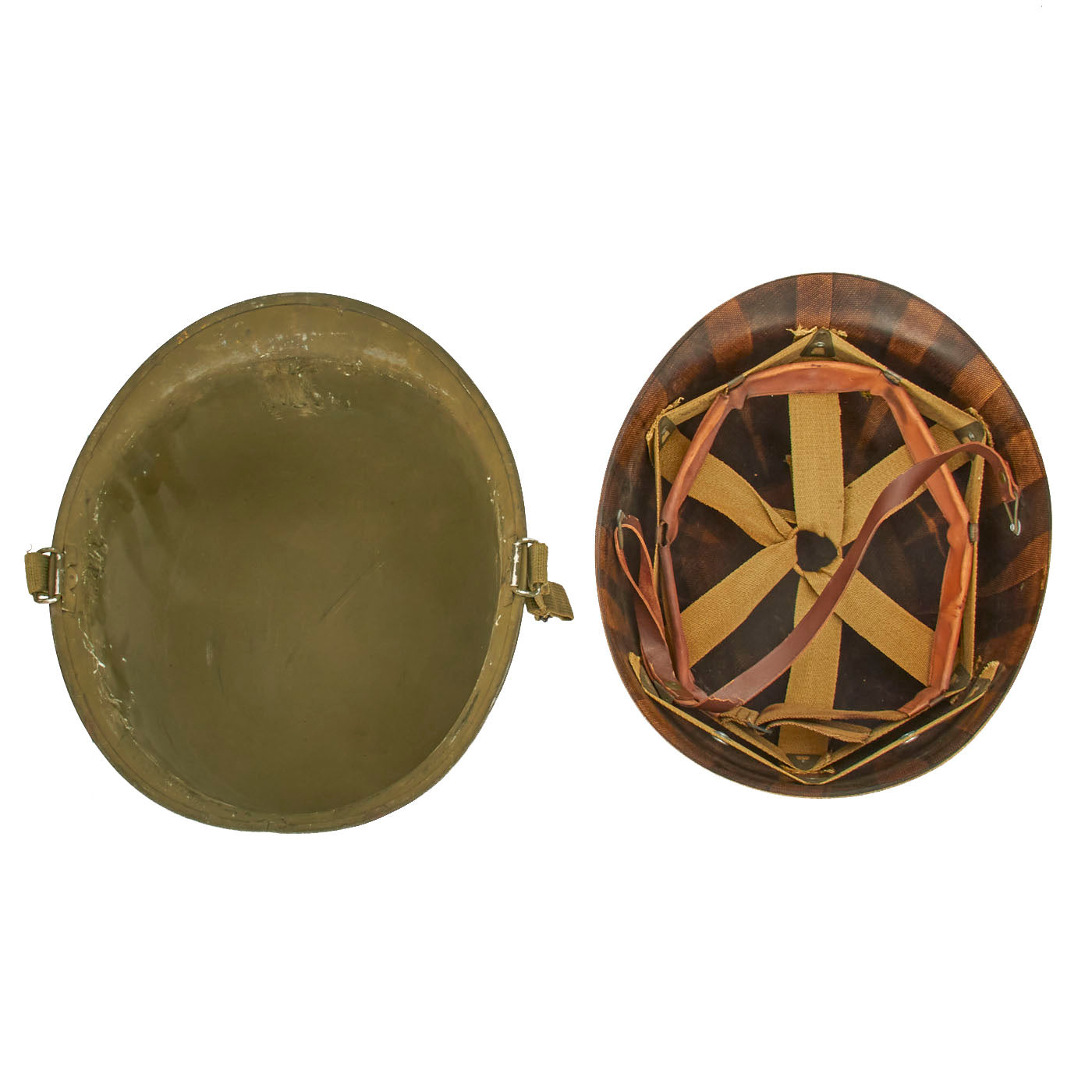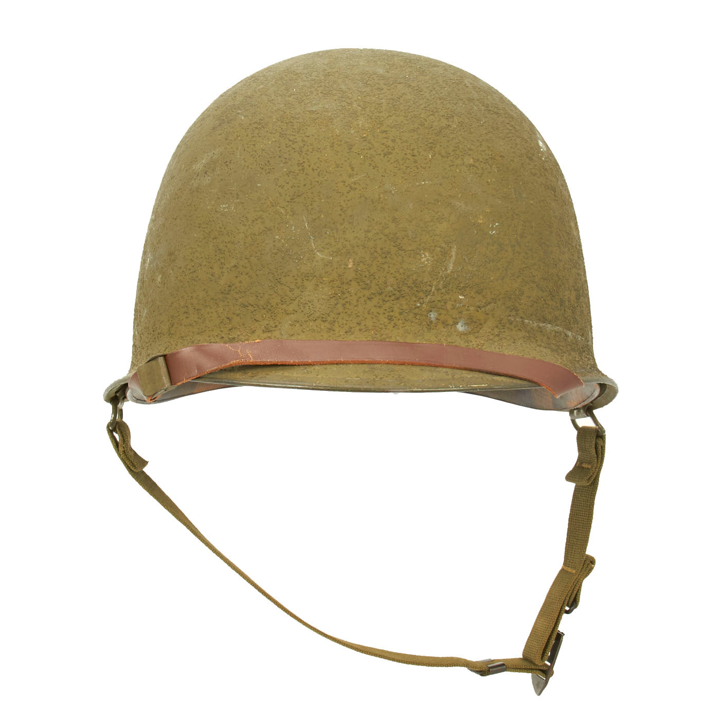 This true US WWII M-1 helmet liner can be identified through the frontal eyelet hole. Other correct WW2 features include cotton herringbone twill (HBT) cloth suspension liner, with the webbing in very good shape. This HBT suspension is held tightly within the M-1 helmet liner by rivets and a series of triangular "A" washers. The three upper suspension bands are joined together with the correct OD green string. This way the wearer could adjust the fit. The sweatband is unissued, and dated 1945 on the HBT backing. The only issue is that the leather is a bit dried out from age, with some cracking on the edge. The original leather liner chin strap is present, as is the shell chin strap, both in unissued condition. Both have the correct blackened steel hardware.