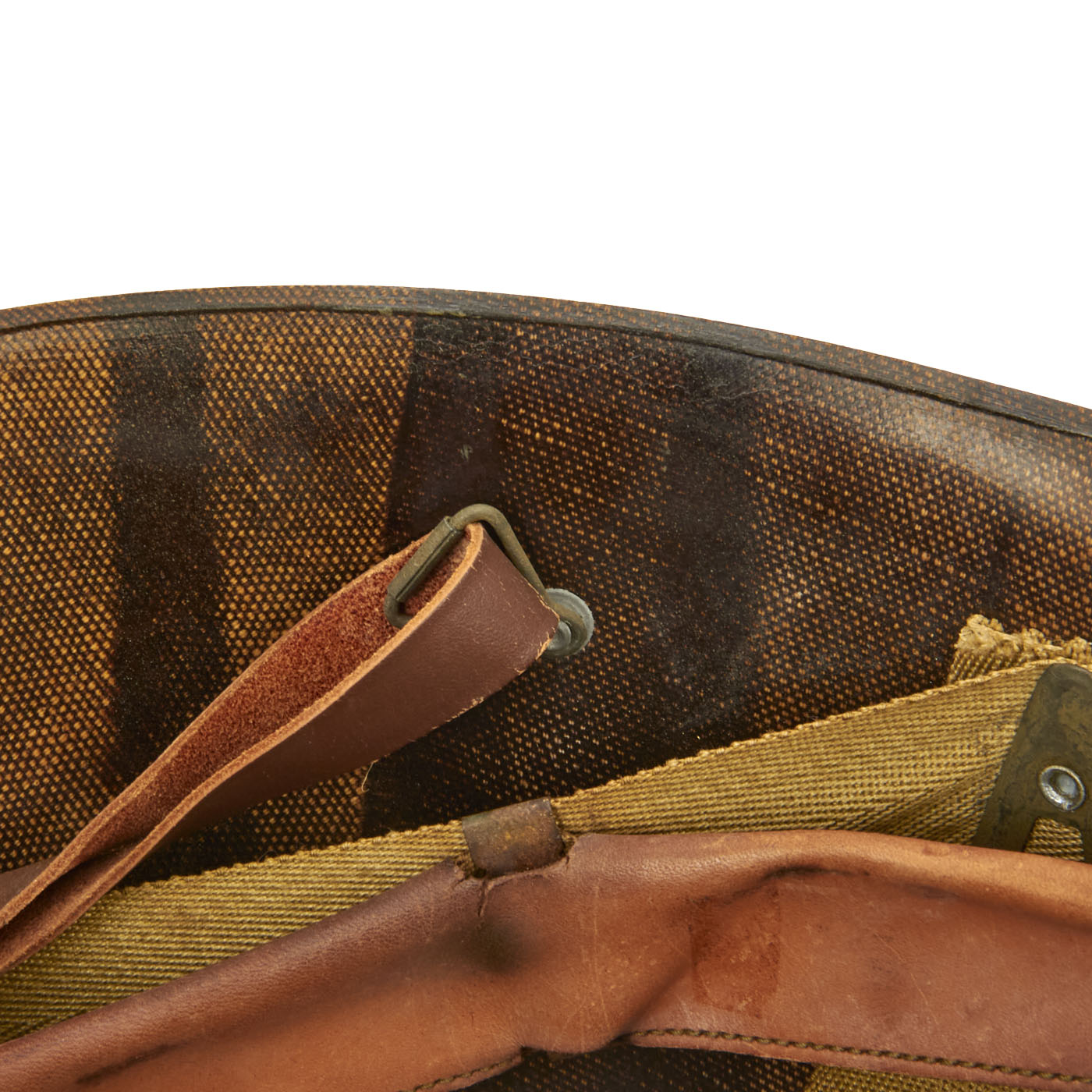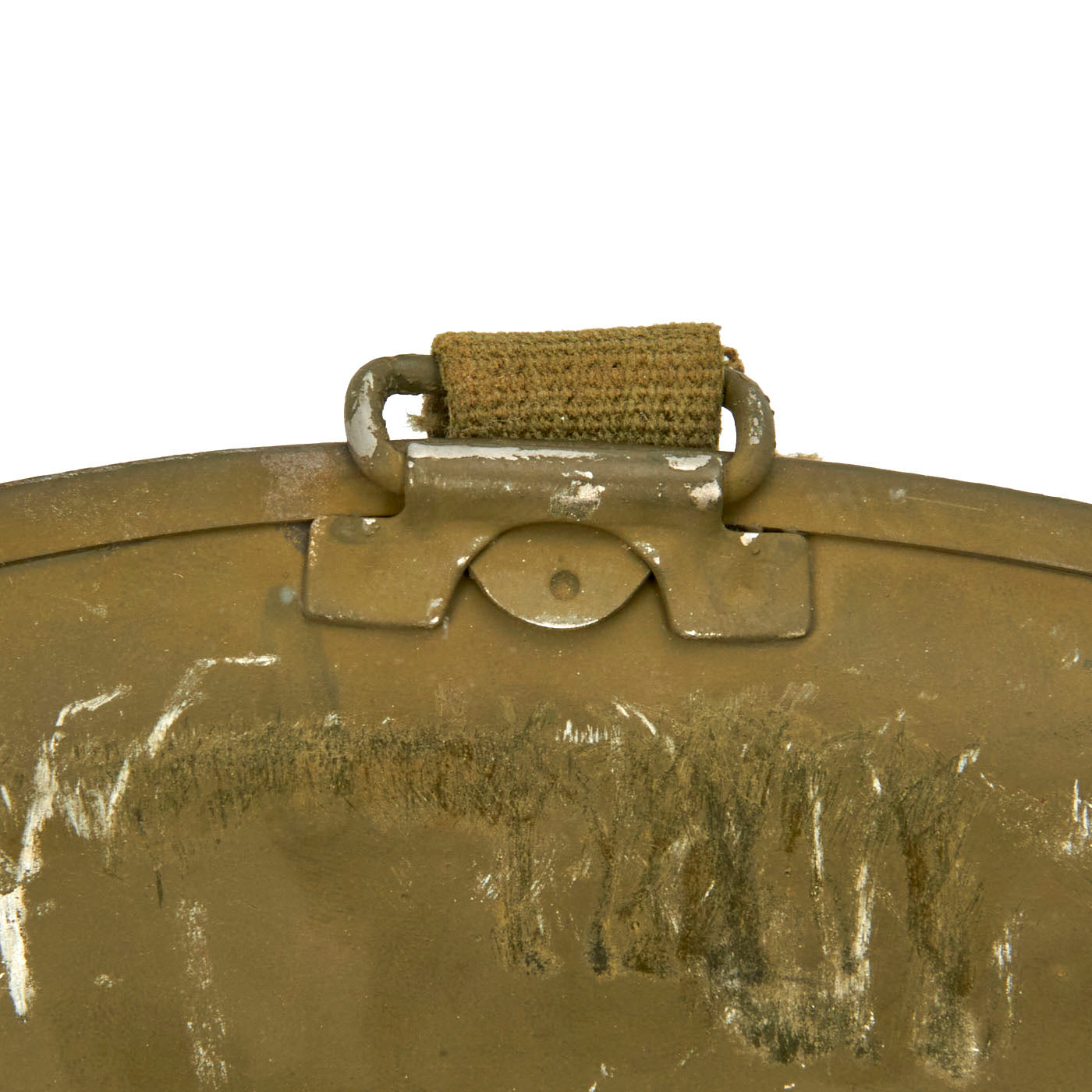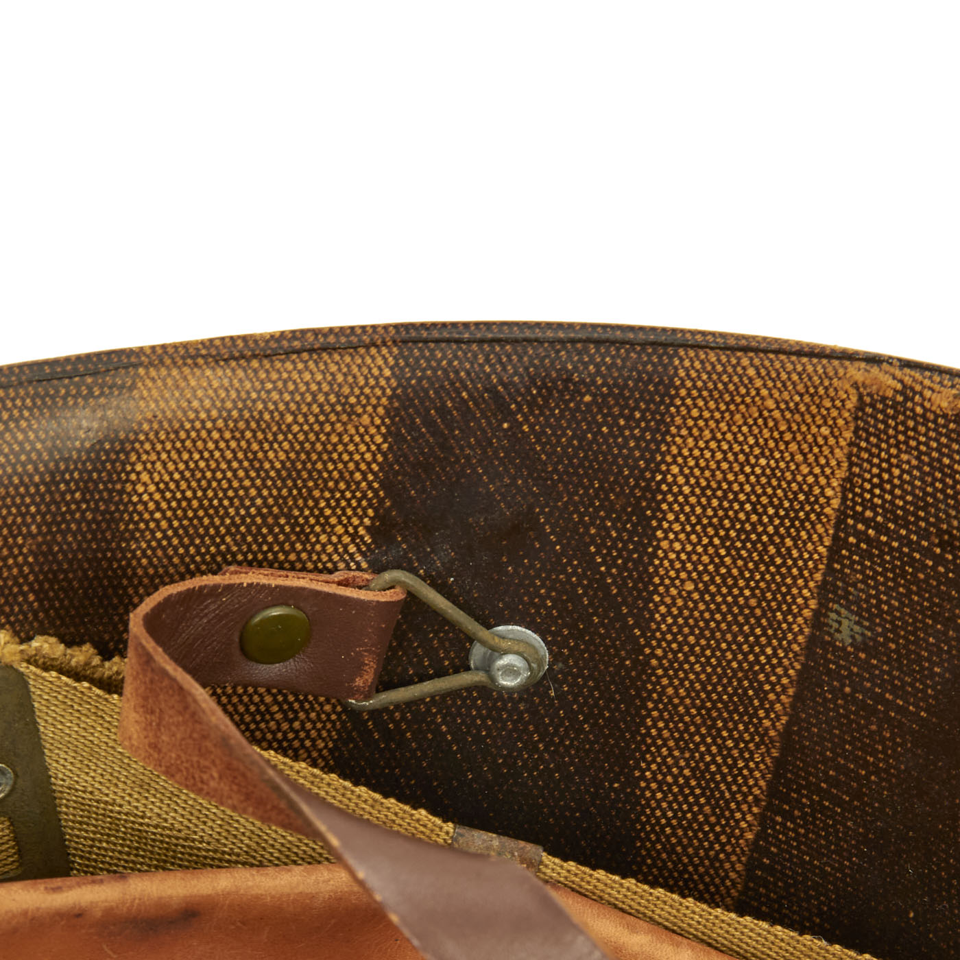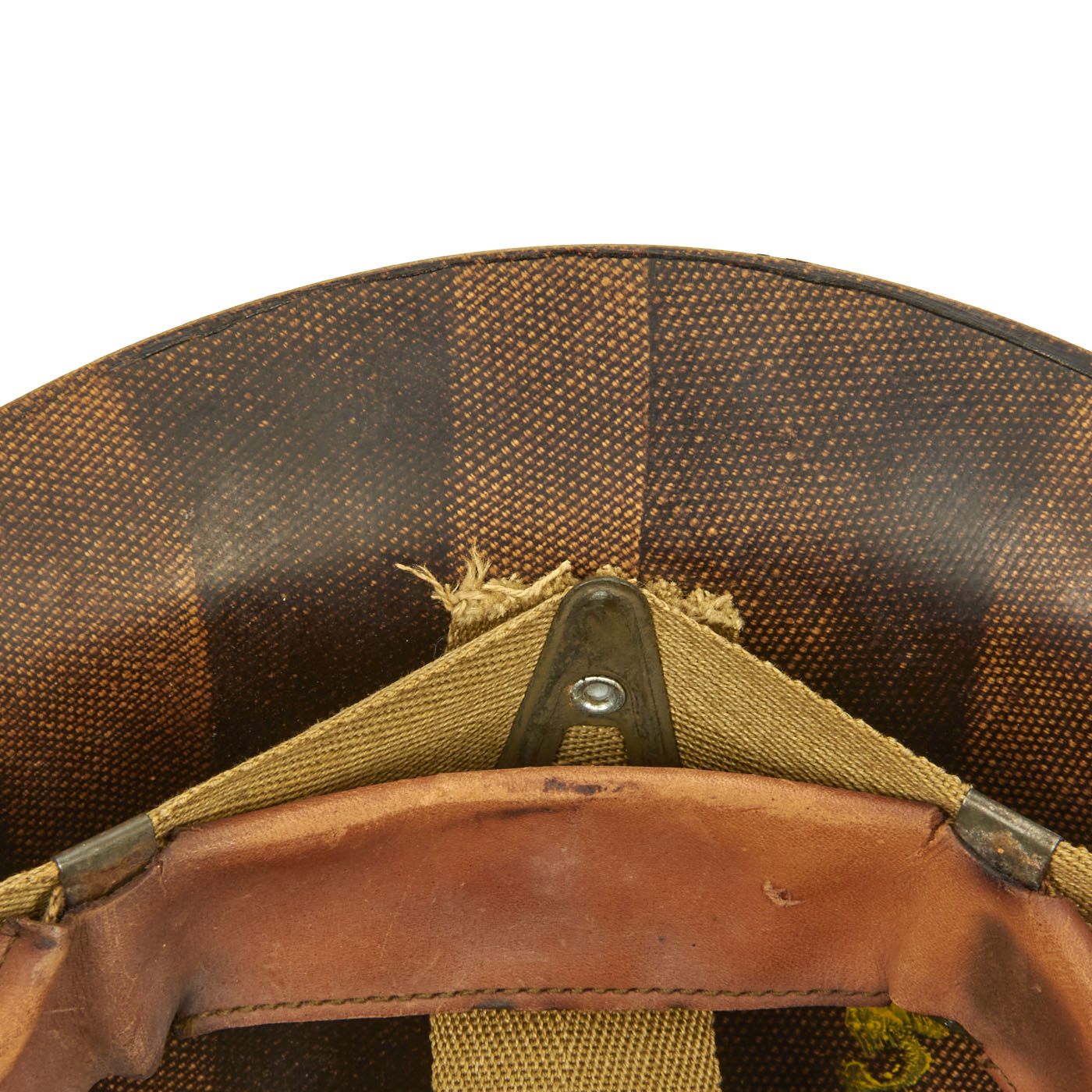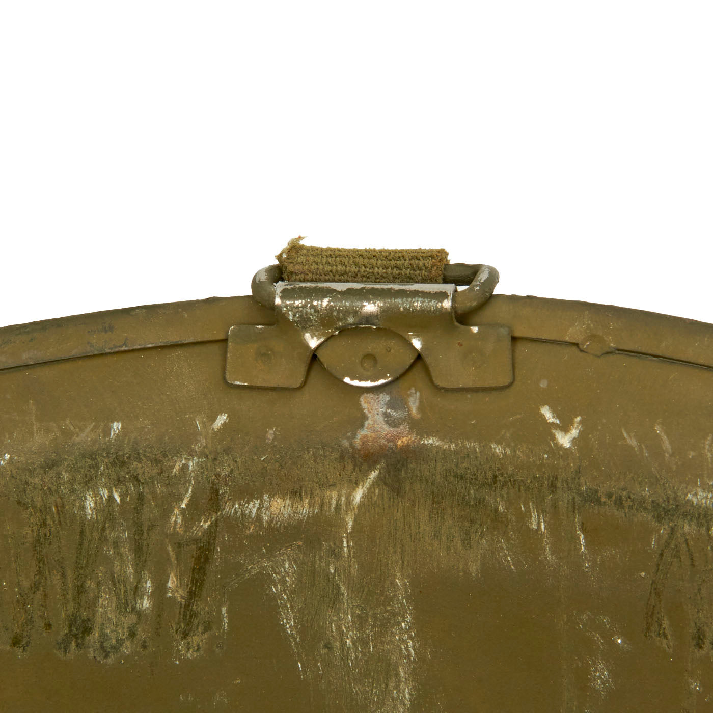 This true US WWII M-1 helmet liner can be identified through the frontal eyelet hole. Other correct WW2 features include cotton herringbone twill (HBT) cloth suspension liner, with the webbing in very good shape. This HBT suspension is held tightly within the M-1 helmet liner by rivets and a series of triangular "A" washers. The three upper suspension bands are joined together with the correct OD green string. This way the wearer could adjust the fit. The sweatband is unissued, and dated 1945 on the HBT backing. The only issue is that the leather is a bit dried out from age, with some cracking on the edge. The original leather liner chin strap is present, as is the shell chin strap, both in unissued condition. Both have the correct blackened steel hardware.