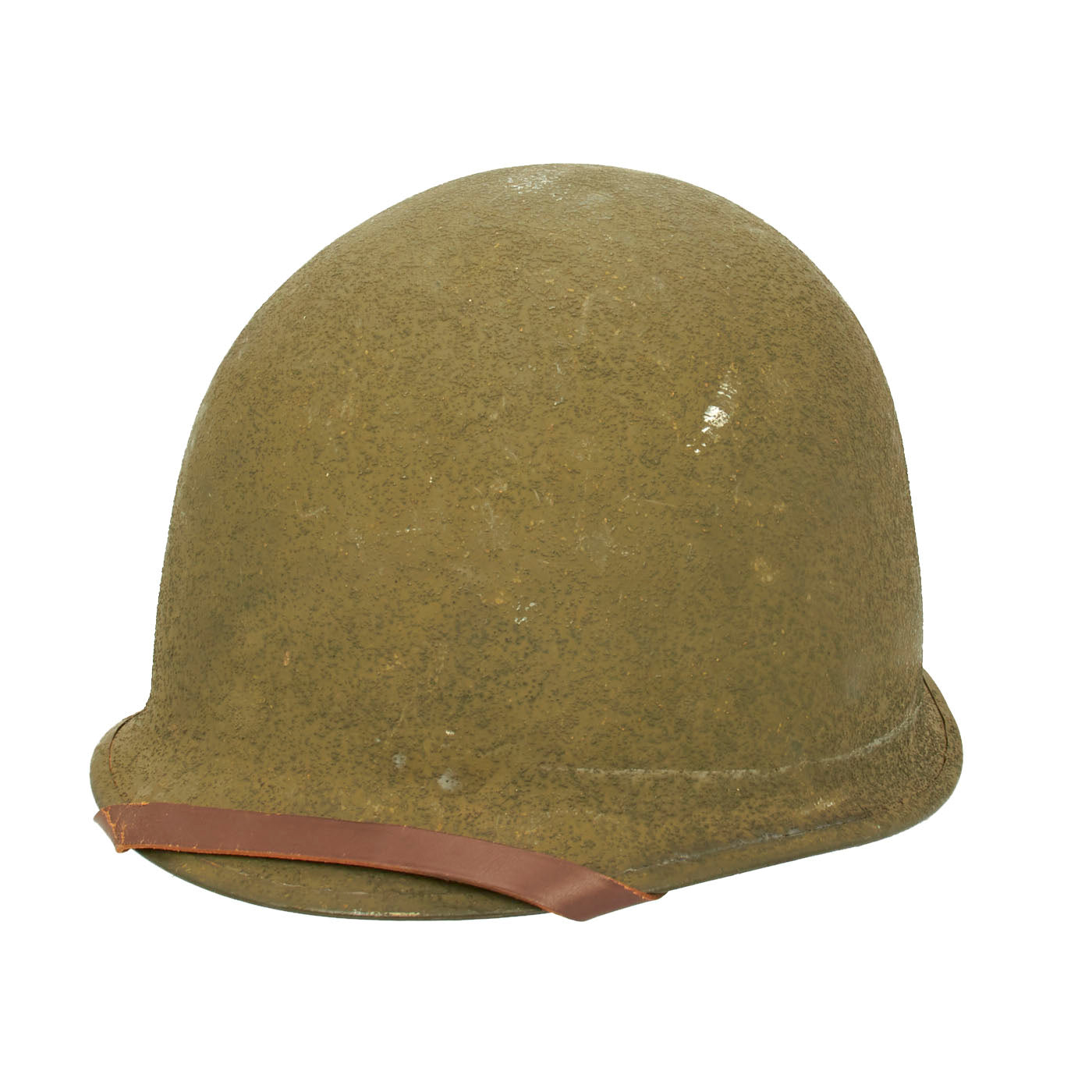 This fantastic condition M1 shell has correct late war swivel (movable) chinstrap loops called "bales" and a stainless steel rim with a rear seam. These rims were both rust resistant and had "non-magnetic qualities" that reduced the chance of error readings when placed around certain sensitive equipment (such as a compass). In November 1944 the specification was changed to have the rim seam in the rear of the helmet. This helmet is an excellent unissued, mint example and still retains all of its original WW2 parts and the shell has all original "corked" grain paint.