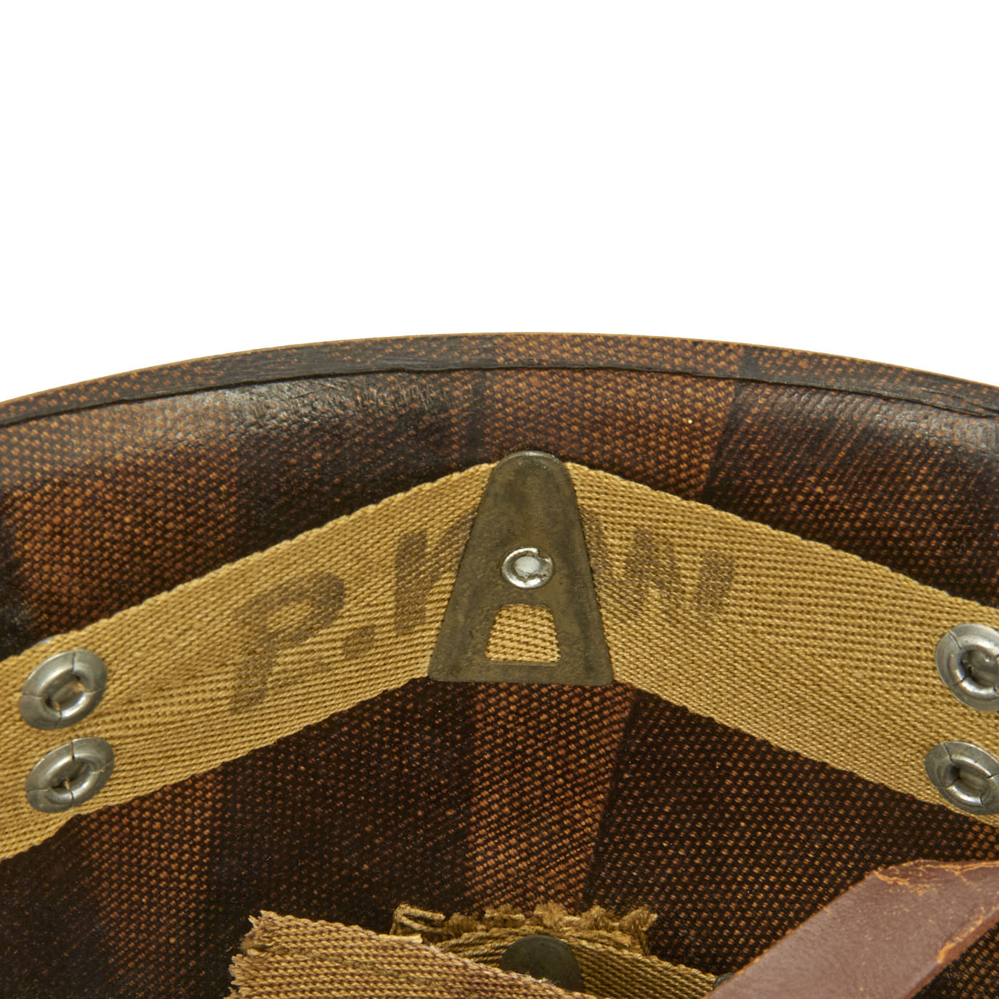 The liner, manufactured in Watertown, Massachusetts, this “high pressure” M-1 helmet liner is identified by an embossed “little man” in a circle in the crown for International Molded Plastics, Inc (IMP) and started delivery to the US Army in September 1942. They produced approximately between 2,000,000 – 4,000,000 M-1 helmet liners and discontinued production around August 17 1945 when the war ended.
