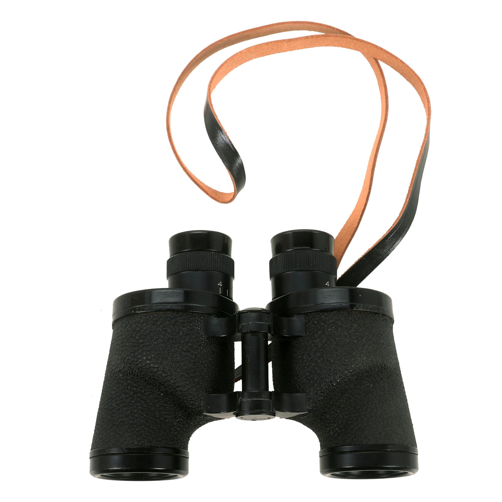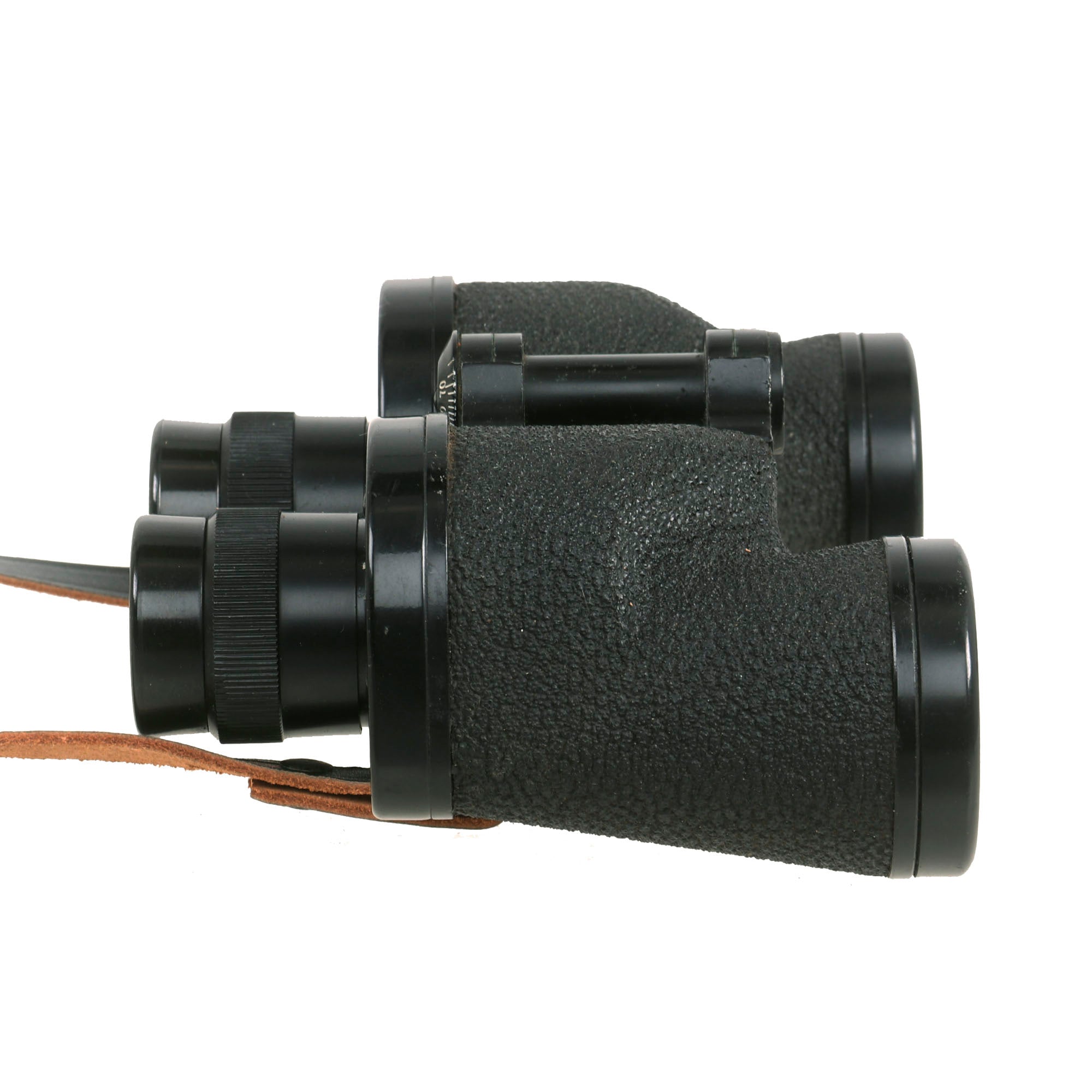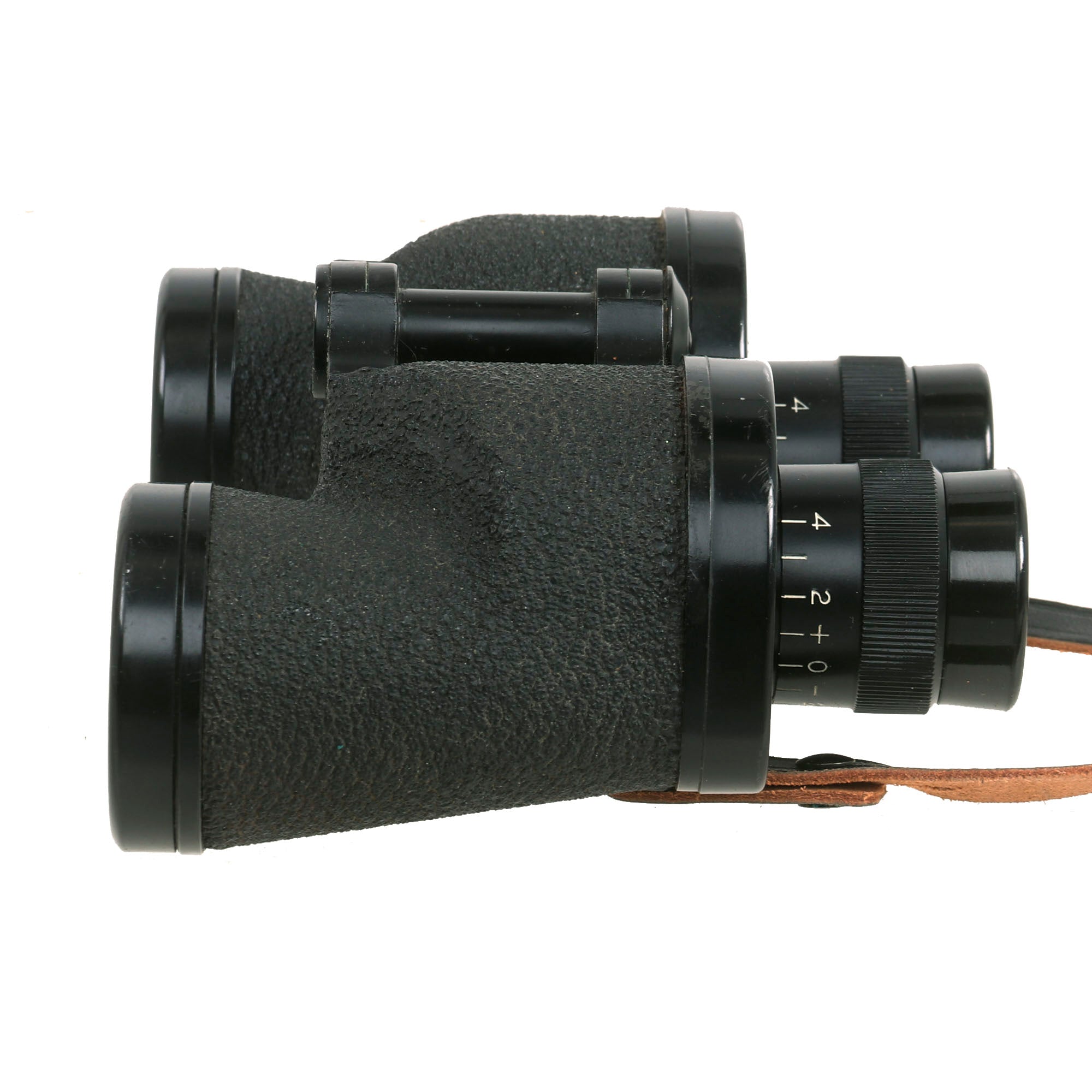 The focus diopters both function and turn easily, and the left side has a nice ranging reticle. The textured covering on the set is in very good condition, with no cracks or chips. The binoculars still have their original leather neck strap. another hard to find item.