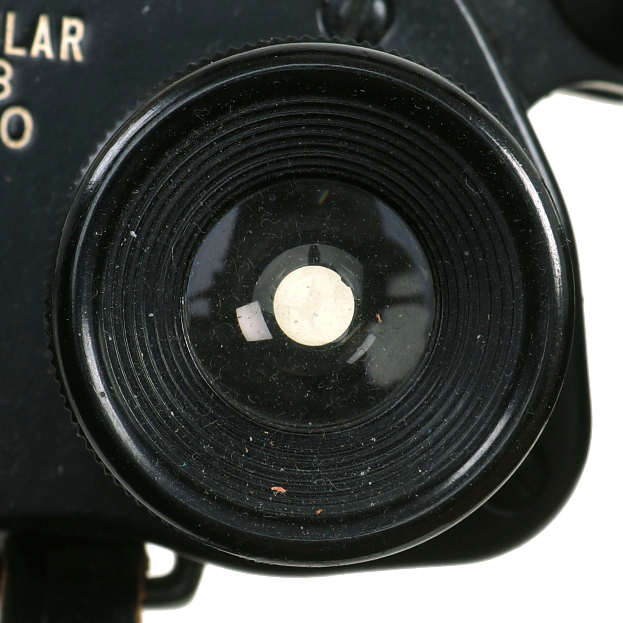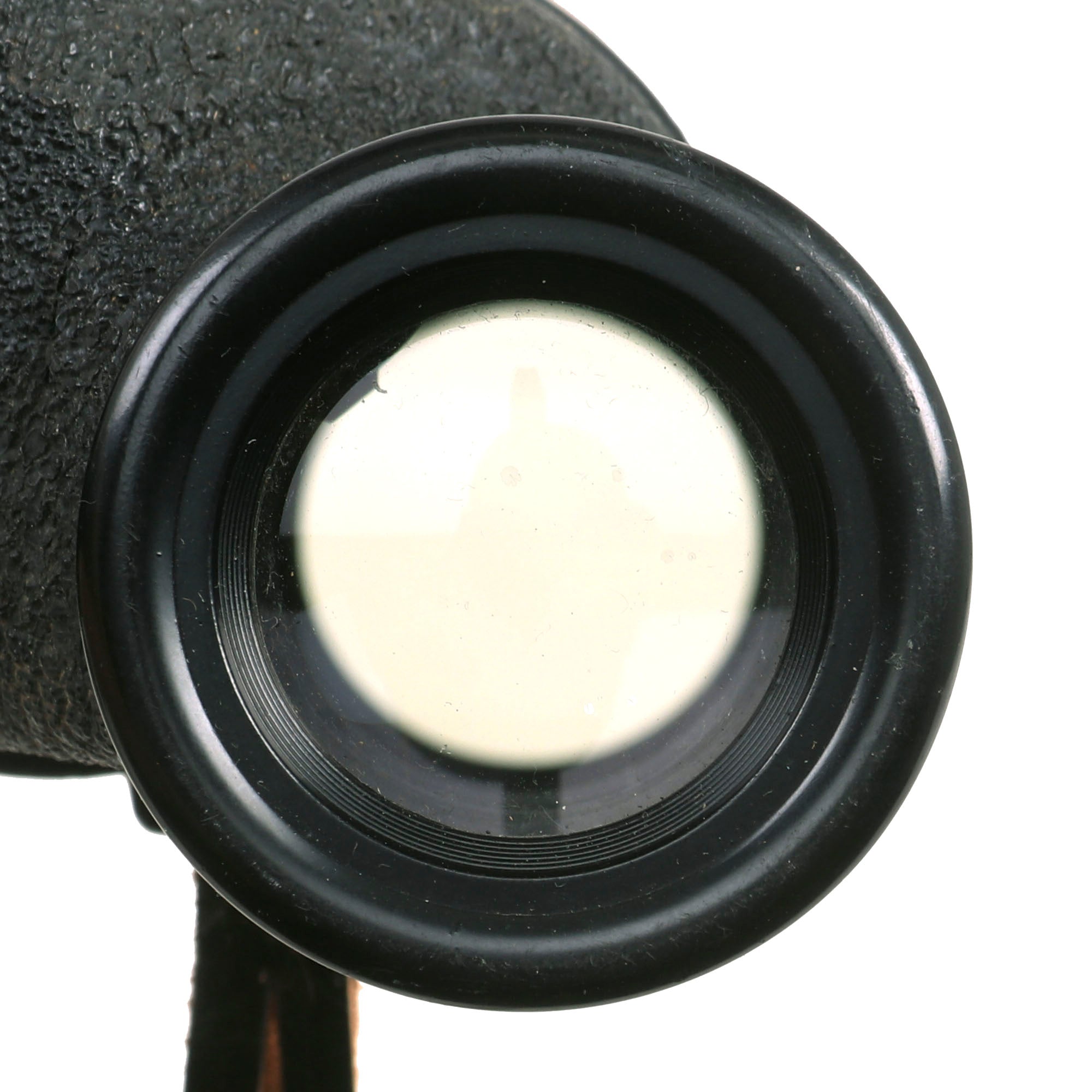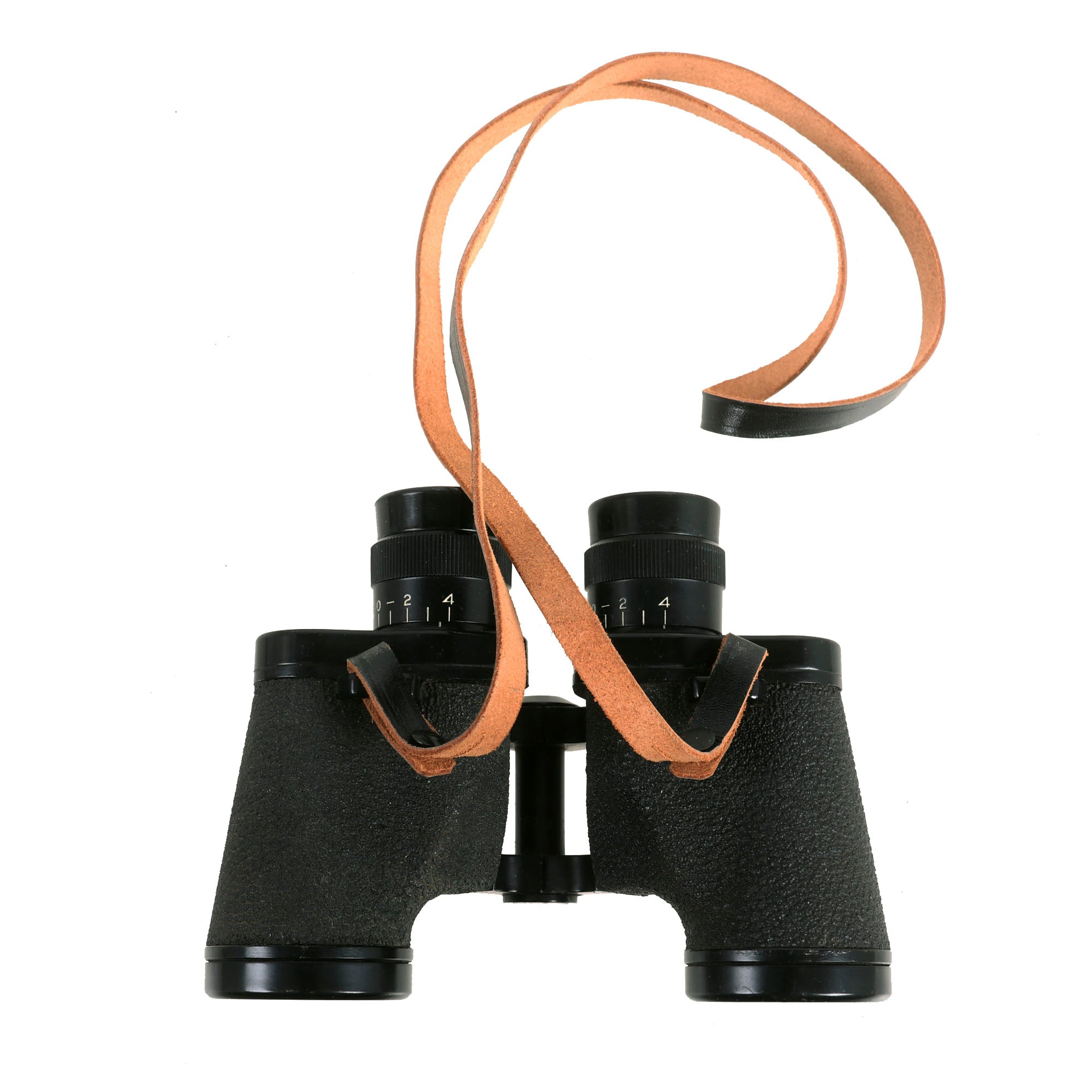 The focus diopters both function and turn easily, and the left side has a nice ranging reticle. The textured covering on the set is in very good condition, with no cracks or chips. The binoculars still have their original leather neck strap. another hard to find item.