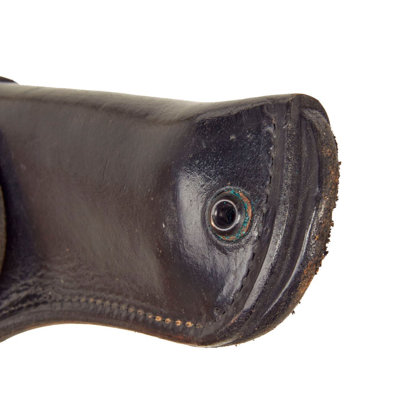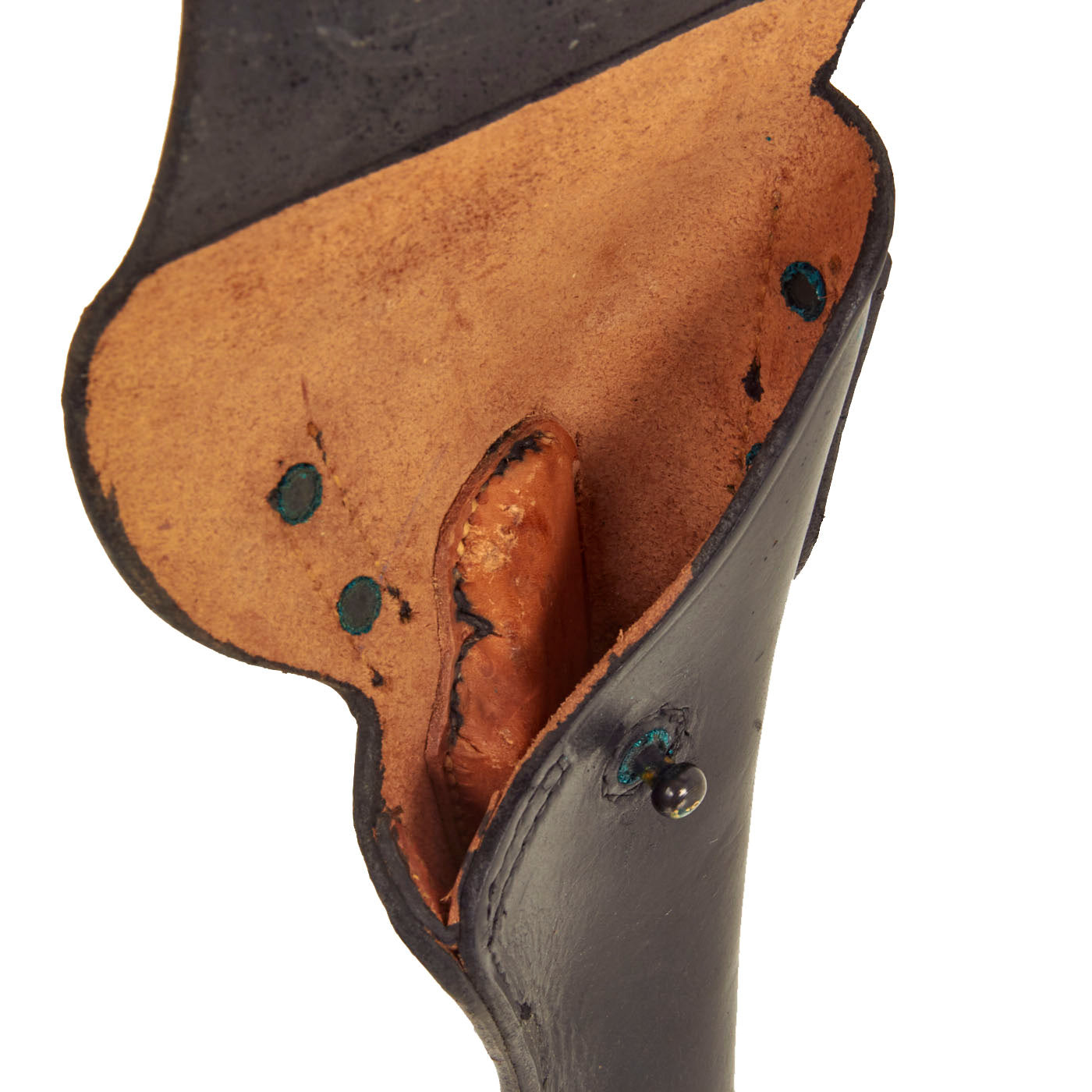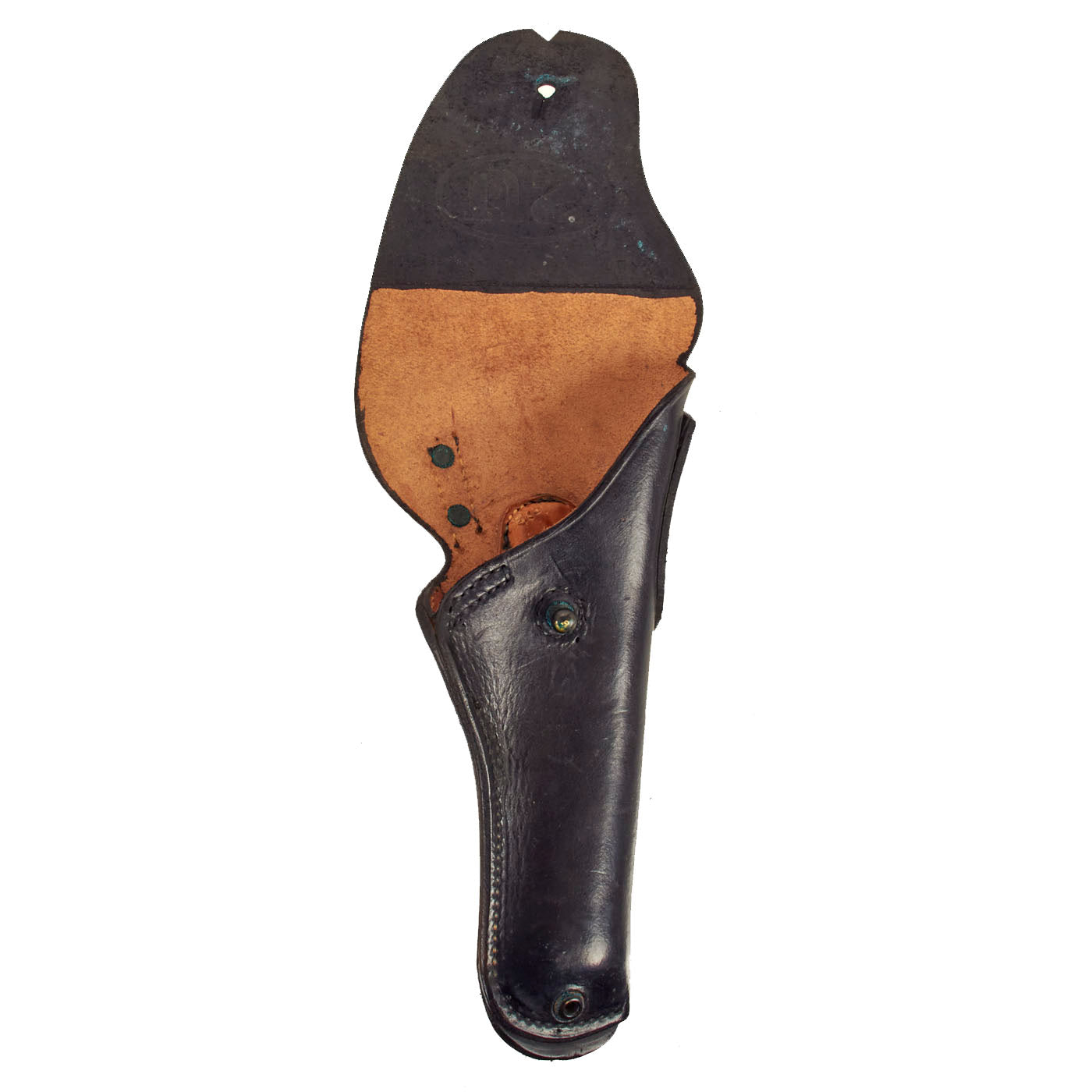 After Korea, about the mid-50's all military leather was made in black. Old stock holsters were dyed black, as above, often only on the front sides.