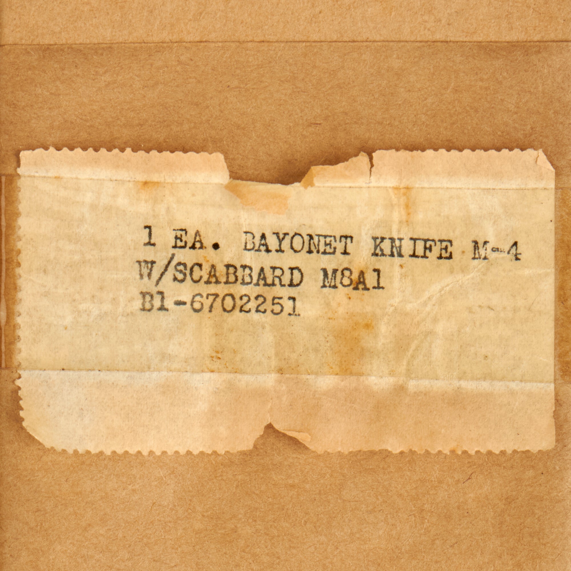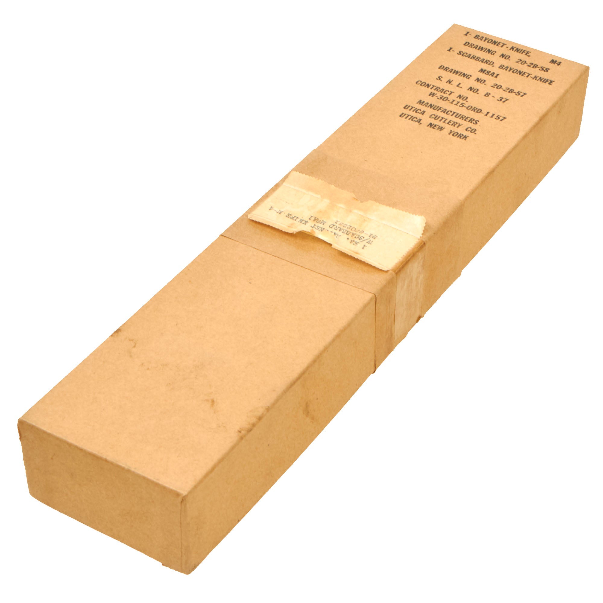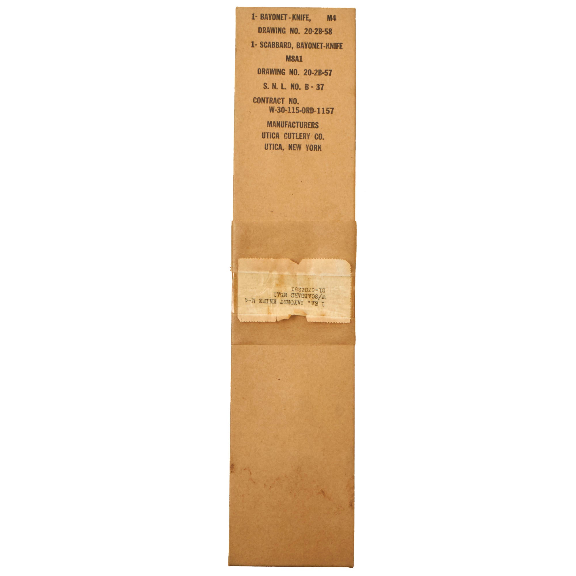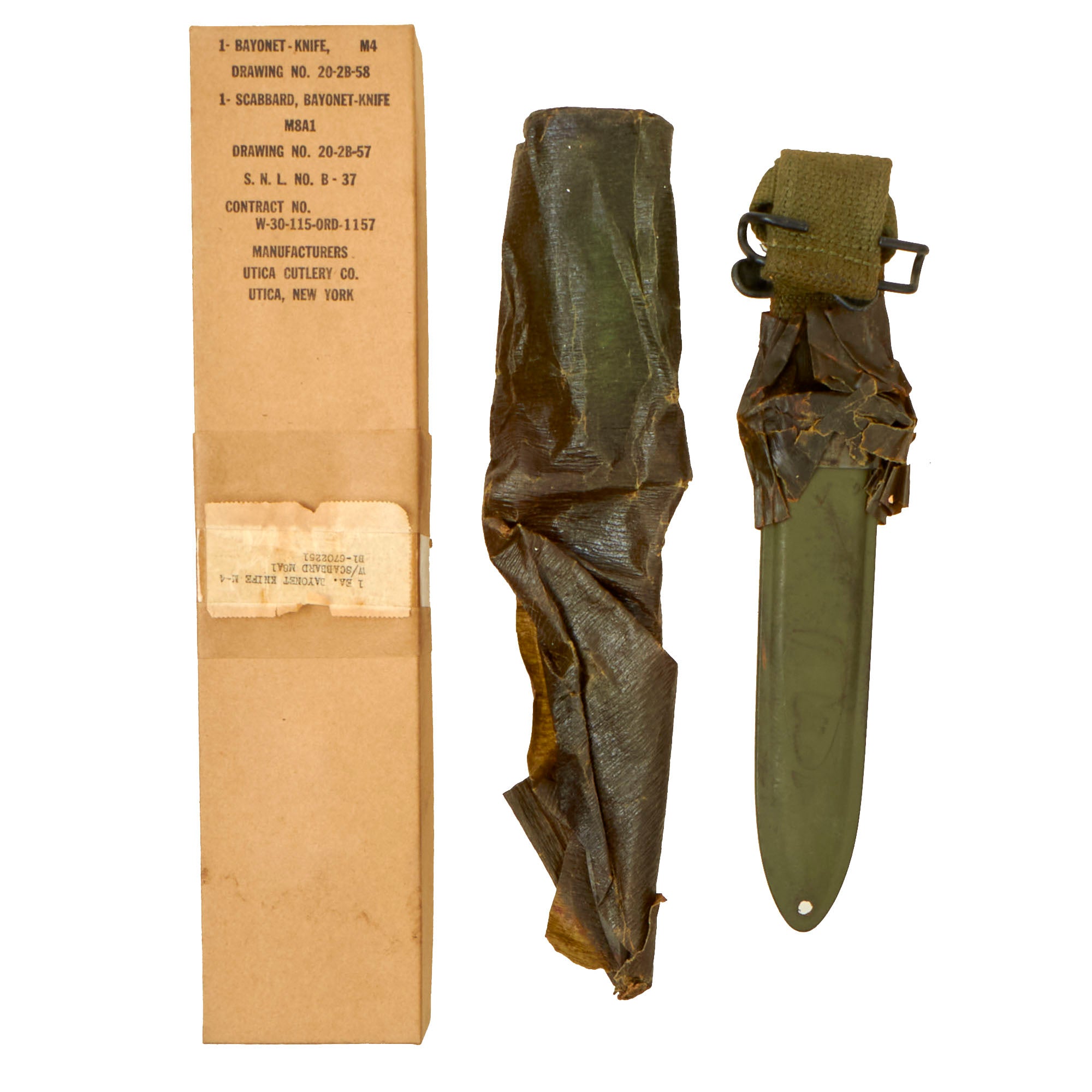 Original Item: Only One Available. This is a very nice unissued WWII U.S. Army M4 Carbine bayonet fighting knife, with an original M8A1 scabbard in the original box, with the original greasy paper wrapped around the blade and part of the scabbard. Nicely marked U.S. M4 / UTICA on the blade side of hand guard for the Utica Cutlery Co., next to the U.S. Ordnance "Flaming Bomb". The blade is in great condition, and was not used during the war, spending its life in this box. The crossguard, handle, and pommel are all tight to the blade.