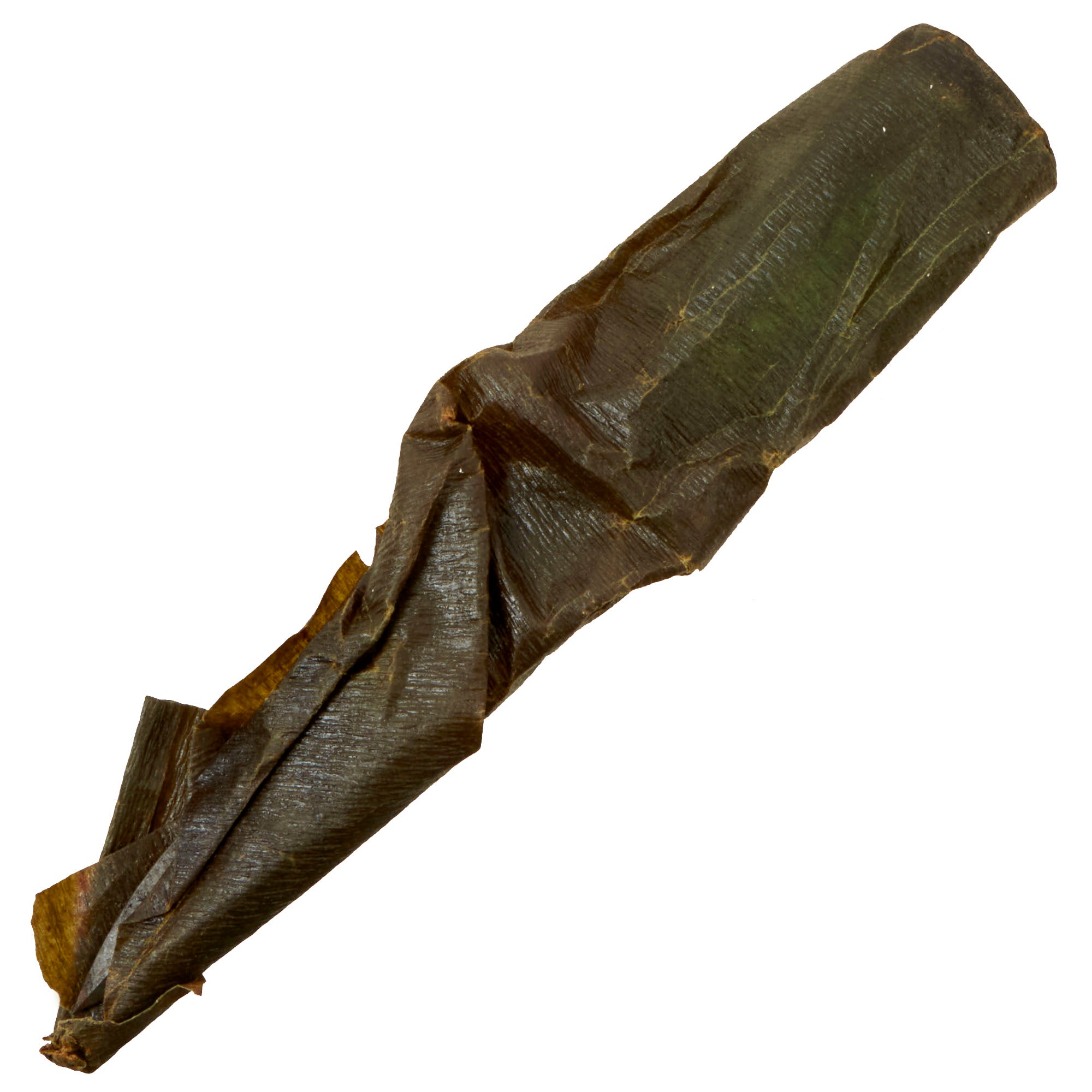 The bayonet still has the original WWII issue leather washer grip, with a bit of discoloration towards the pommel. These have not been changed out, and the leather in the grip shows only light wear, and just a bit of rounding. The pommel is held on by the correct peened over tang, which with the flaming bomb proves this is definitely a WWII example, and not a later reissue. There is a heavy amount of grease still on the bayonet.