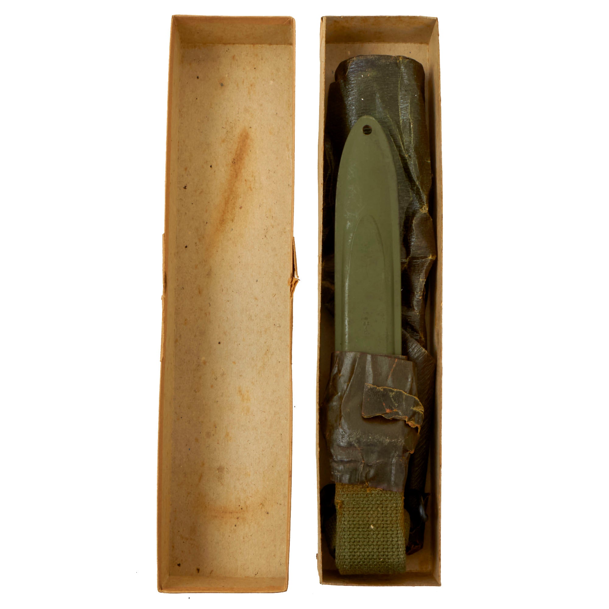 It comes in a nice WWII issue OD green thermoplastic impregnated cotton fabric scabbard which is made by B.M. CO. as is marked. The scabbard is also offered in very good unissued condition. The throat shows light wear to the finish, as shown. The canvas is in very good condition, and the snap still functions. The metal fittings have some minor oxidation. The OD Green #7 color and lack of a bottom reinforcement indicates late WWII manufacture. The scabbard was manufactured by Beckwith Mfg Co., a division of Victory Plastics.