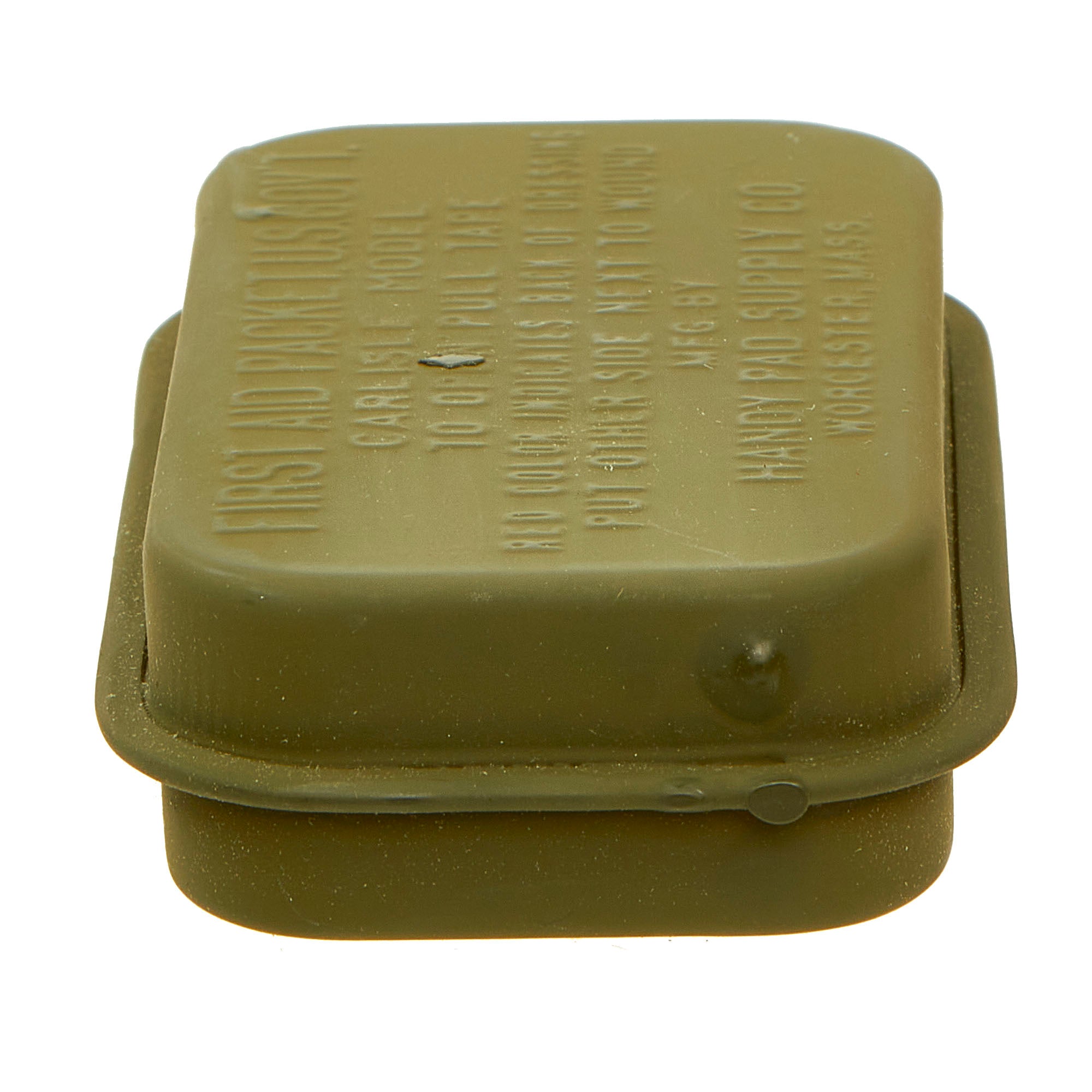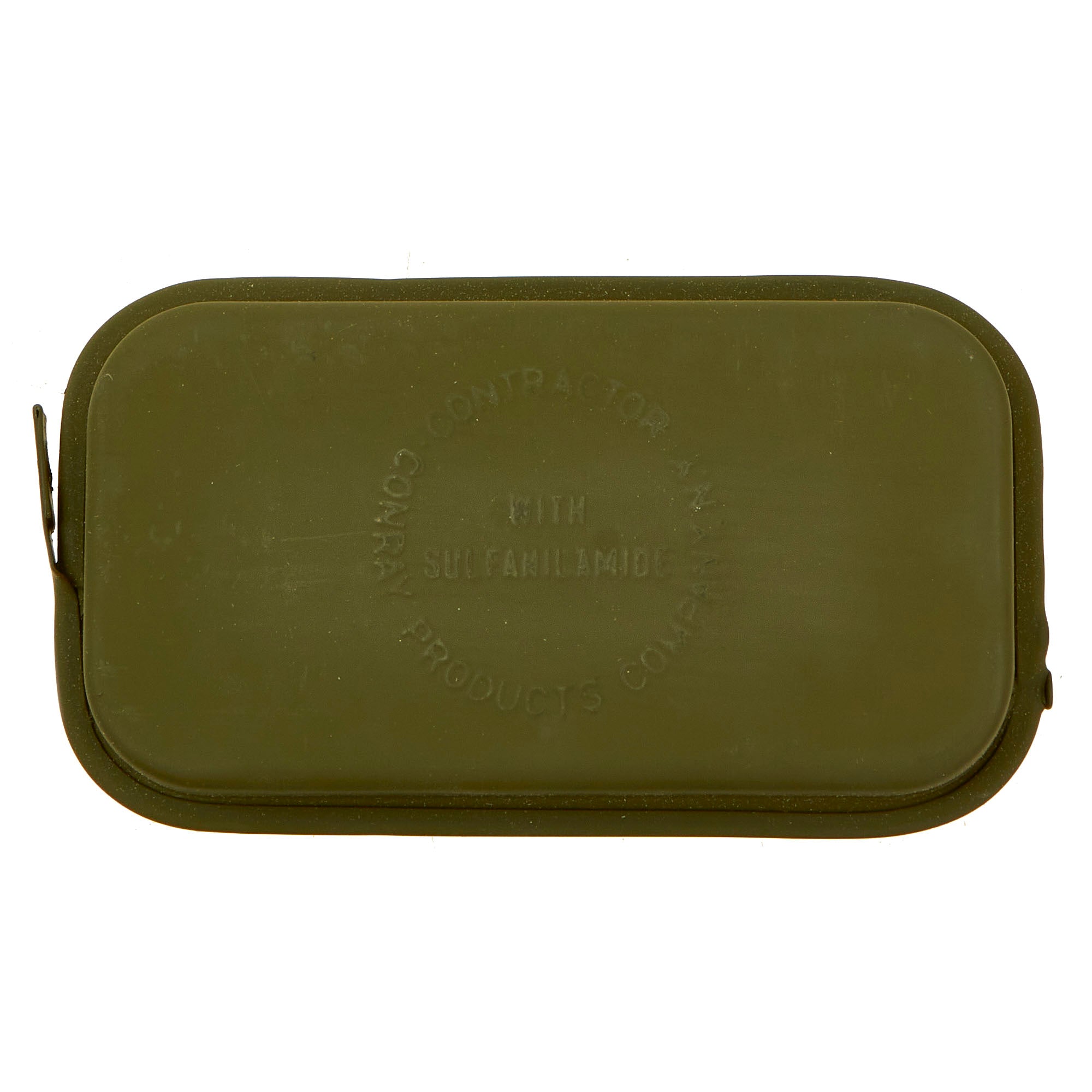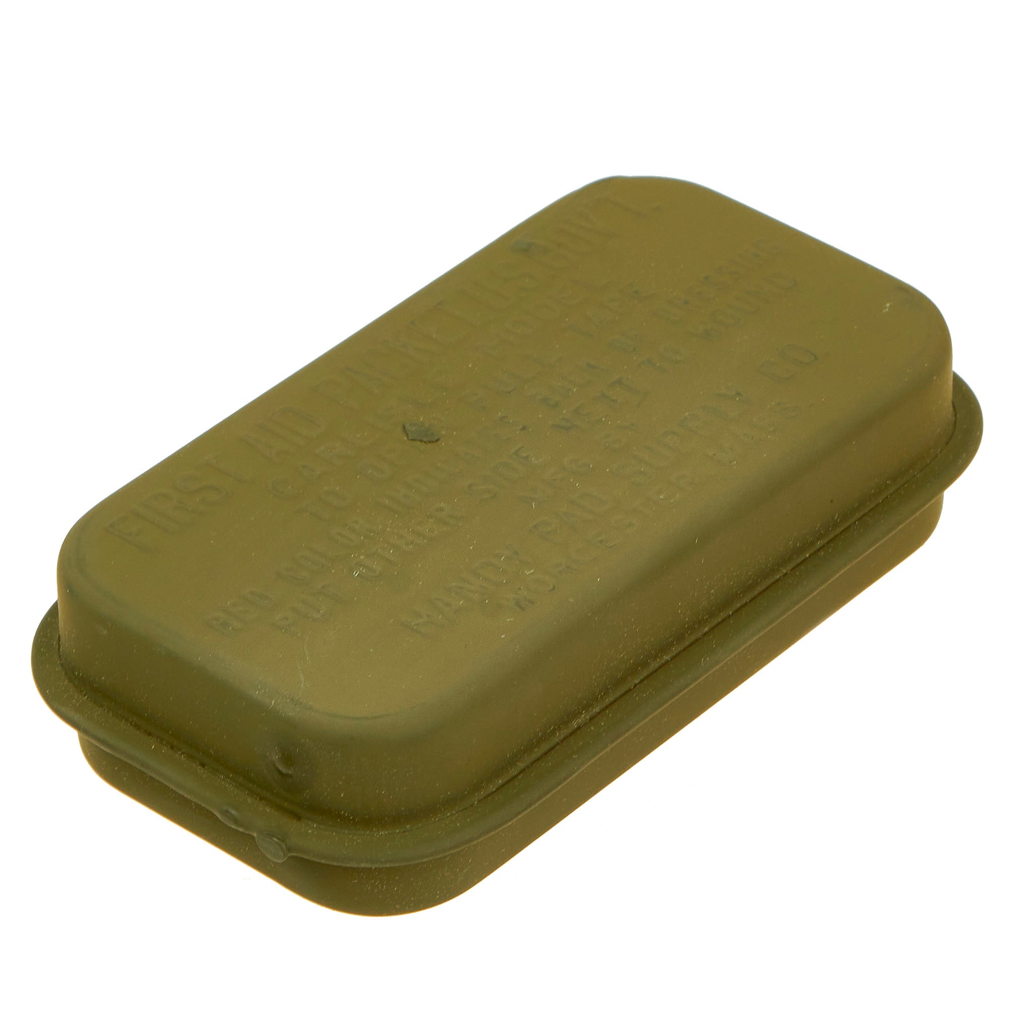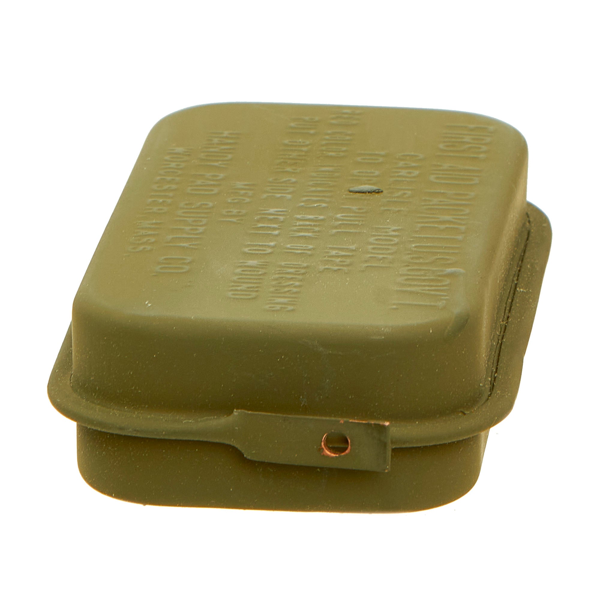 Very early examples of the Carlisle Bandage tin were issued in sealed, pressed brass, rectangular containers (cover, box, and seal), once again designed to ensure the sterility of the bandage contained within. These early examples of the First-Aid Packets did not yet contain a Sulfanilamide Shaker Envelope (only introduced by end of 1941), and were painted using an Olive Drab #7 color shade. Containers manufactured by the Medical Department workshops did not bear the Department’s markings, while those supplied by Bauer & Black of Chicago, displayed the manufacturer’s name. More manufacturers would receive Government contracts.