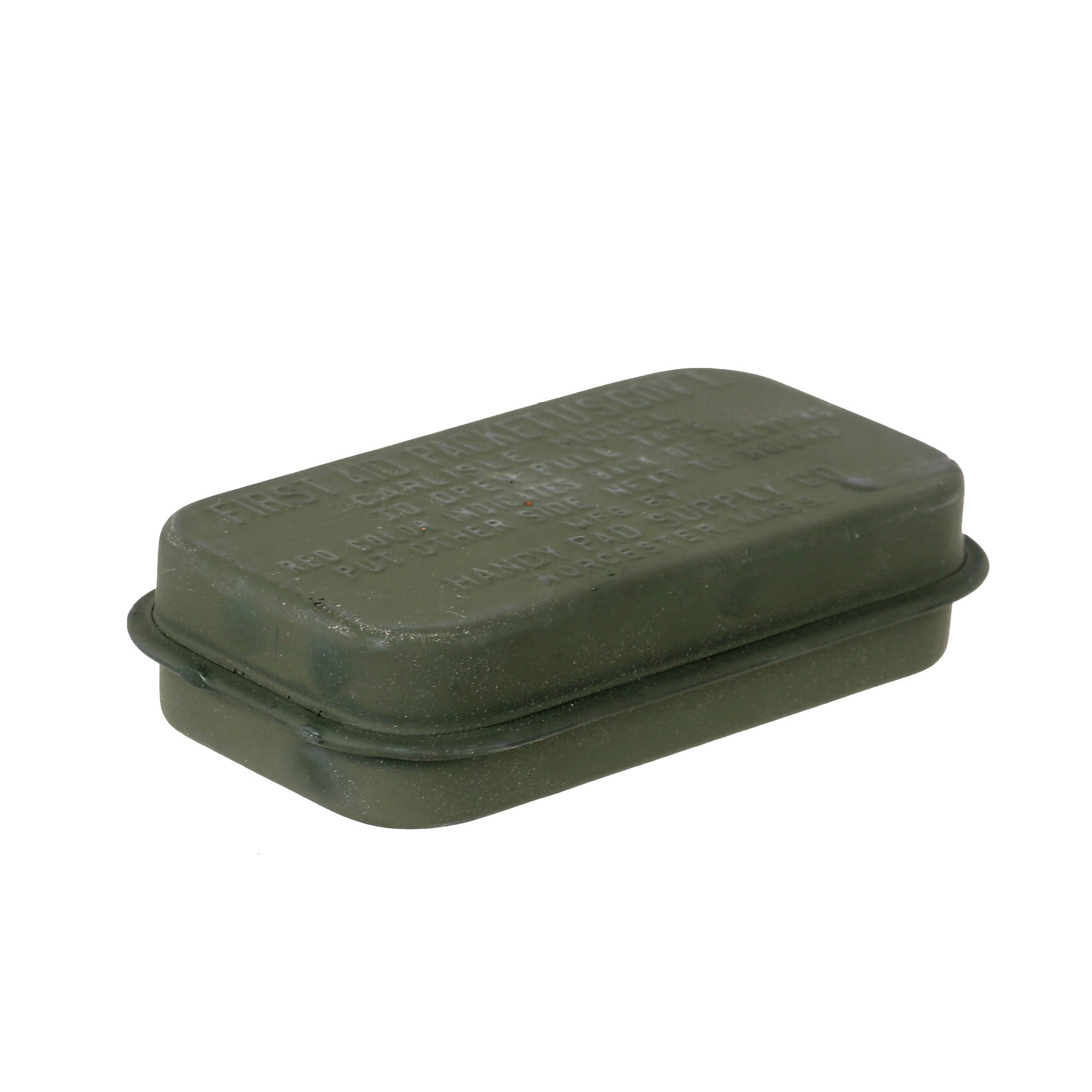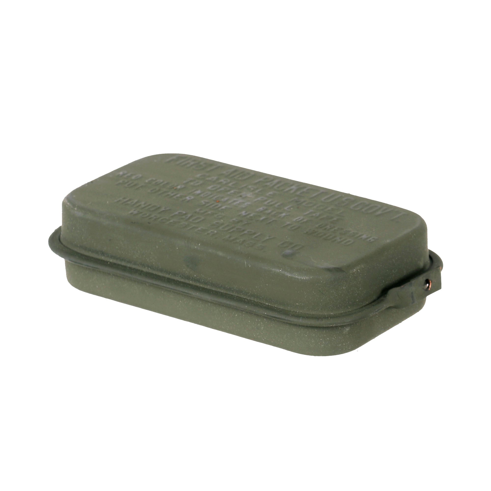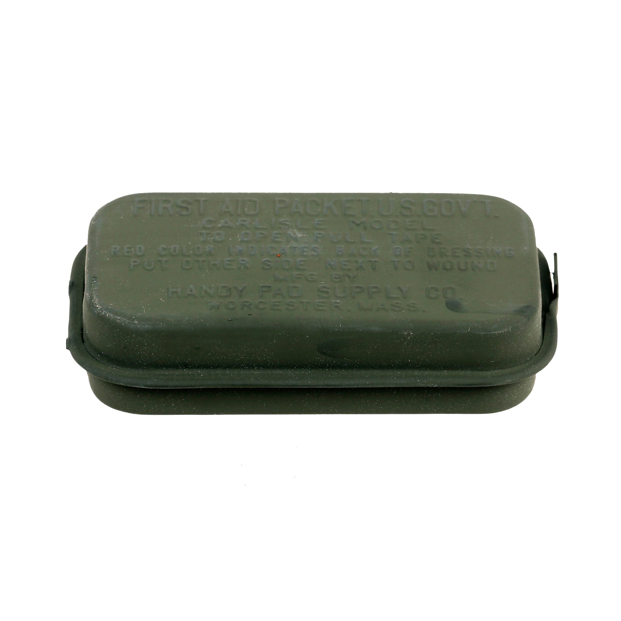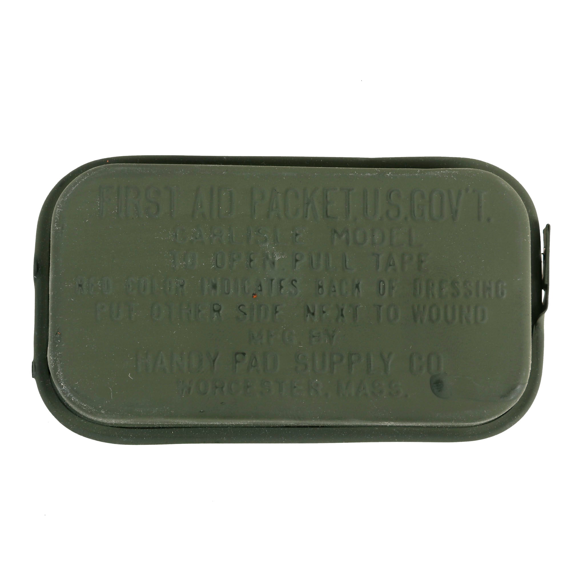 Following the Great War, millions of First-Aid Packet – U.S. Army (manufactured by Bauer & Black, Chicago, U.S.A.) containing small sterile dressings and carried by each soldier in a pouch attached to his pistol or cartridge belt, were still available packed and sealed in their little brass Olive-Drab container. Notwithstanding the general policy to utilize existing stocks first, the Medical Equipment Laboratory (part of the Medical Field Service School, Carlisle Barracks, Pennsylvania) started investigating methods to improve existing medical equipment and explore the possibility of introducing new products. Studies were started in 1922 which would ultimately lead to a new First-Aid Packet, U.S. Government, Carlisle Model (new metal container with improved contents). The 1927 Depression and budget restrictions would however hold up manufacture, although its characteristics were widely known to the US Army authorities, with the ‘new’ item being designated First-Aid Packet, New Style.
