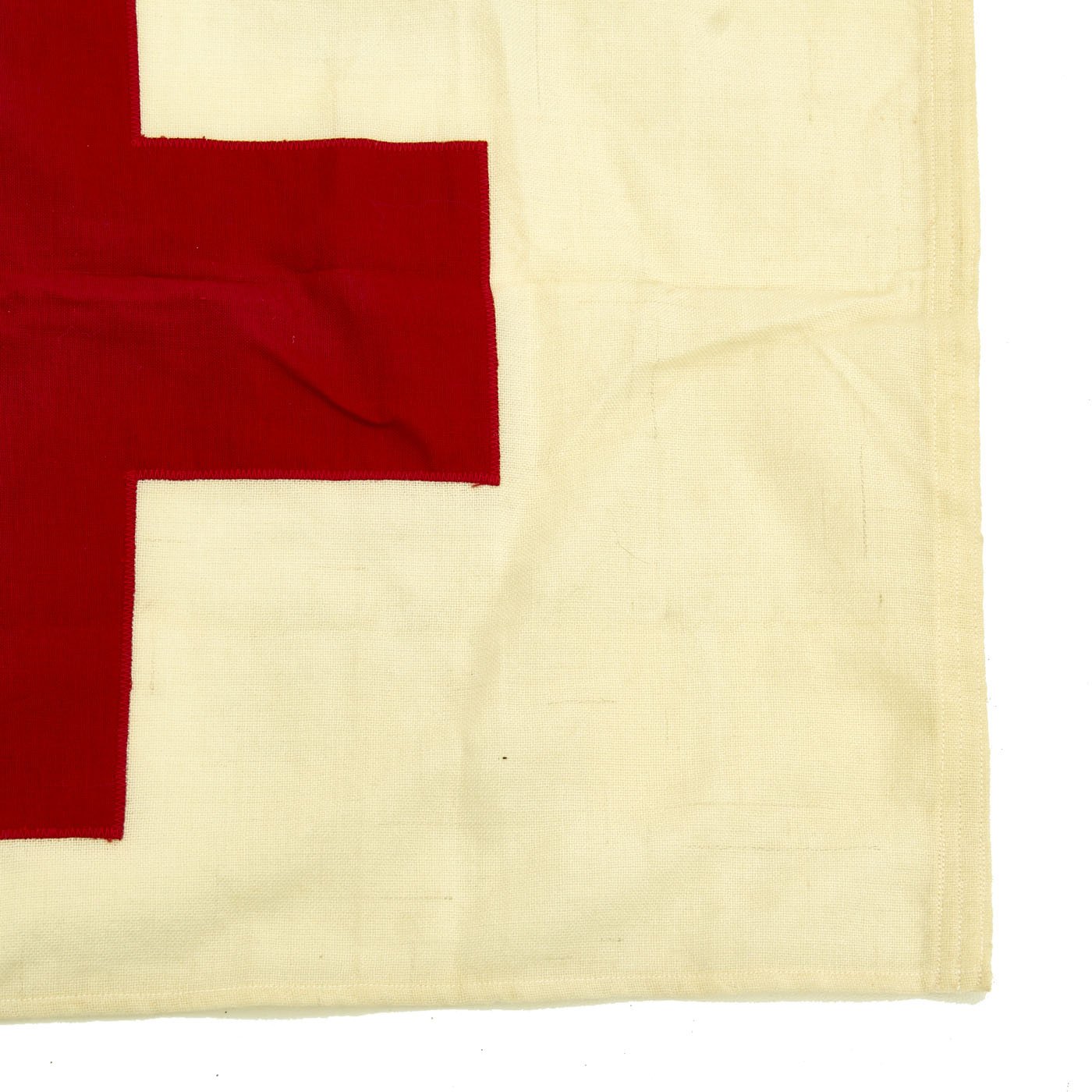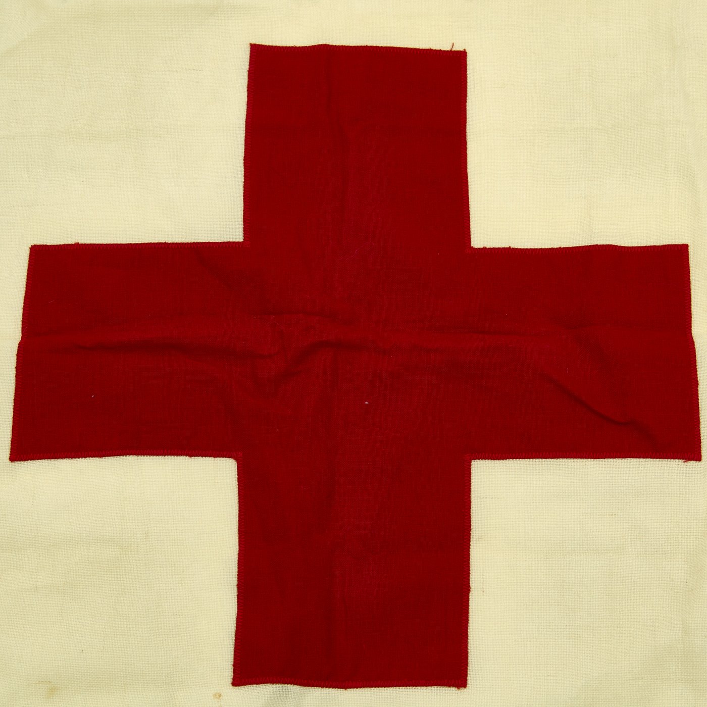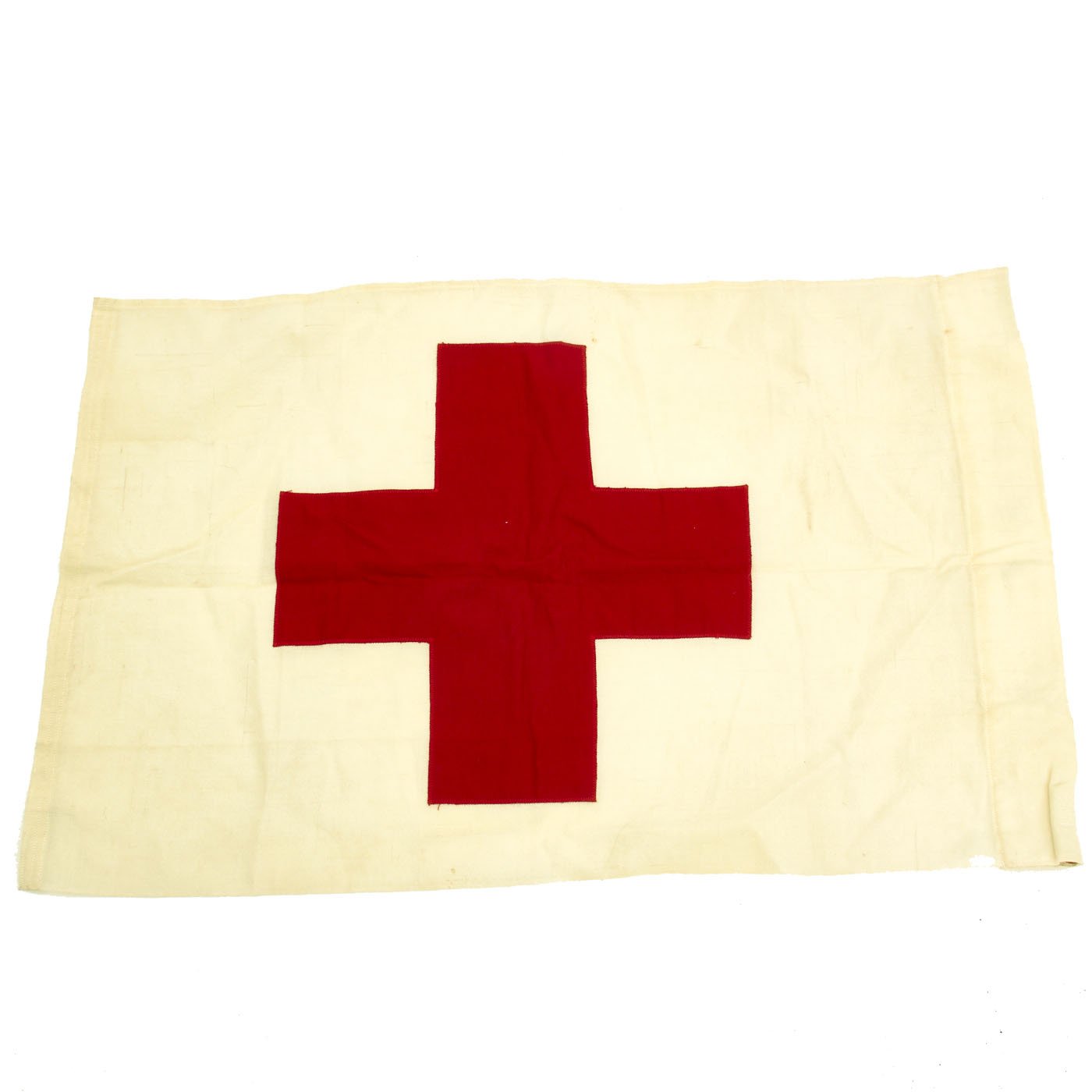Original Item: Only One Available. This is an excellent unissued example of a U.S. WWII Issue Medic "Red Cross" flag. The flag is constructed of wool cloth and measures approximately 18 x 28 inches, with a large "Red Cross" in the center. It is multi-piece construction, made from a single piece of white wool with cotton red crosses sewn onto each side. The header is a sleeve with two leather attachment tabs sewn inside. It also has the manufacturer information stamped inside: