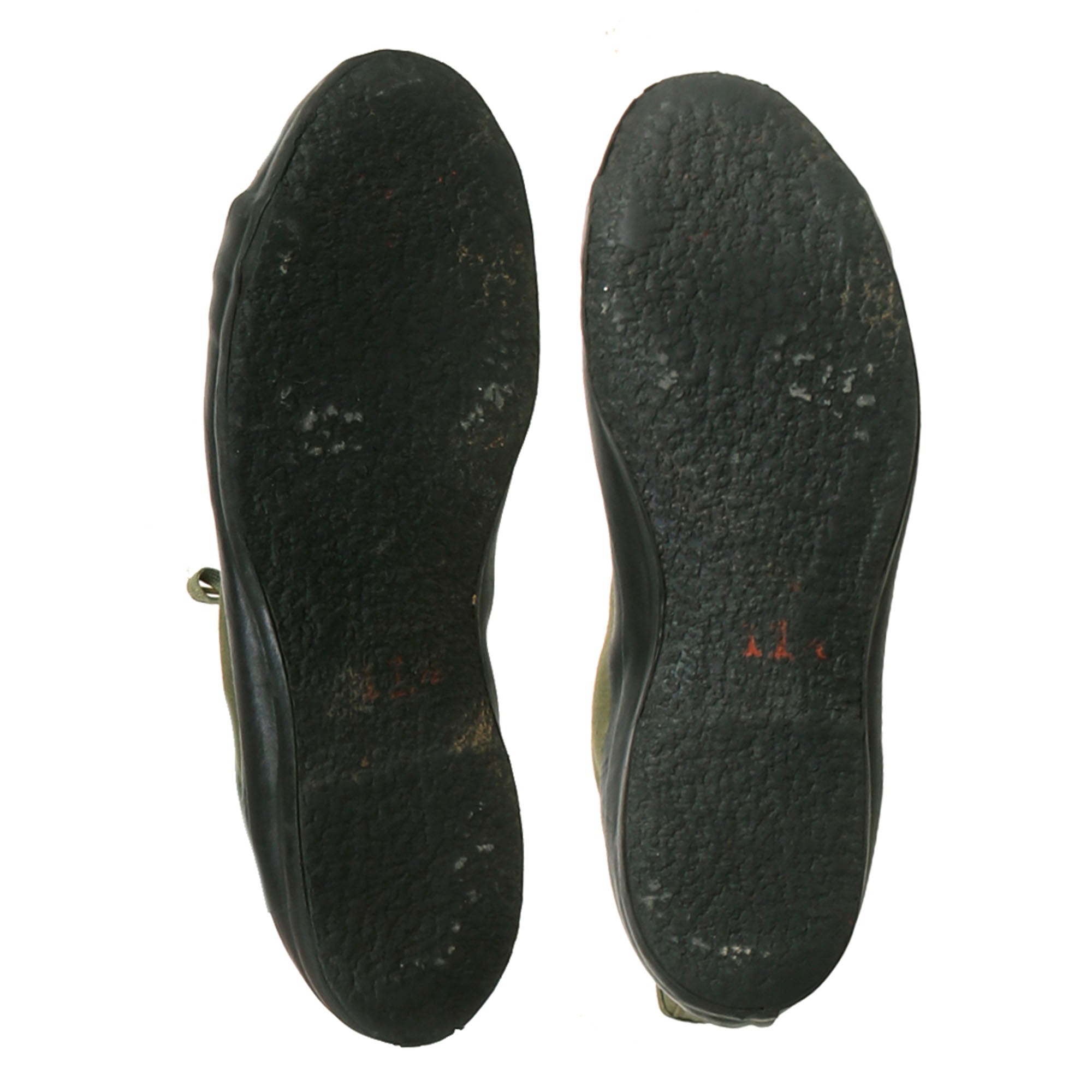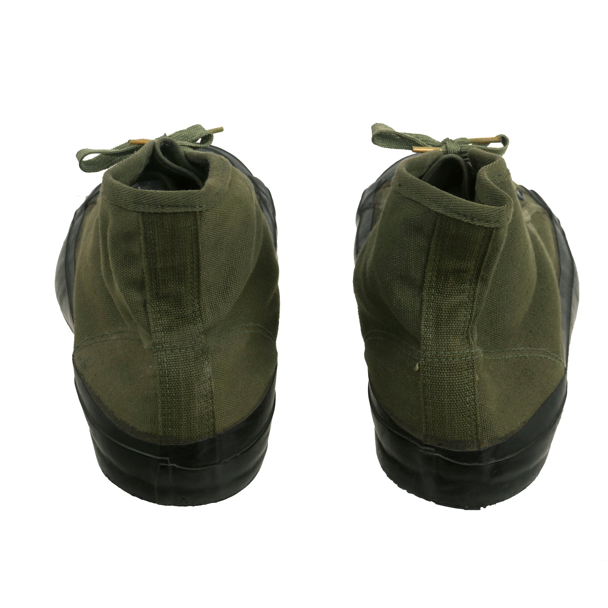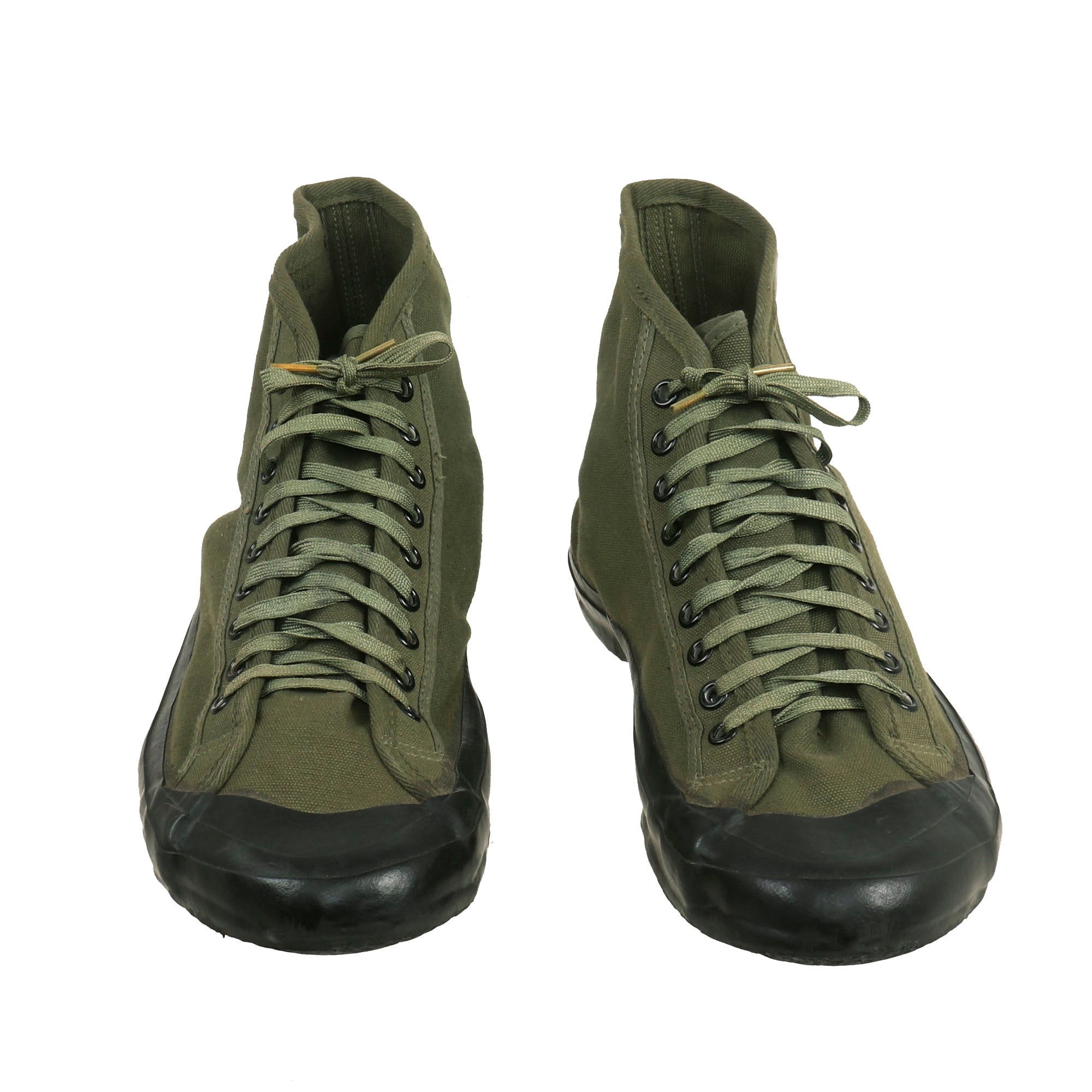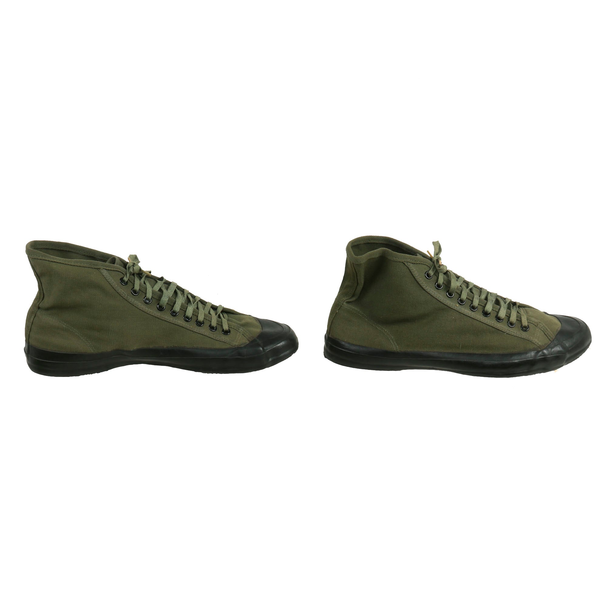 Original Item: Only One Pair Available. This is a wonderful pair of unissued/new old stock “Jungle Sneakers”, as worn by US Marines in the Pacific Theater of War. Speaking from personal experience in a Japanese jungle (Paddy, USMC), the wearing of Converse style sneakers in a jungle environment made movements “ghostly”. These are very lightweight canvas shoes and are surprisingly quiet when moving through the brush, so why wouldn’t you want to wear them in a combat zone? Another great thing about these shoes is that being made of breathable canvas, the operators wearing them would find themselves in wet environments, but due to the material they dried out quicker than the regular issued boots, prolonging the life of their feet.