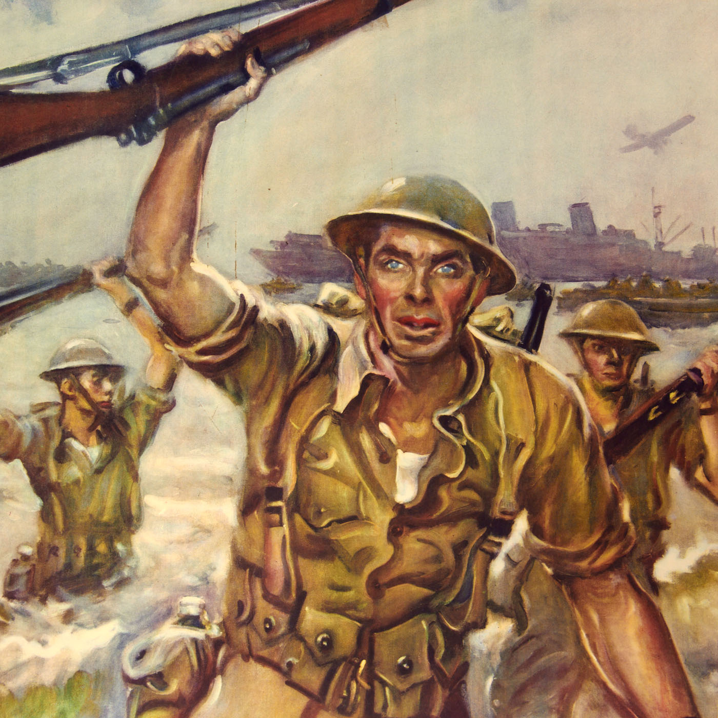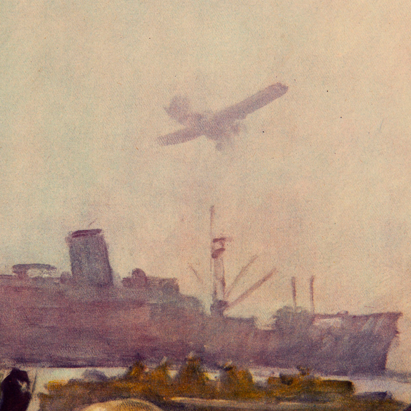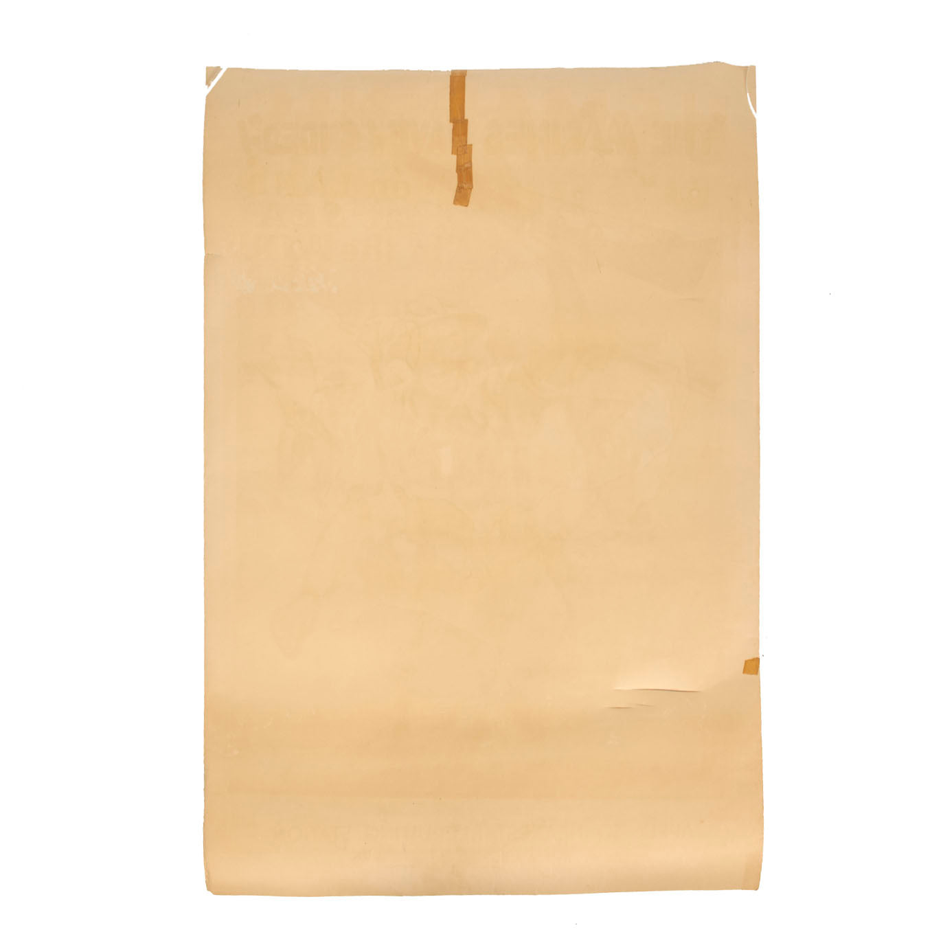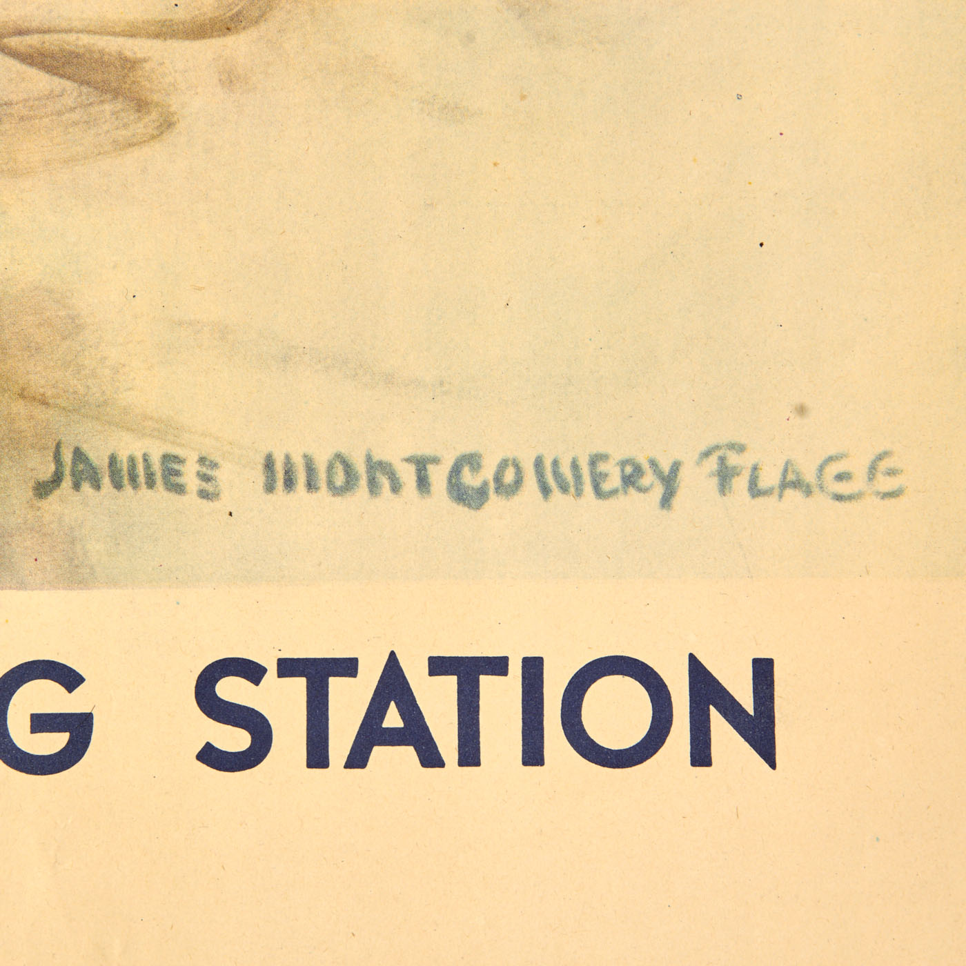 This poster by James Montgomery Flagg features US Marines wading ashore with rifles raised while troop carriers and ships are in the background on the water. This is one of the most iconic USMC recruitment posters that has been produced! The condition and colors are excellent with minor wear to the edges and slight tearing in the outer border. A mat and frame would cover up the wear and bring this poster back to life!