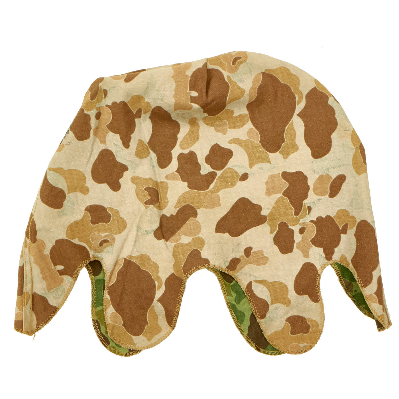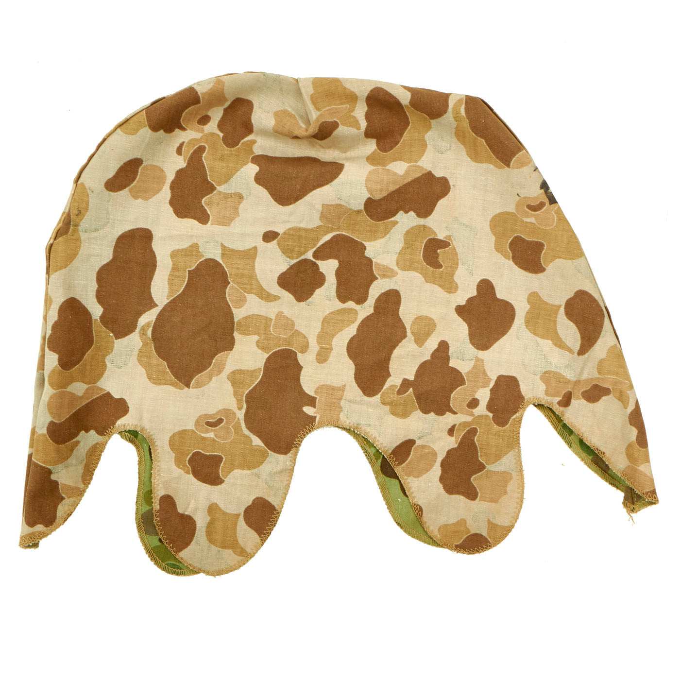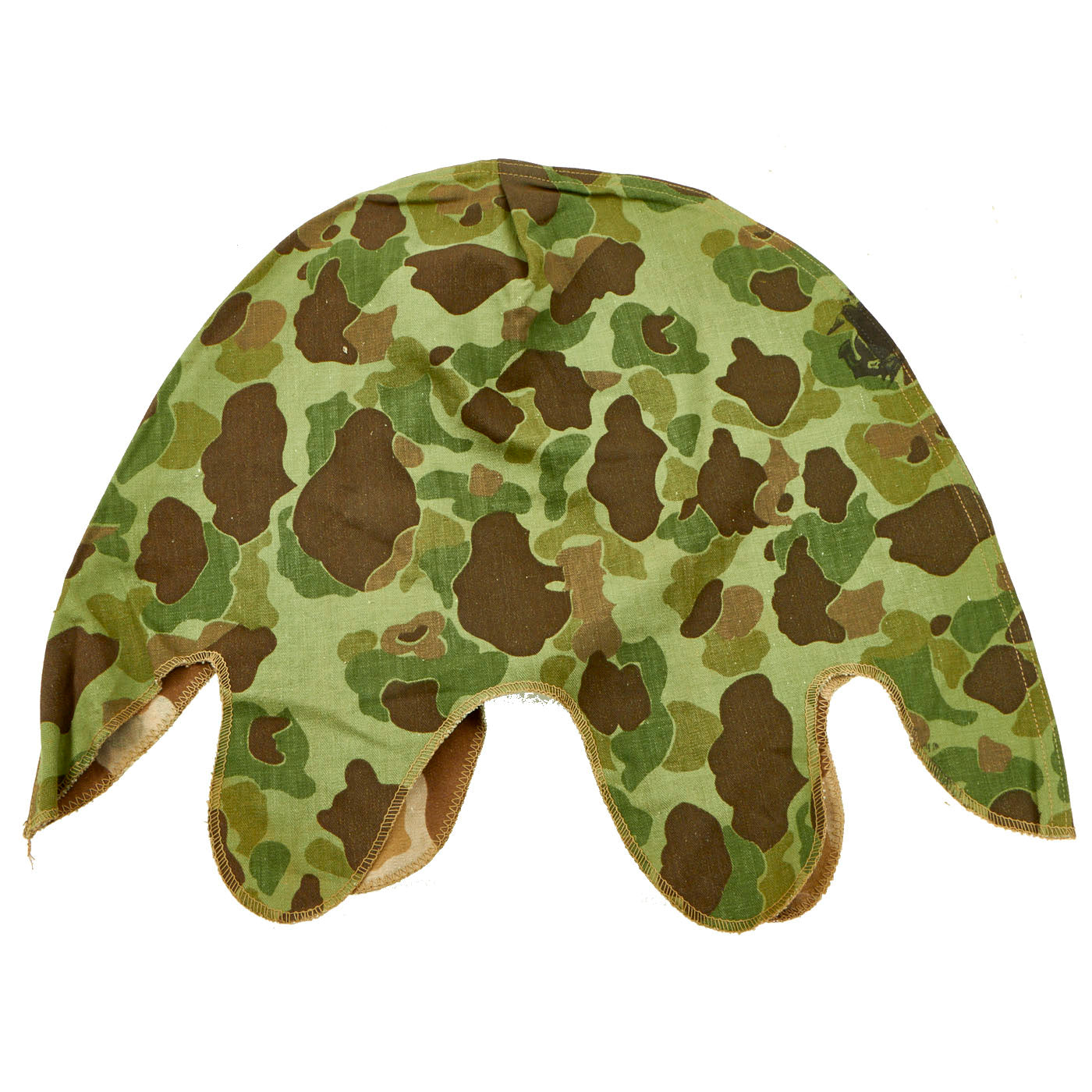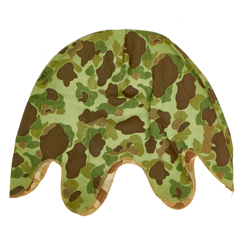 Original Item: Only One Available. Now this is a rare opportunity to add a beautiful mint condition USMC HBT 1st Pattern helmet cover to your collection. This was a late war produced cover and is without the foliage slits as well as buttonholes on the fingers. Both sides have clear EGA stamps.